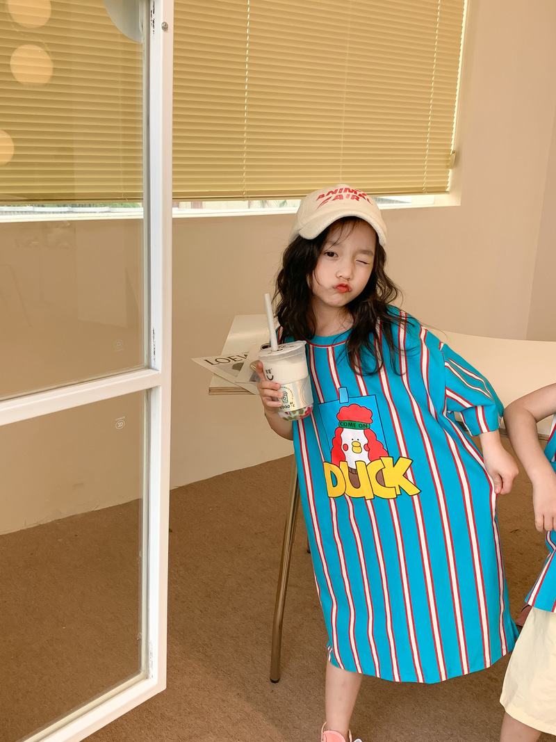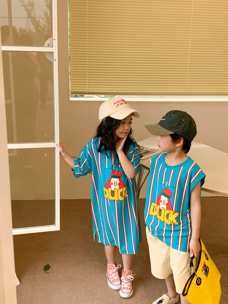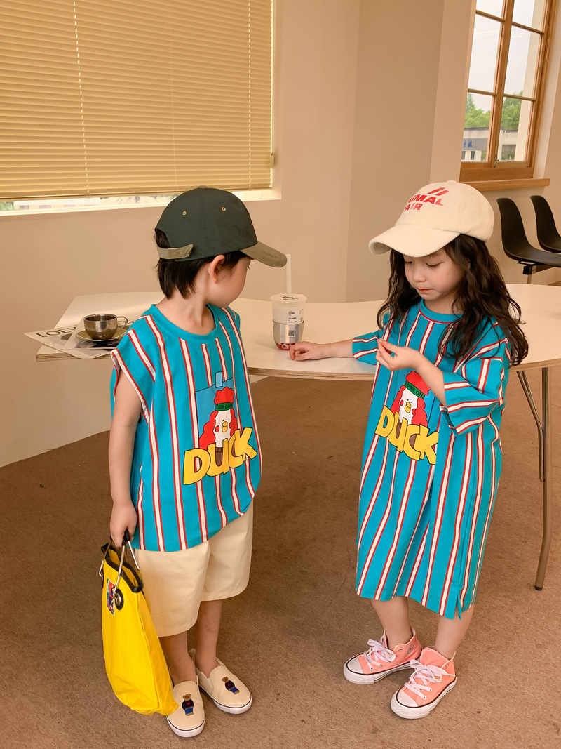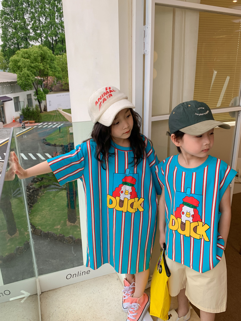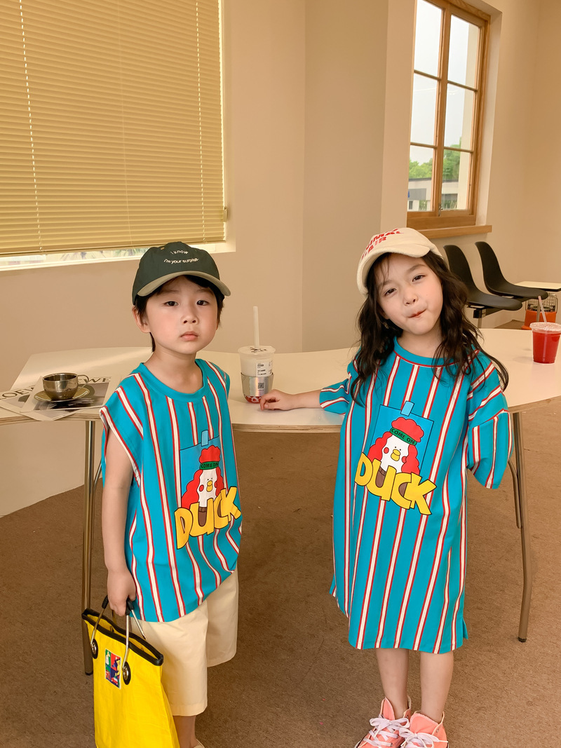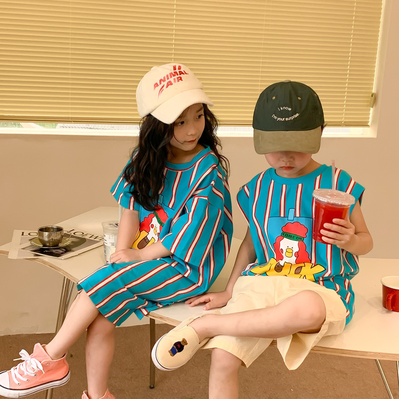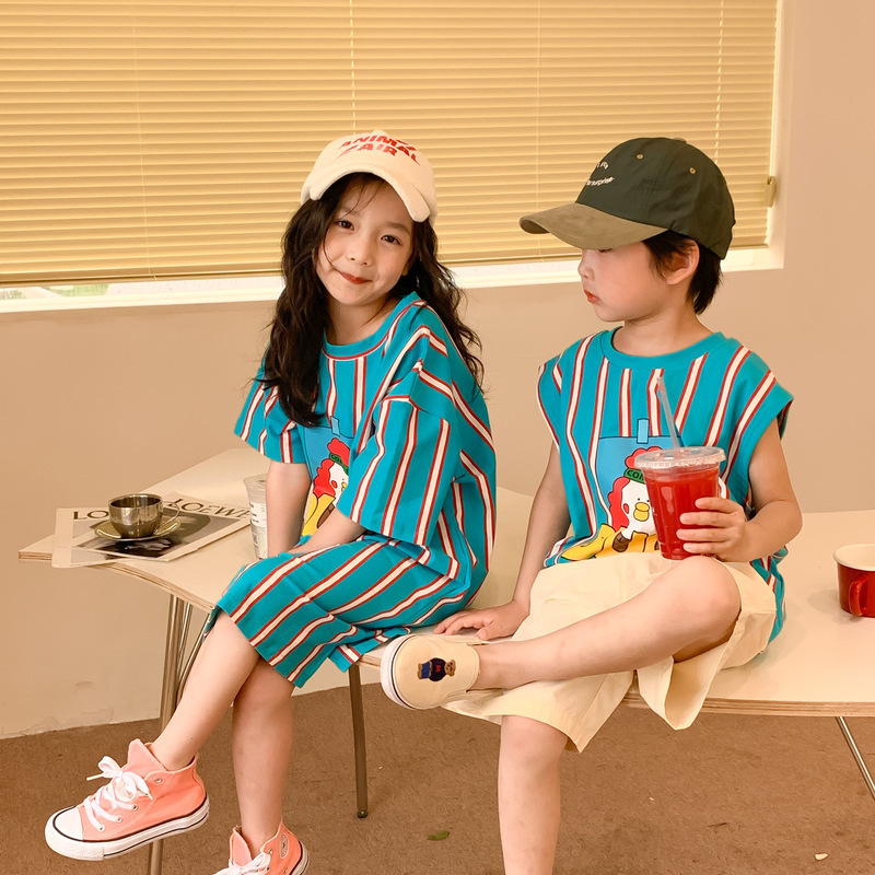 어린이 티셔츠 2025 여름 스타일 소년과 소녀 한국어 버전 만화 프린트 티셔츠 어린이 캐주얼 조끼 드레스 형제와 자매 의상