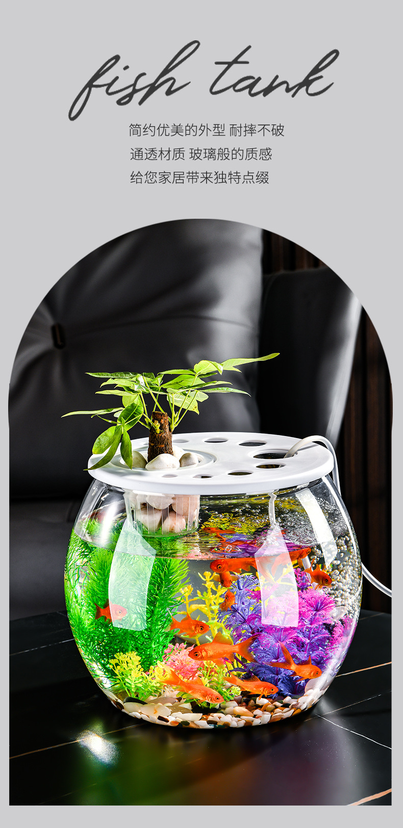 뚜껑이 있는 둥근 플라스틱 작은 어항, 가정 거실용 투명, 소형 데스크탑 투명 생태 탱크, 마이크로 조경 수족관