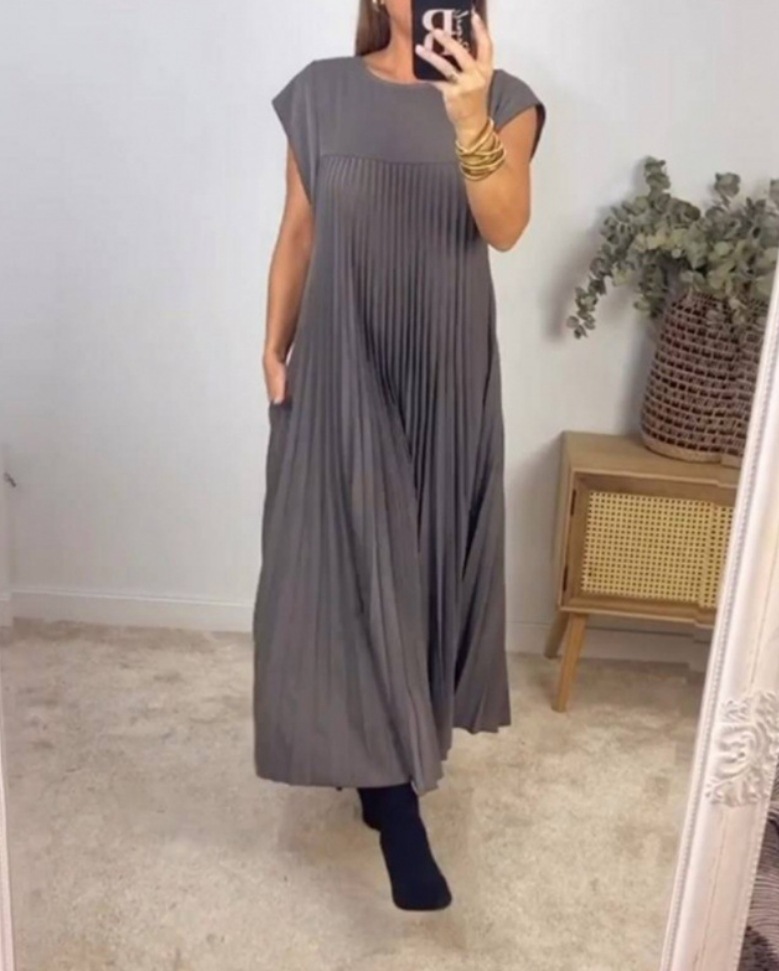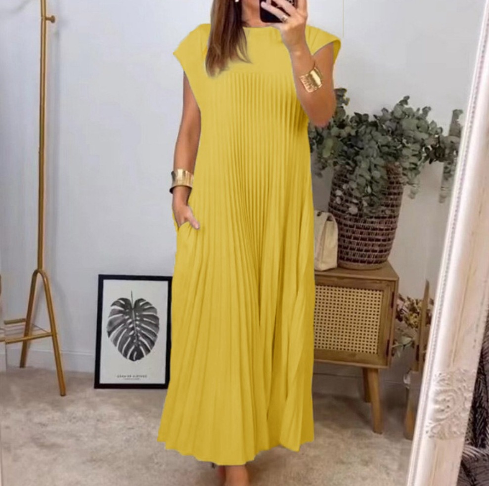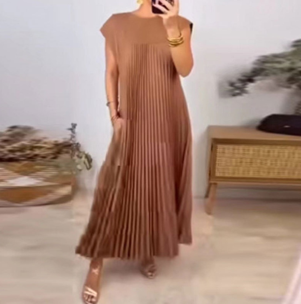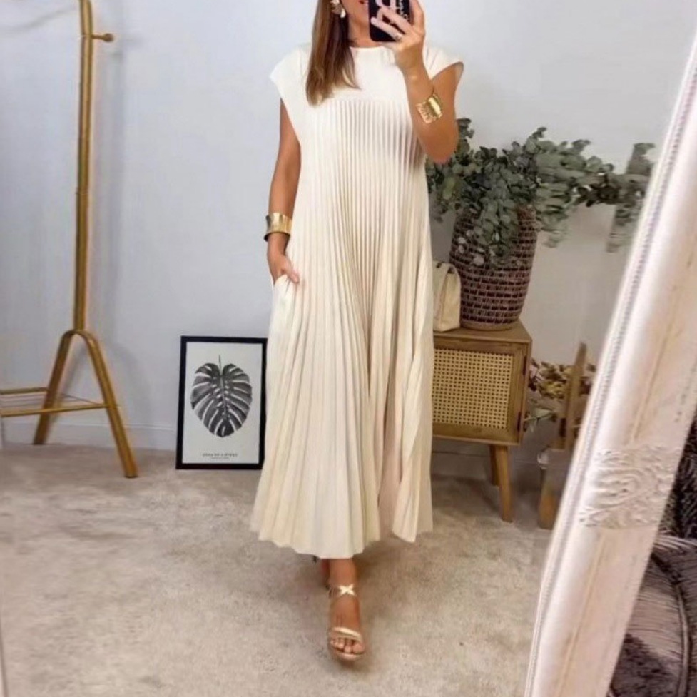 2024 가을 드레스 새로운 국경 간 유럽과 미국의 의류 우아하고 세련된 라운드 넥 민소매 주름 긴 드레스스토어 가기