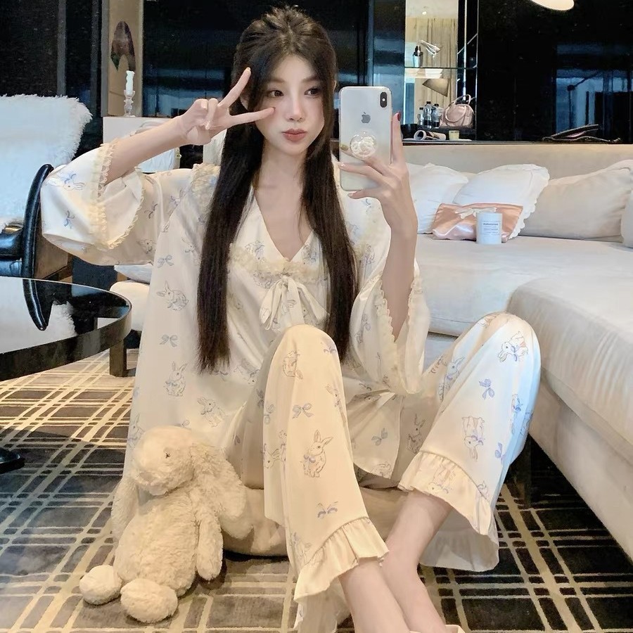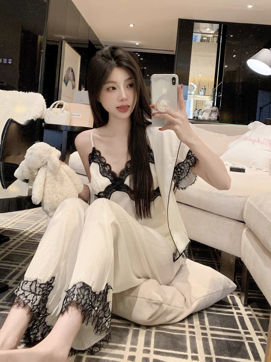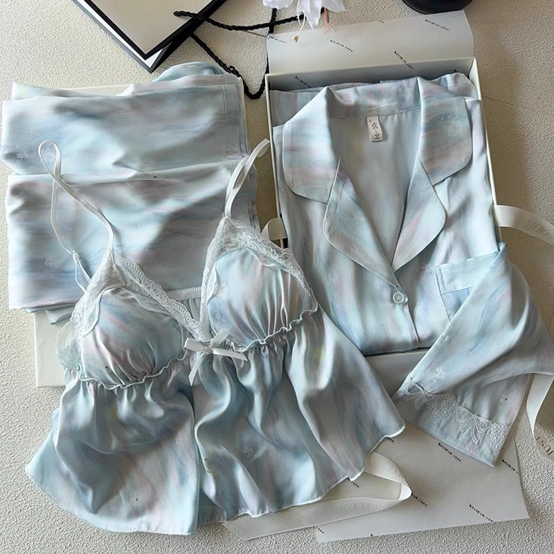 [4종세트] 퓨어 레이스 아이스 실크 여성용 잠옷, 고급 서스펜더 반바지, 가슴 패드가 있는 홈웨어스토어 가기