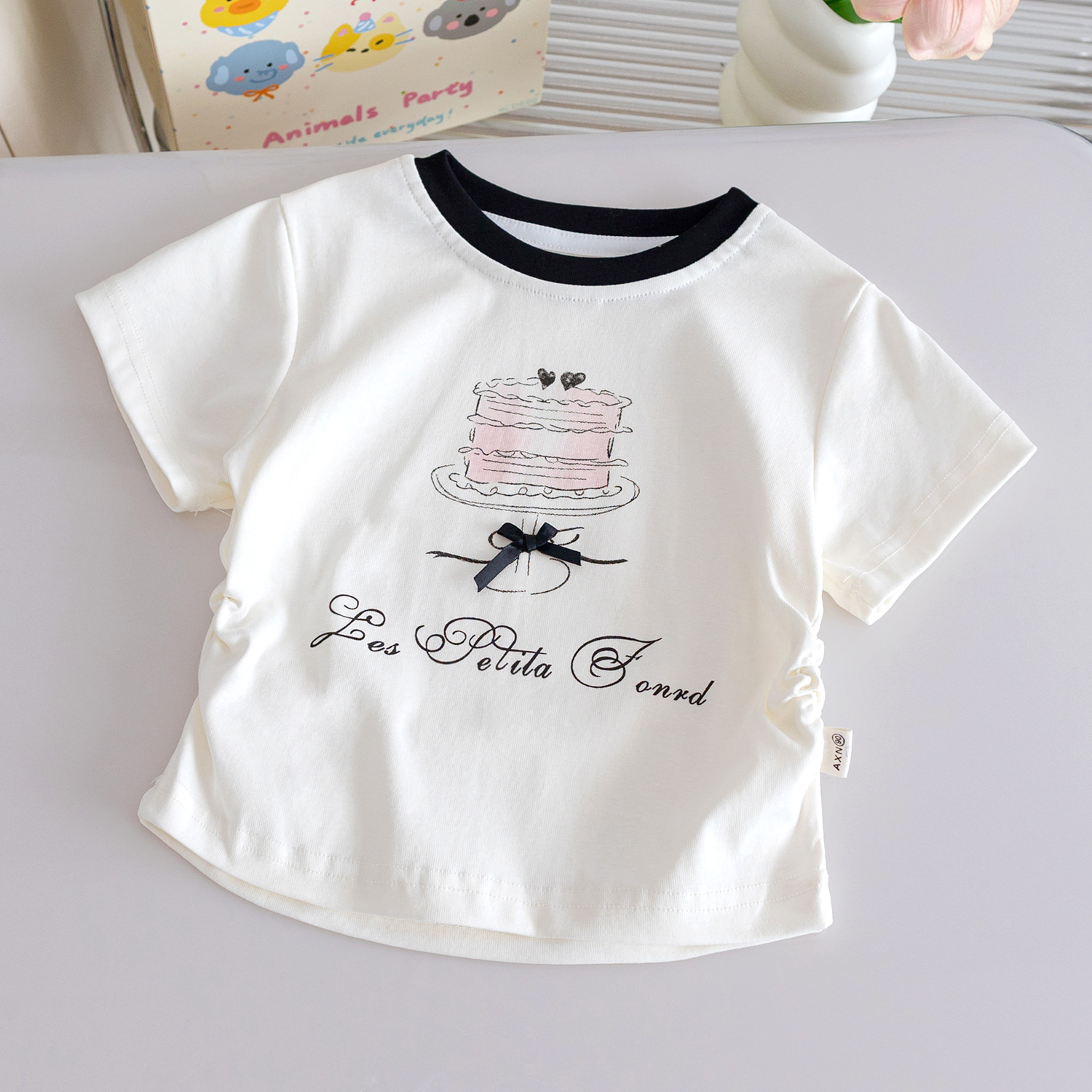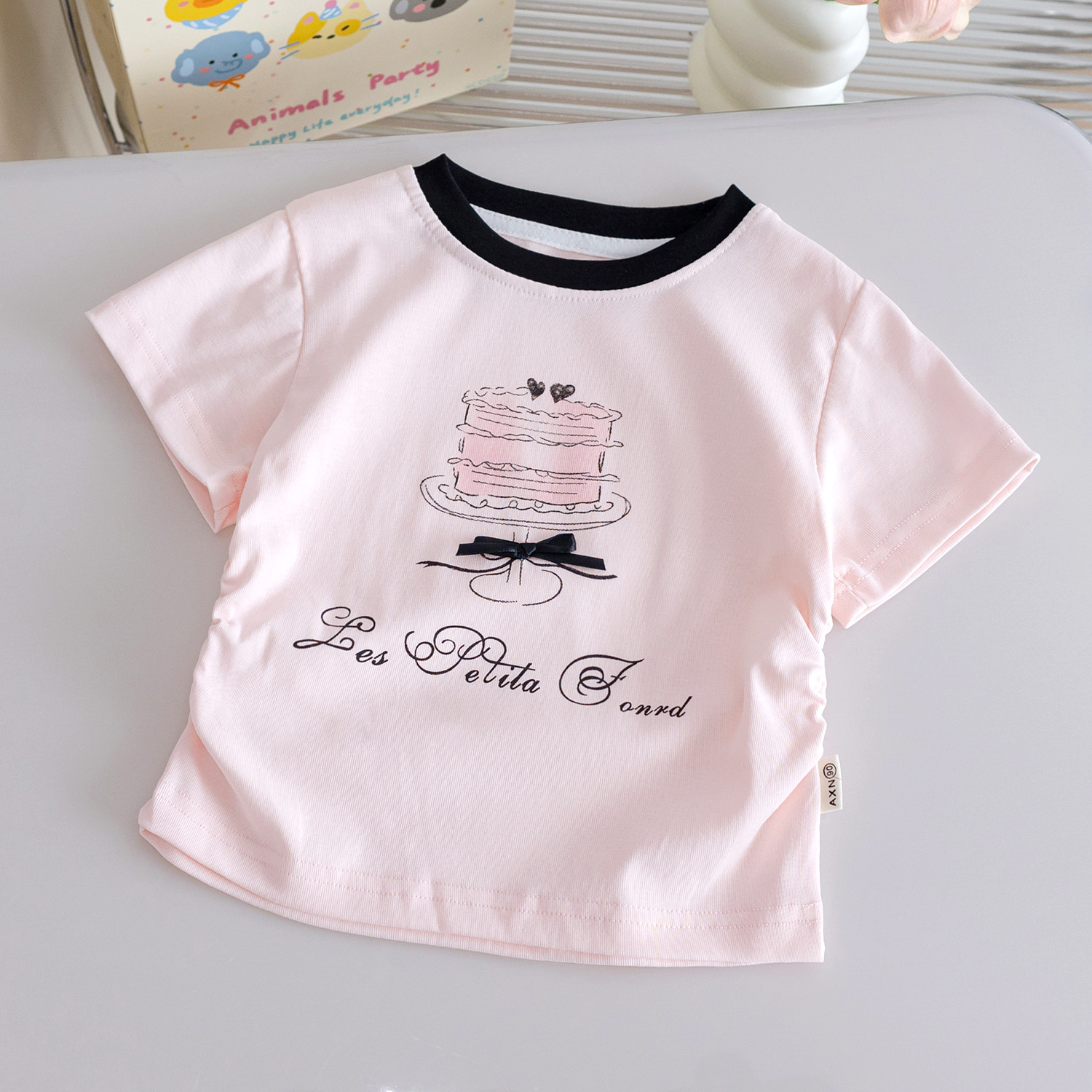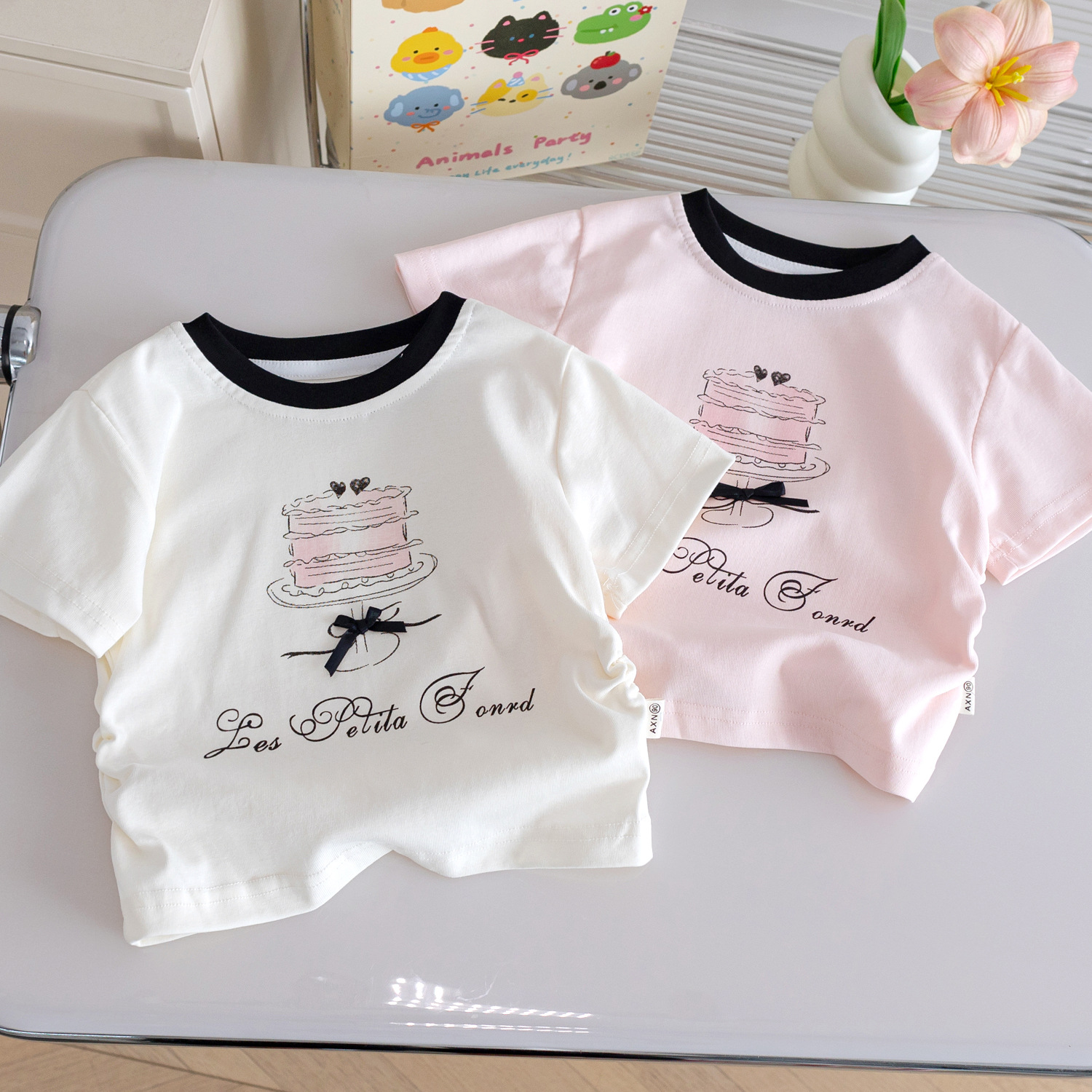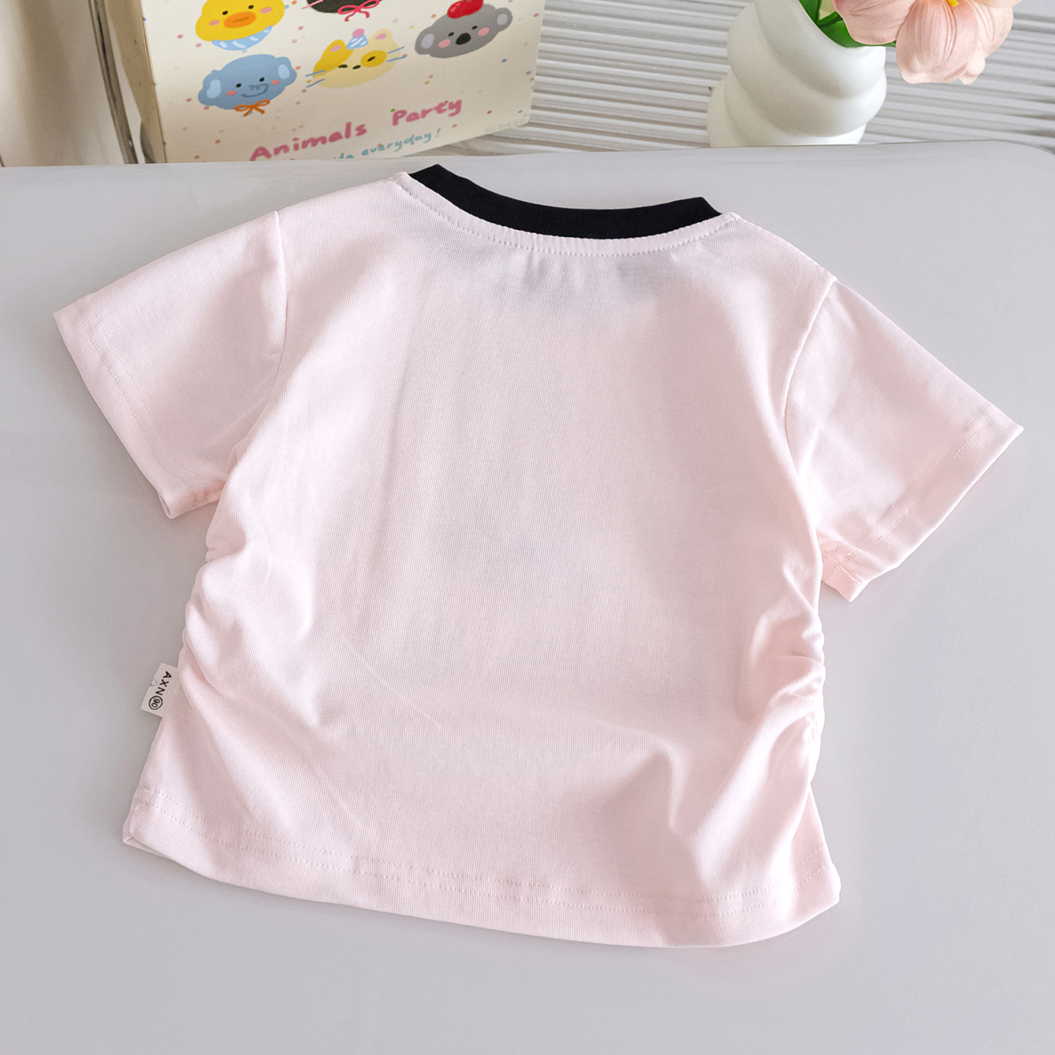 【48시간 이내 배송】여아 여름용 달콤한 배색 반팔 스타일리쉬 만화 티셔츠, 아동용 귀엽고 활용도 높은 상의