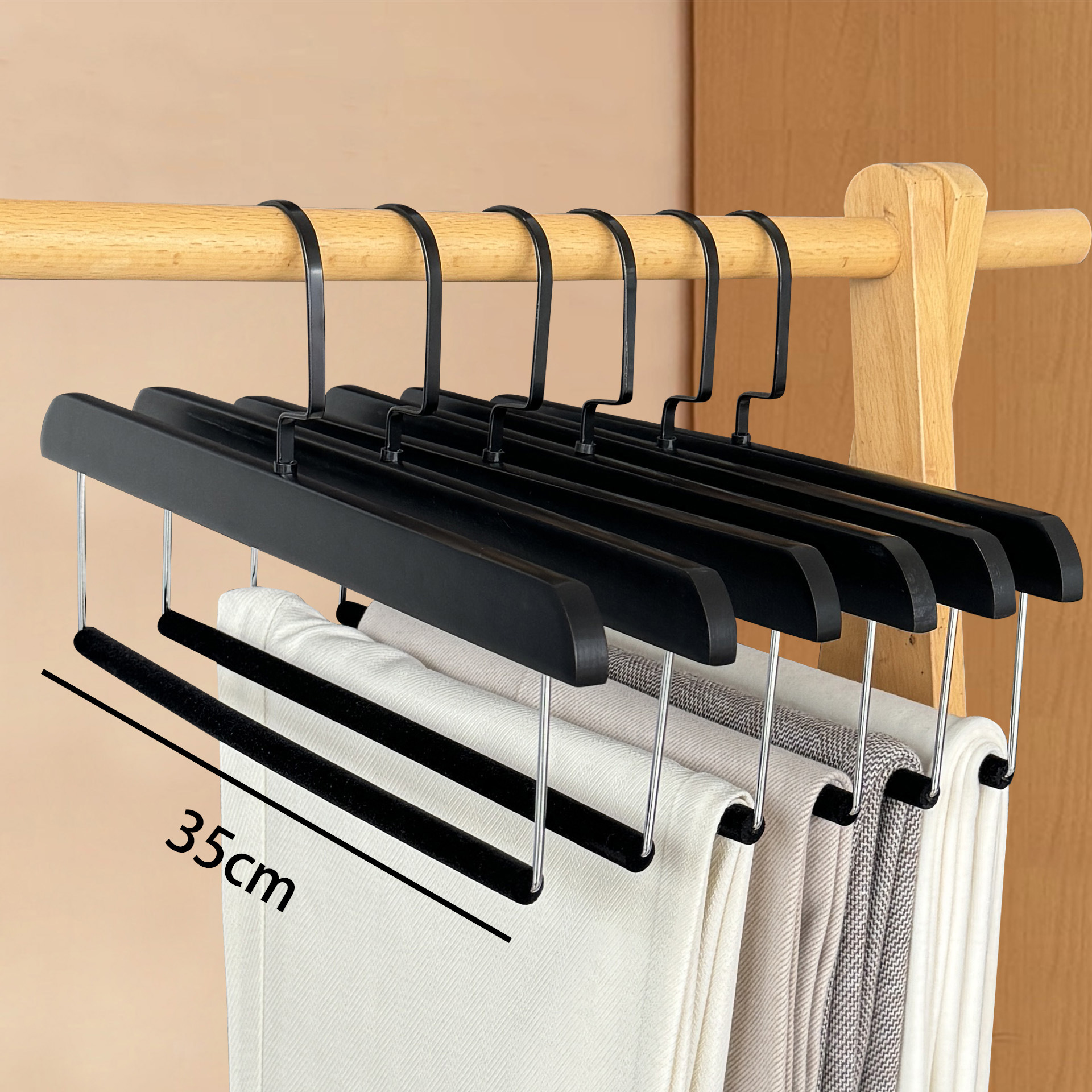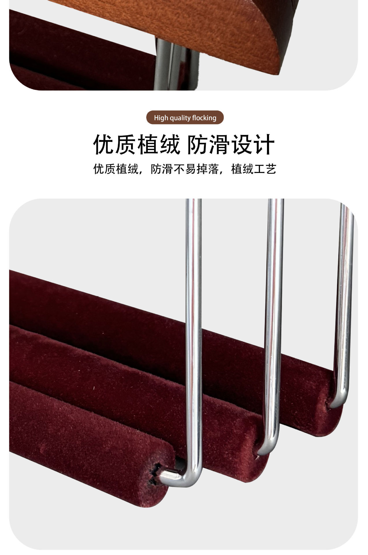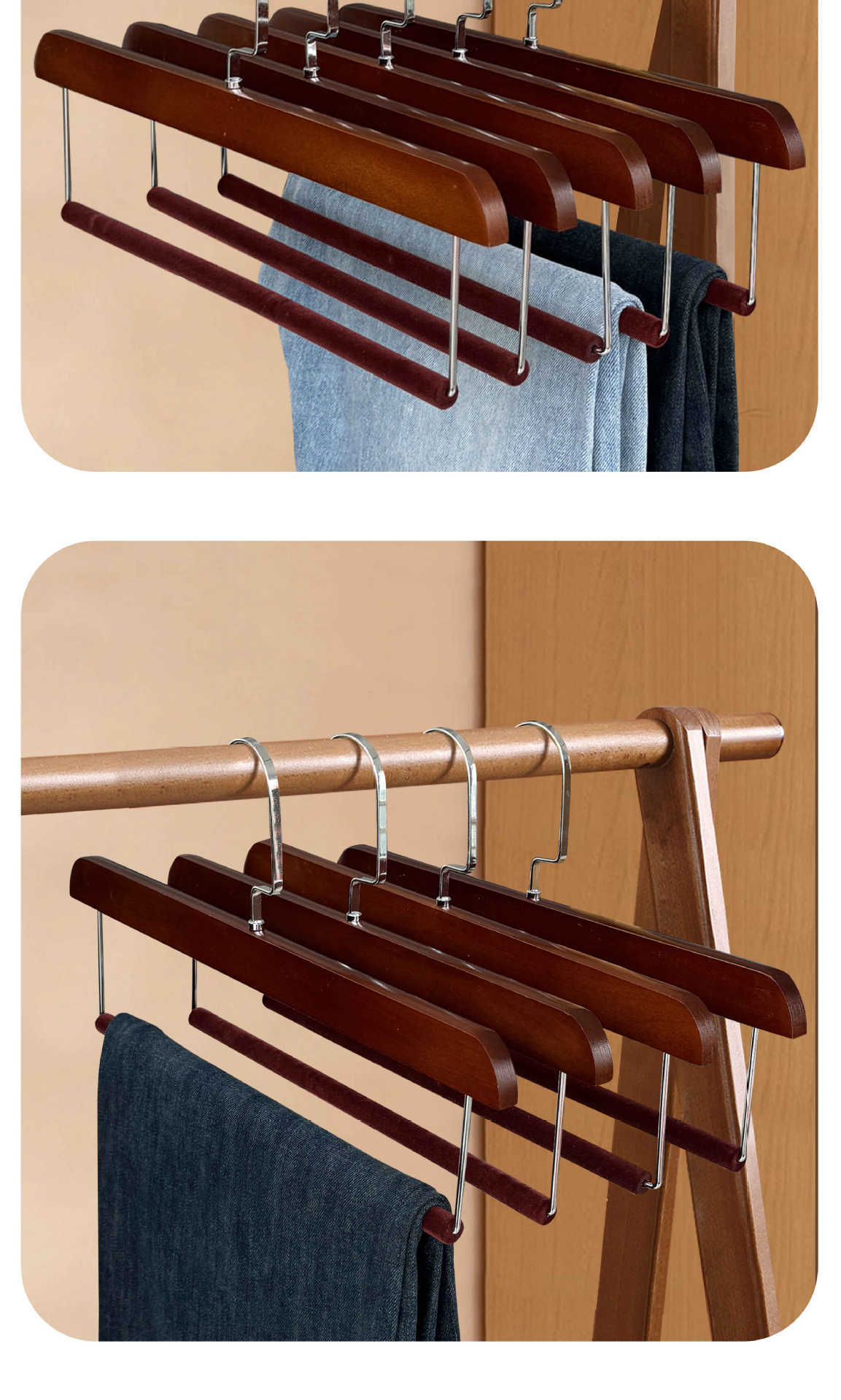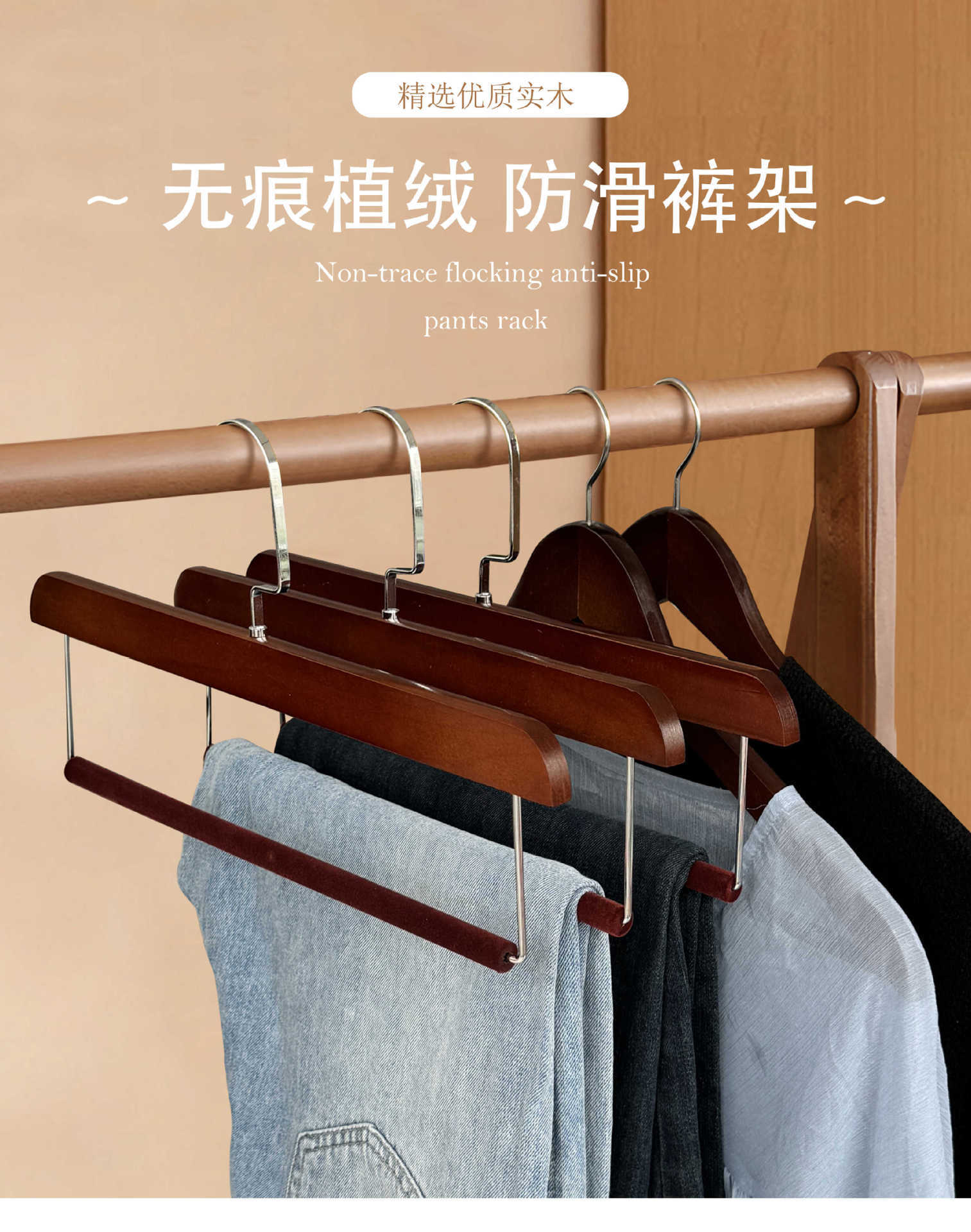 플록 처리 된 단단한 나무 바지 걸이, 미끄럼 방지 및 흔적없는 가정용 보관 옷장 스커트 클립 의류 매장 나무 바지 걸이 도매스토어 가기