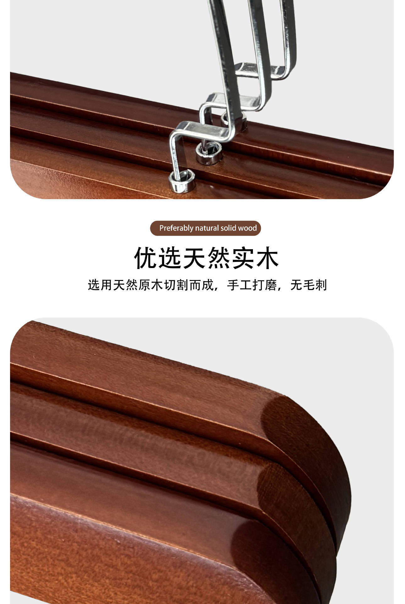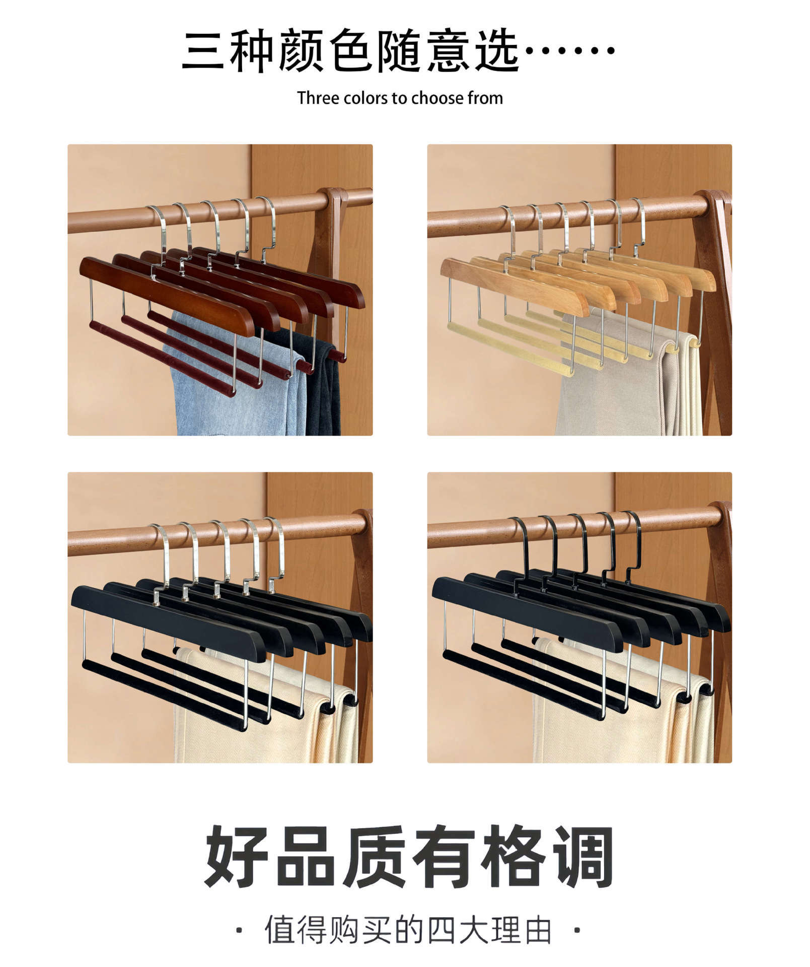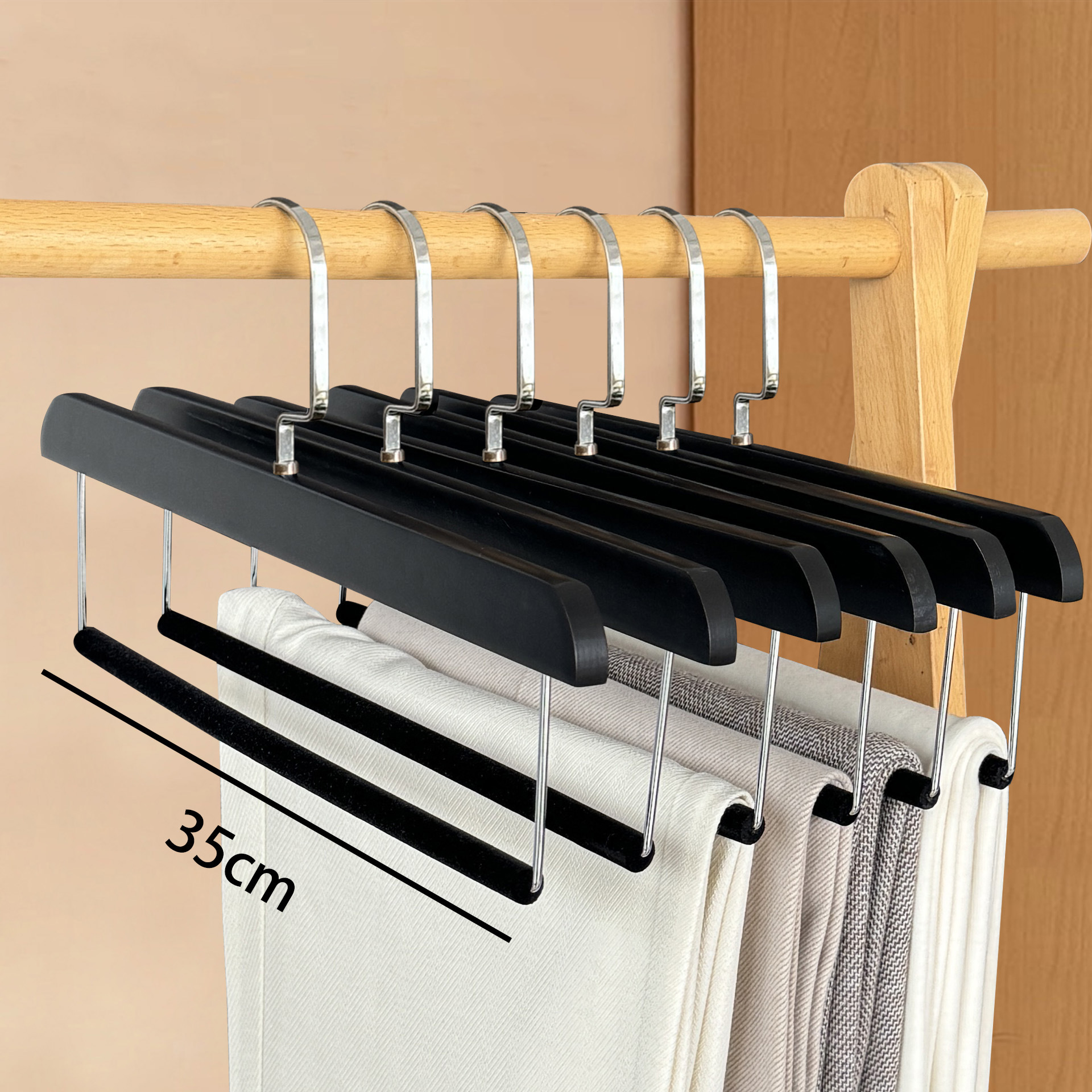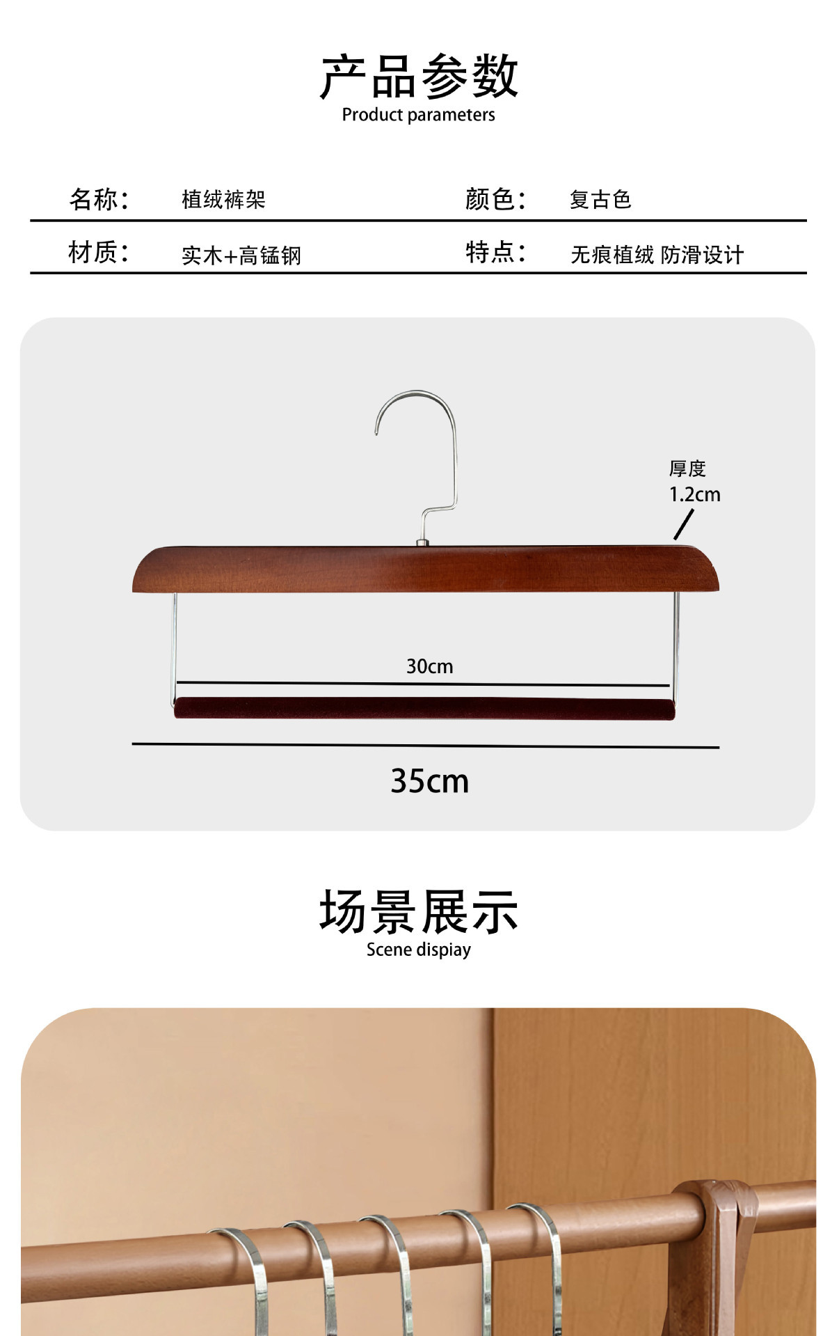 플록 처리 된 단단한 나무 바지 걸이, 미끄럼 방지 및 흔적없는 가정용 보관 옷장 스커트 클립 의류 매장 나무 바지 걸이 도매스토어 가기