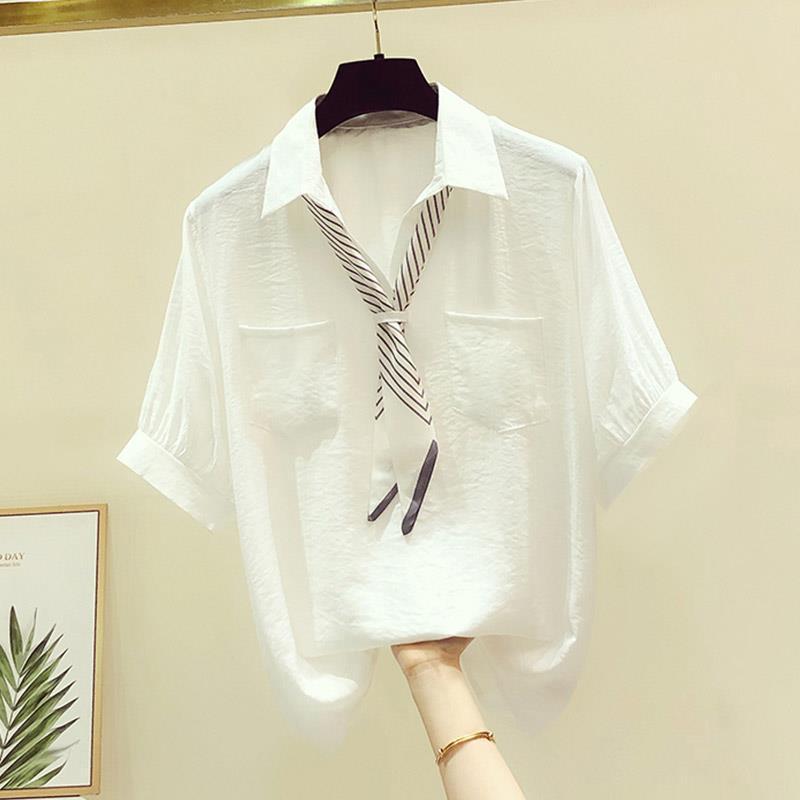 여름 여성용 나이를 줄여주는 칼라 반팔 셔츠, 여성용 고급 쉬폰 셔츠, 고급스럽고 스타일리시하며 아름답고 시크한 상의
