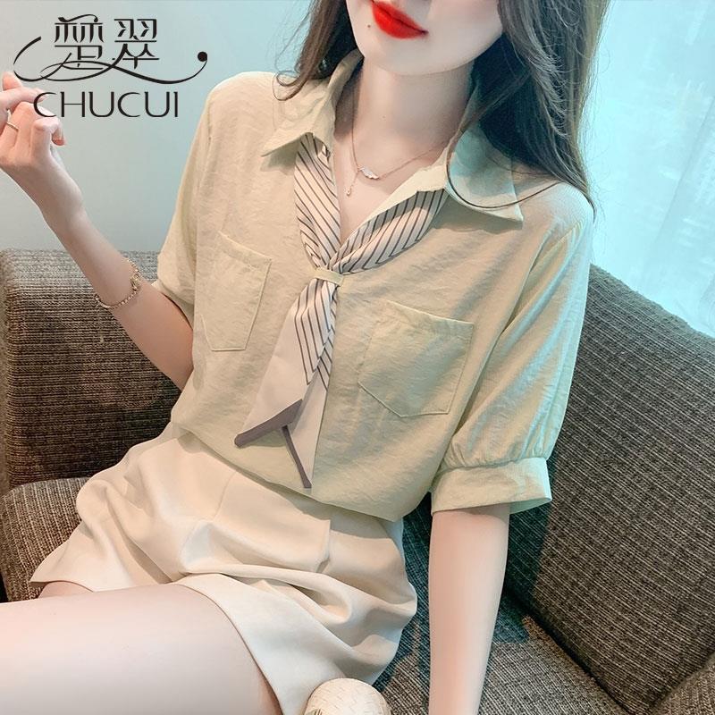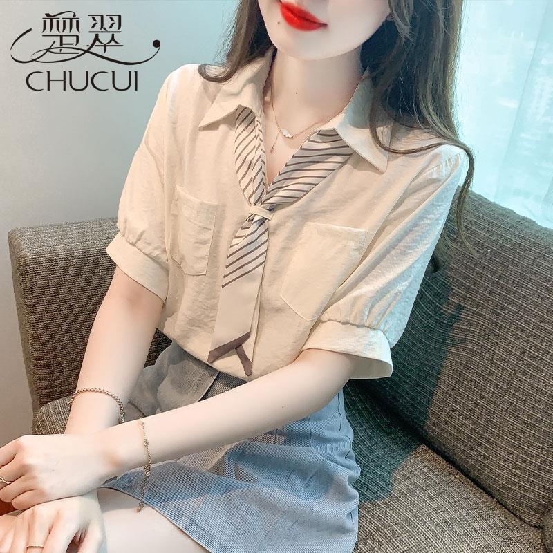 여름 여성용 나이를 줄여주는 칼라 반팔 셔츠, 여성용 고급 쉬폰 셔츠, 고급스럽고 스타일리시하며 아름답고 시크한 상의스토어 가기
