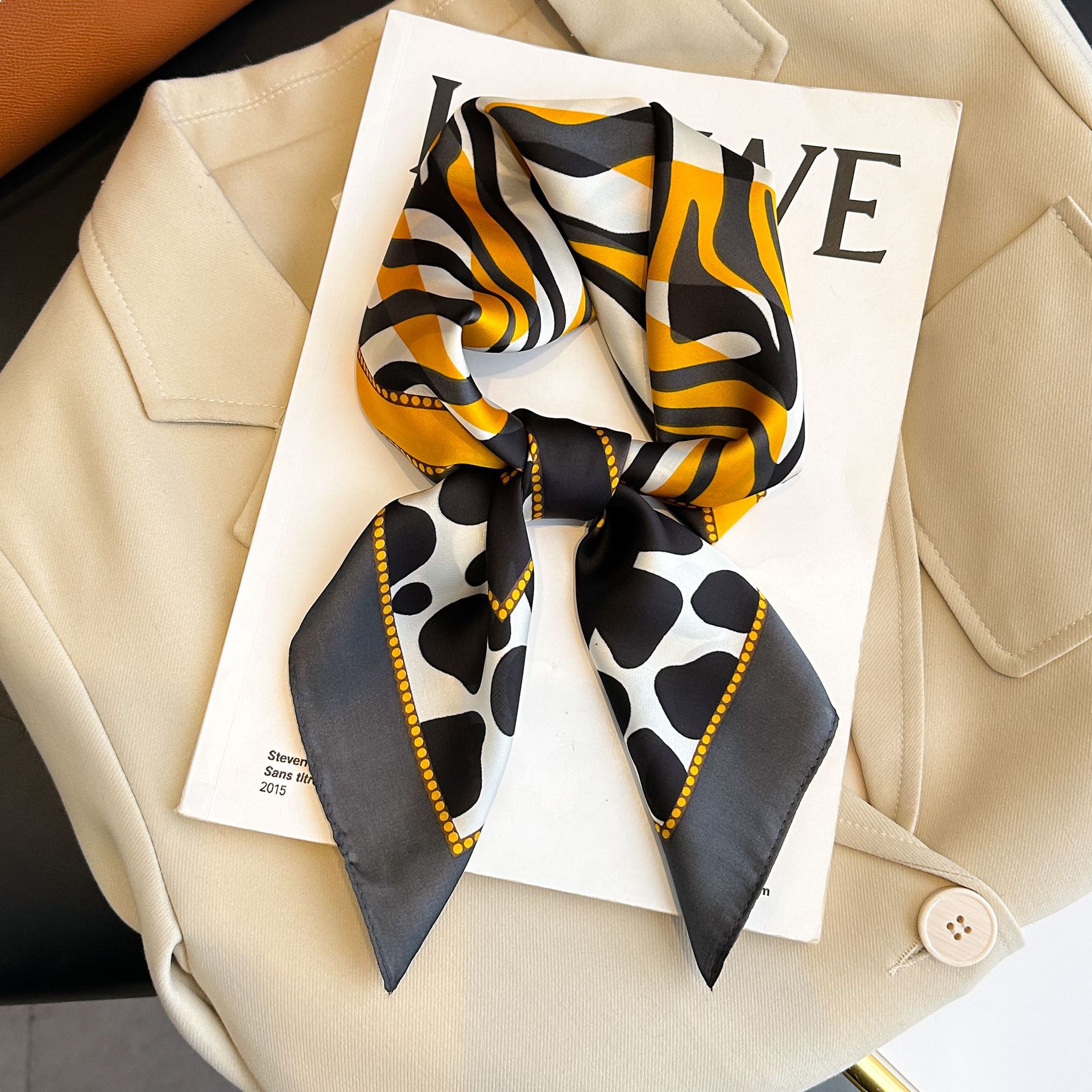 • 얼룩말 표범 무늬 옐로우 실크 스카프
