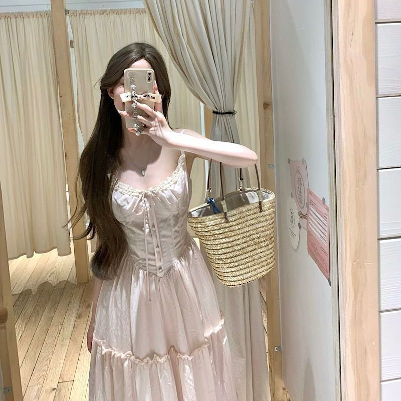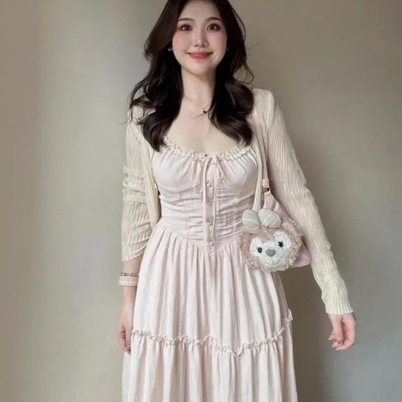 여름 신작 프렌치 스위트 핑크 서스펜더 드레스 홀리데이 스타일 허리 슬리밍 요정 스커트 가디건 투피스 세트스토어 가기