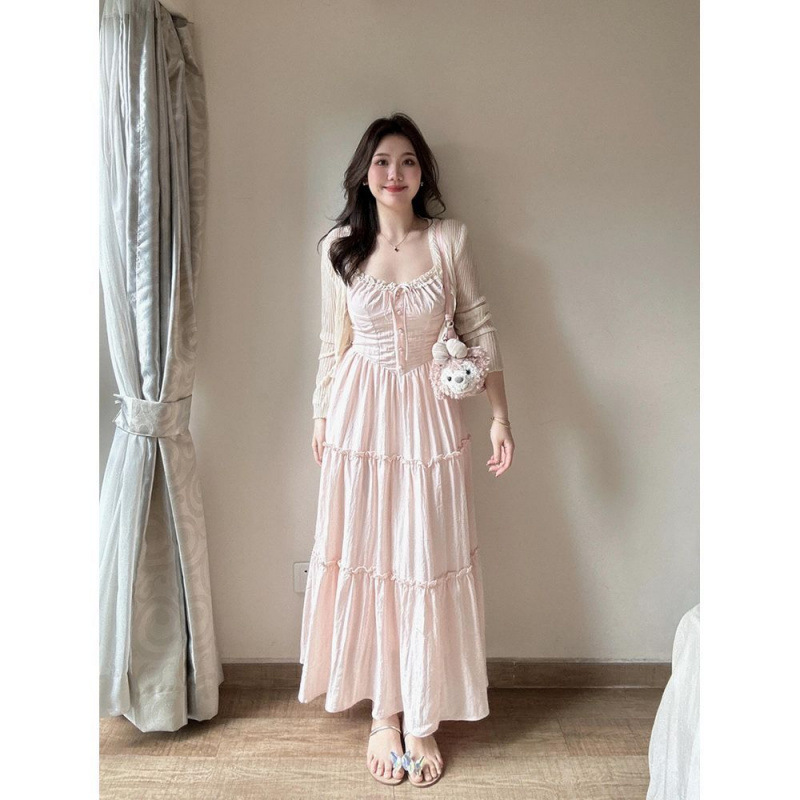 여름 신작 프렌치 스위트 핑크 서스펜더 드레스 홀리데이 스타일 허리 슬리밍 요정 스커트 가디건 투피스 세트