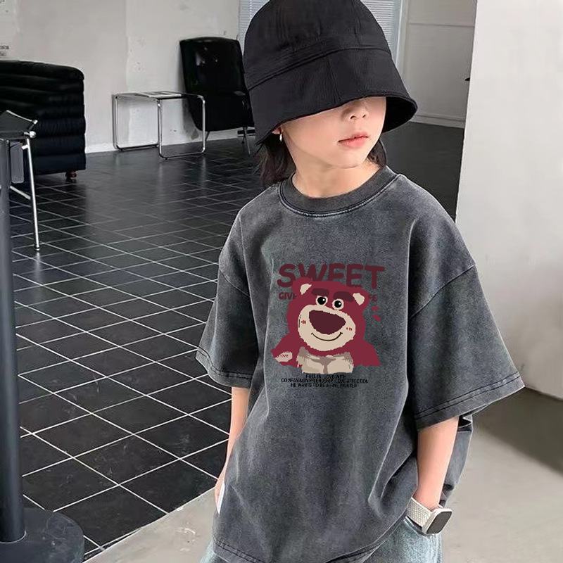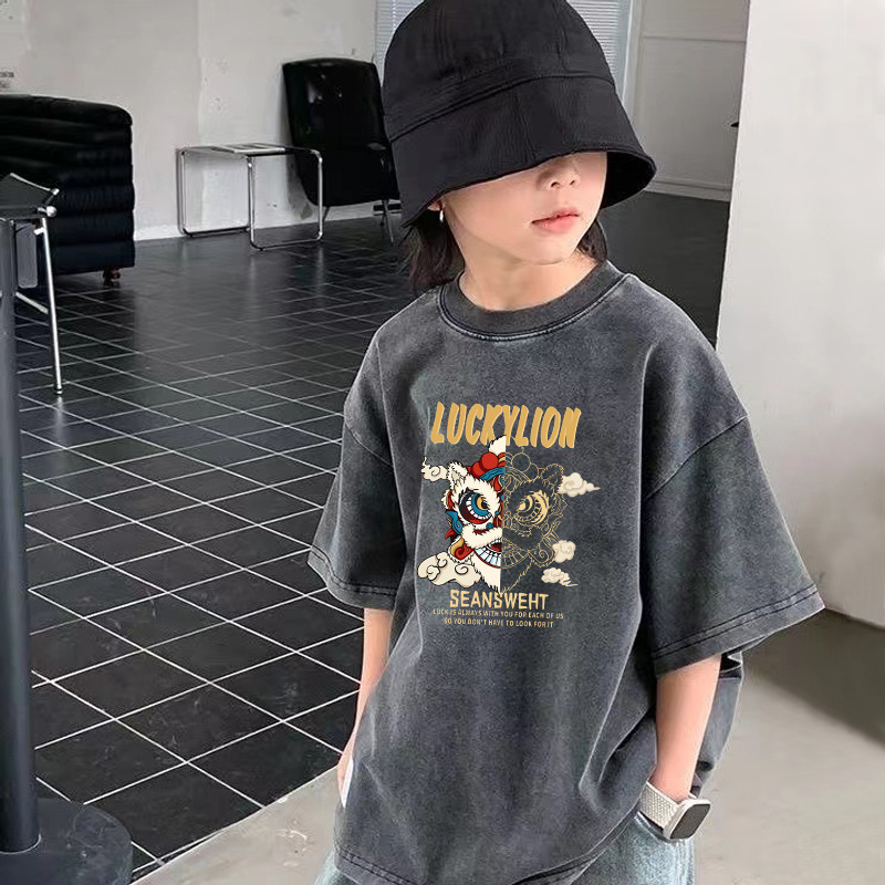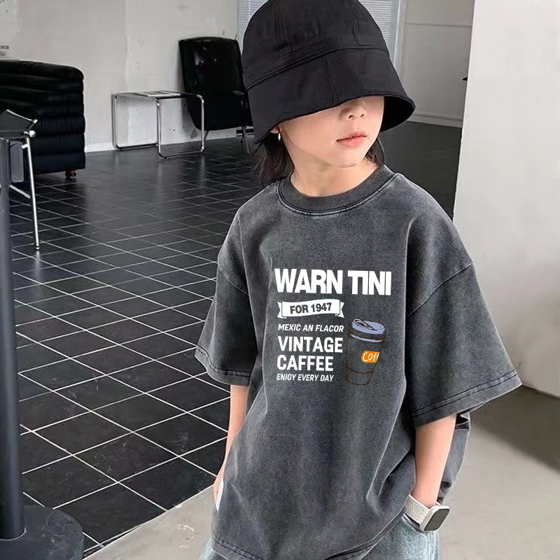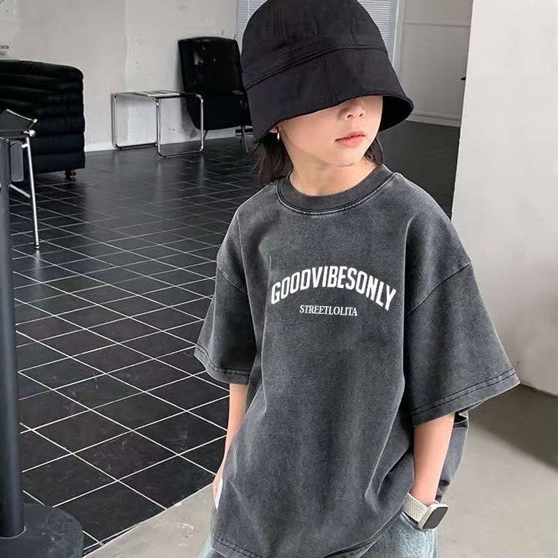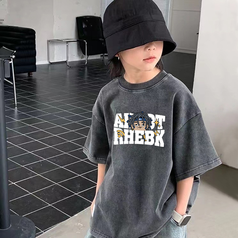 크로스보더 남아용 워싱 반팔 티셔츠 여름 남아용 트렌디 캐주얼 티셔츠 중대형 아동용 순면 디스트레스드 탑 인스토어 가기