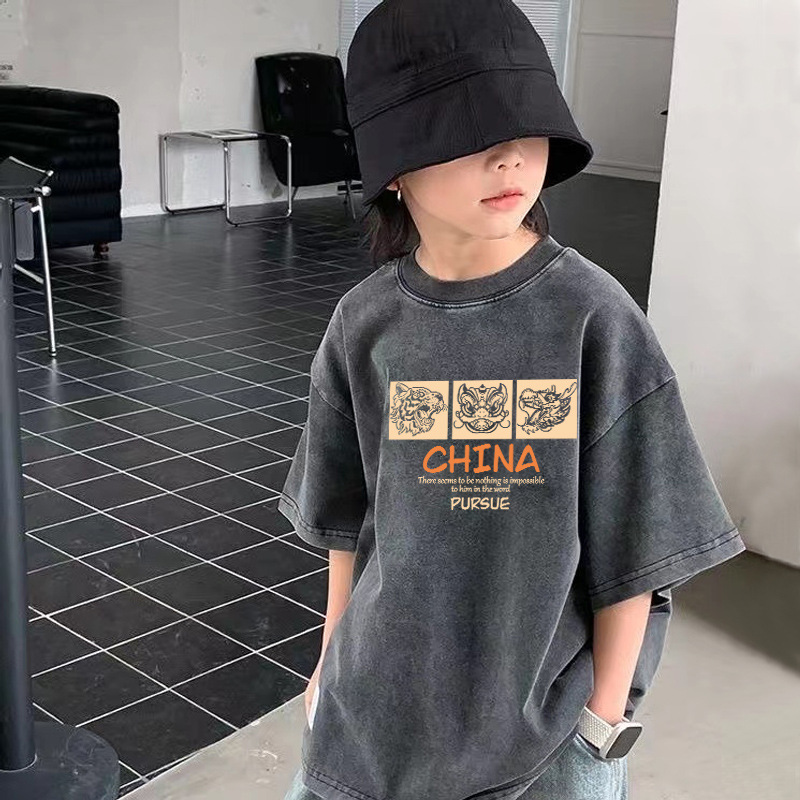 크로스보더 남아용 워싱 반팔 티셔츠 여름 남아용 트렌디 캐주얼 티셔츠 중대형 아동용 순면 디스트레스드 탑 인