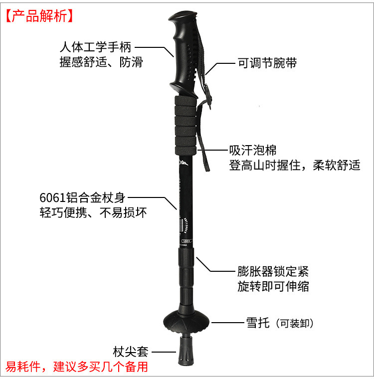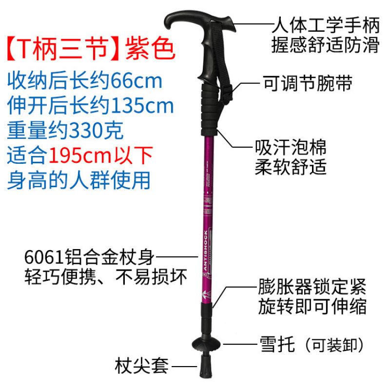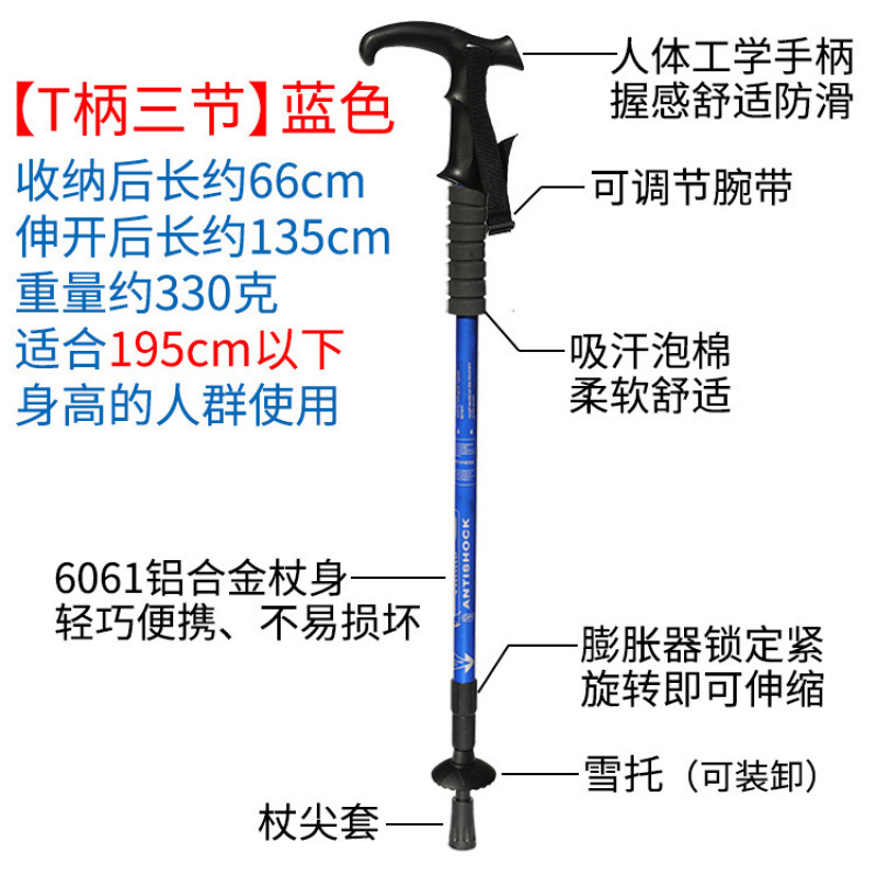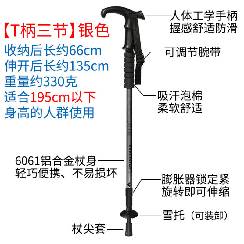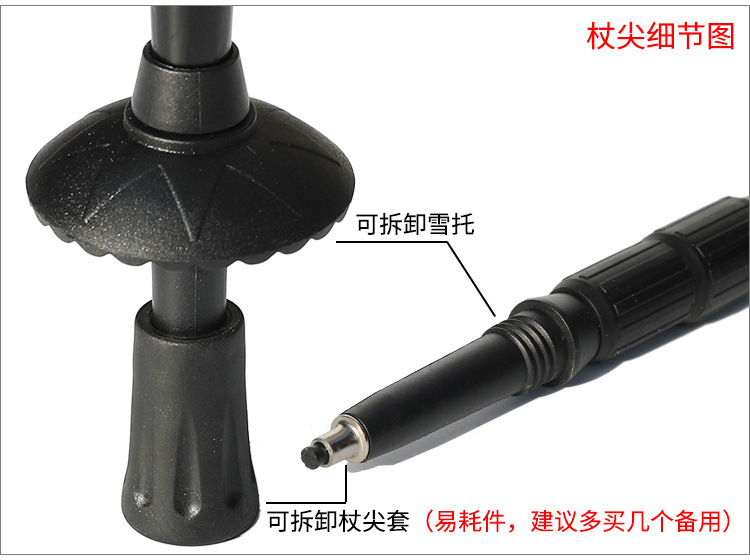 • 4개 섹션으로 구성된 T자형 핸들 + 5개의 지팡이 팁 세트