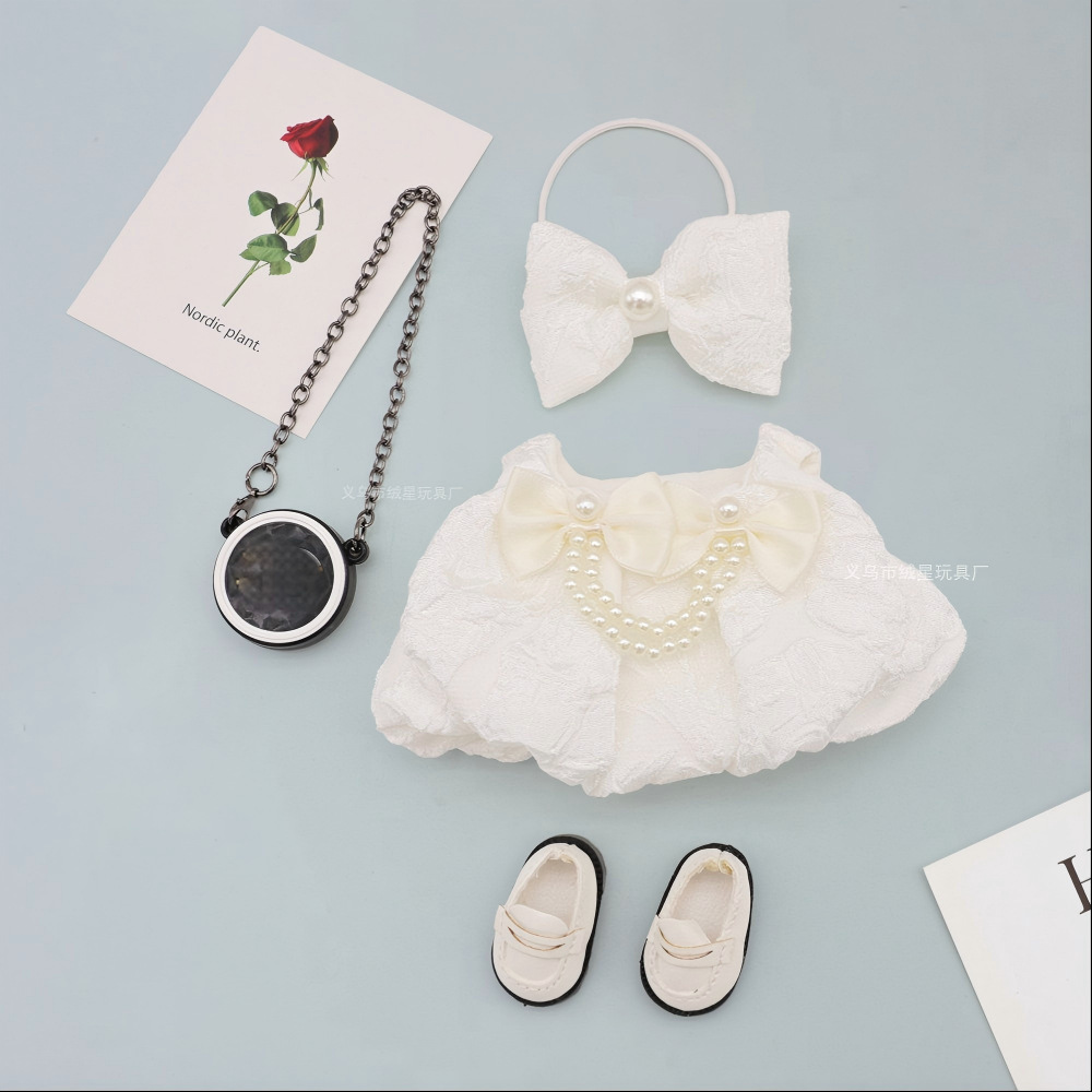 • RX289 블랙 퐁퐁 공주 드레스 + 블랙 리본 + 블랙 가죽 신발 + 화이트 원형 샤넬풍 파우치 4종 세트 (인형 미포함)