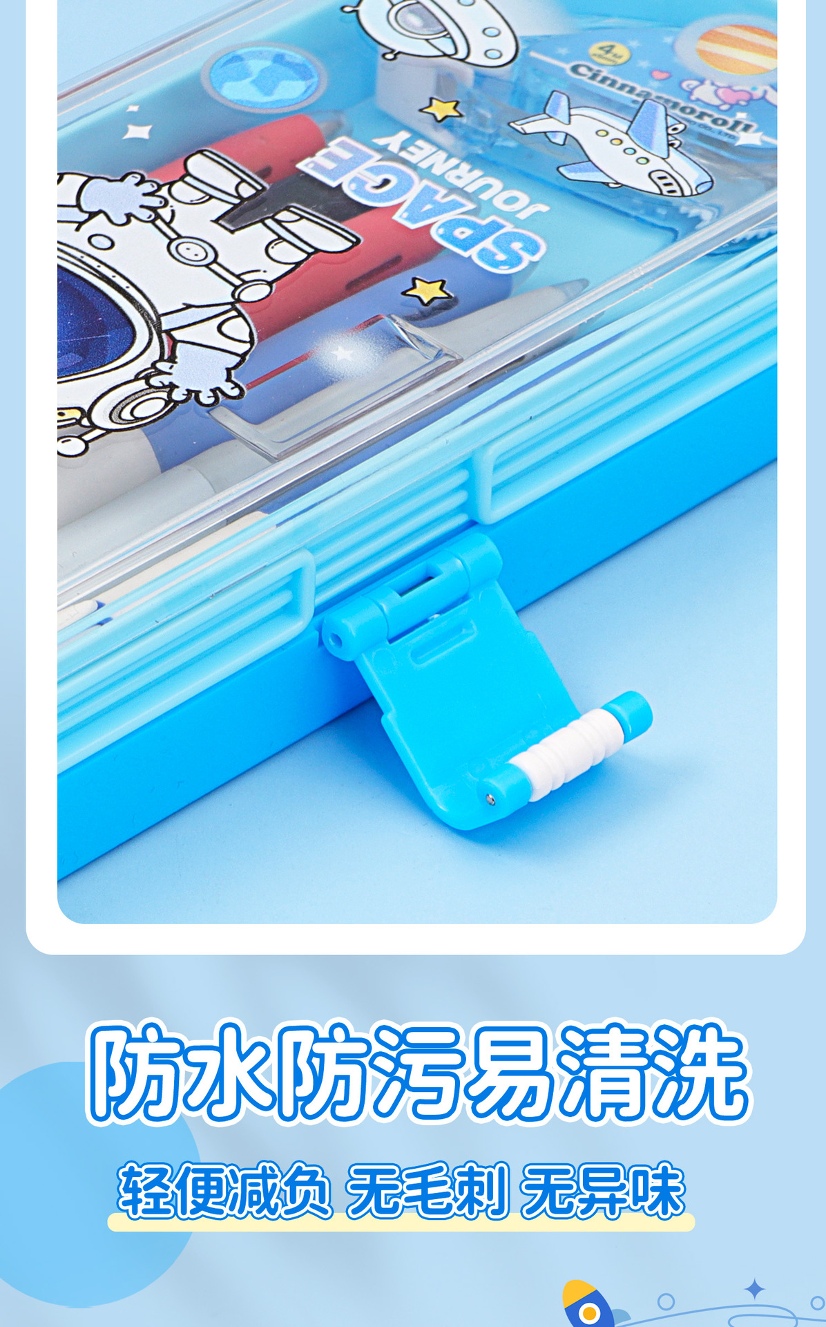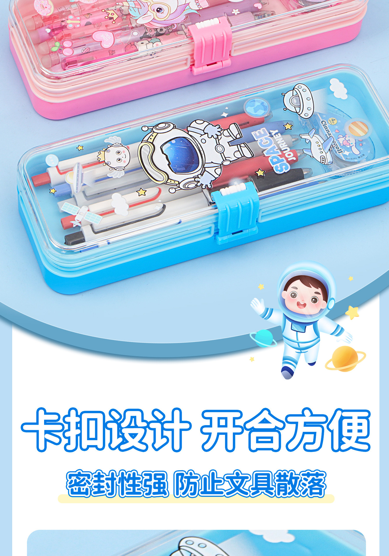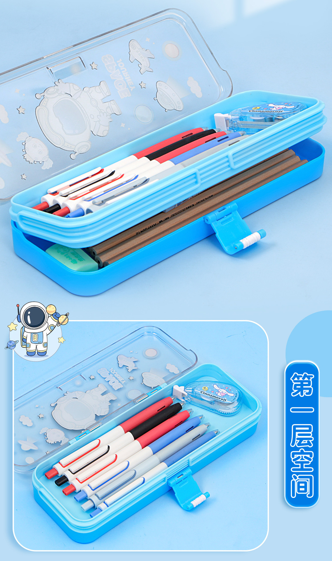 • 35331 하늘색 우주 비행사 이중층 플라스틱 버클 펜 상자