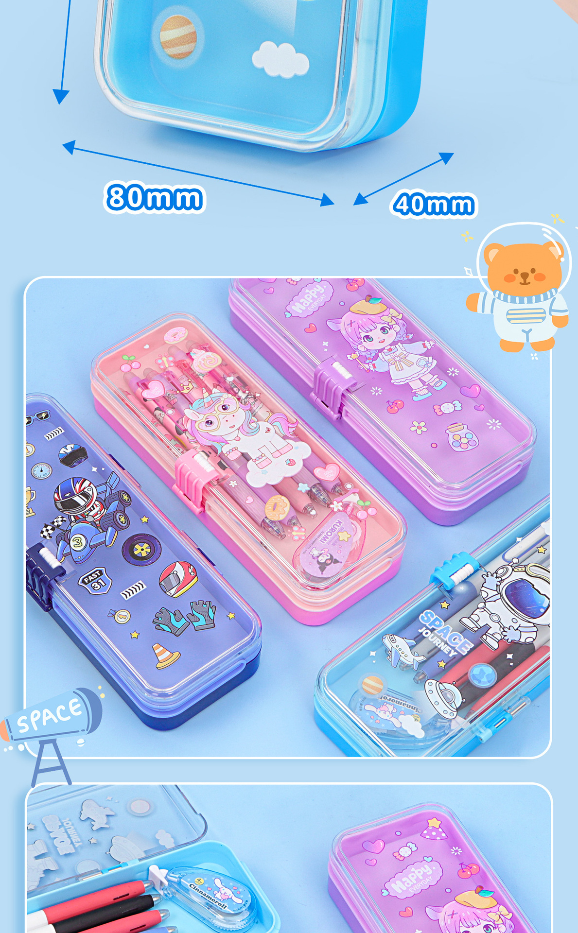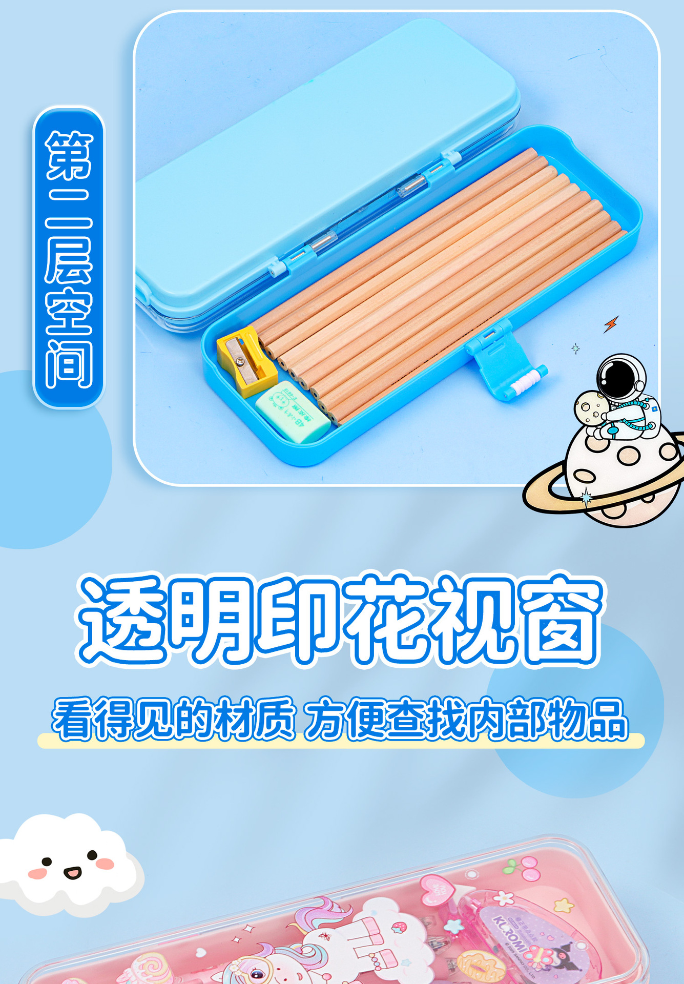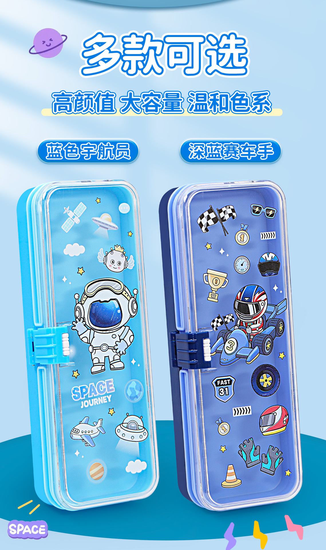 • 35331 하늘색 우주 비행사 이중층 플라스틱 버클 펜 상자