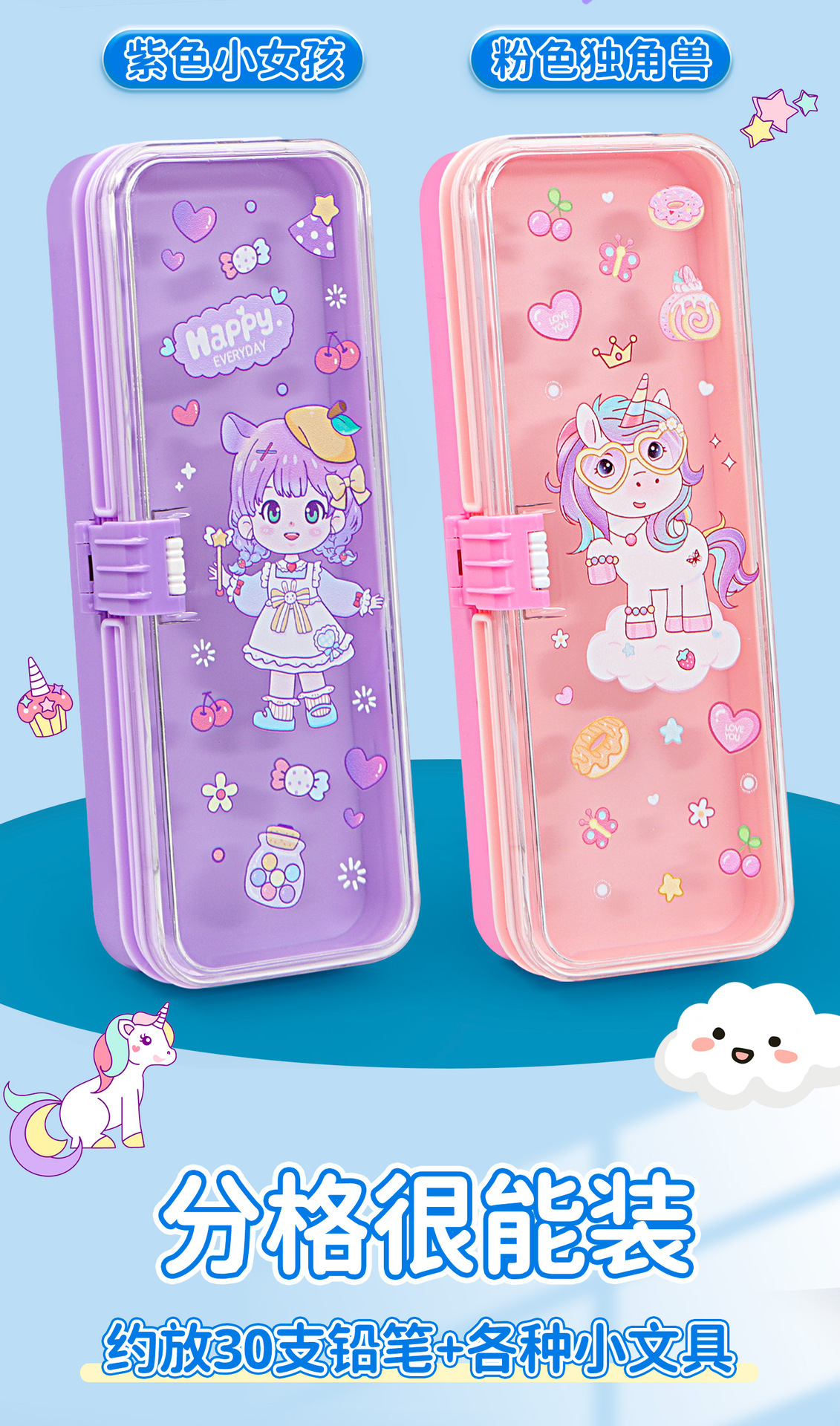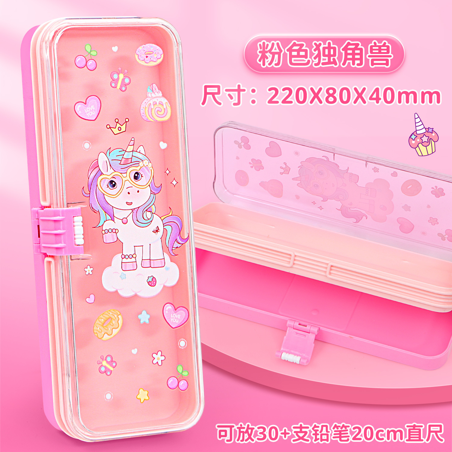• 35331 핑크 유니콘 더블 레이어 플라스틱 버클 펜 박스