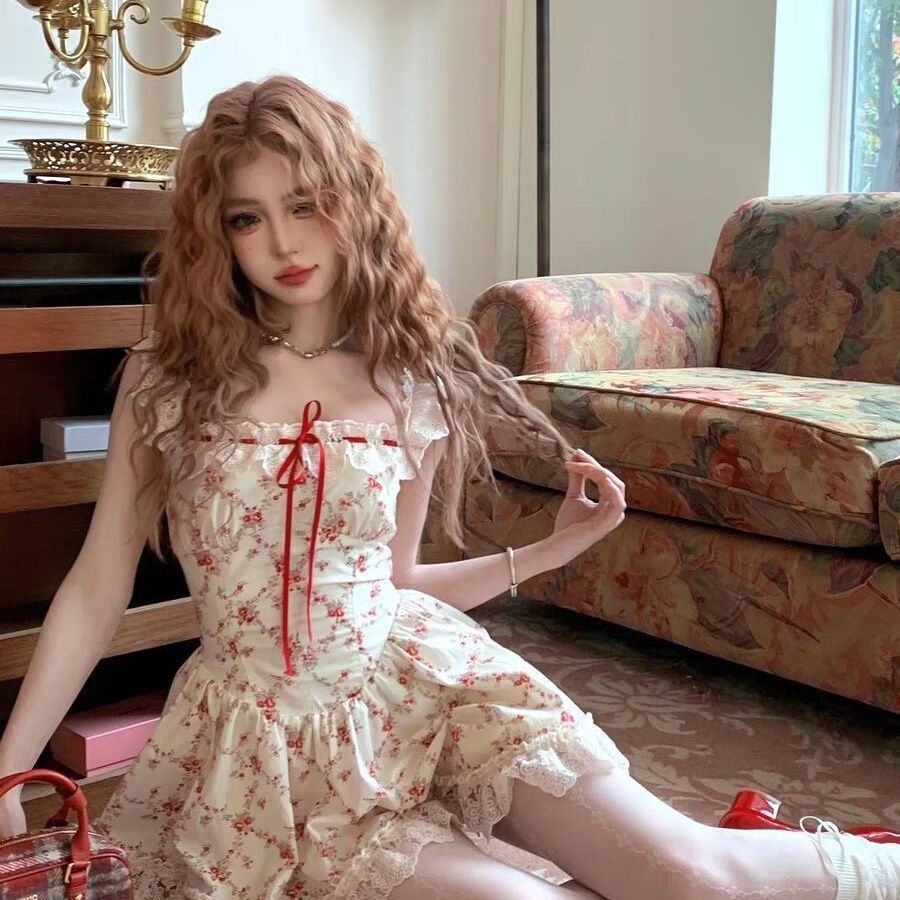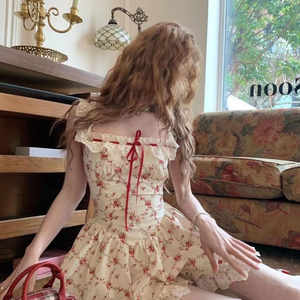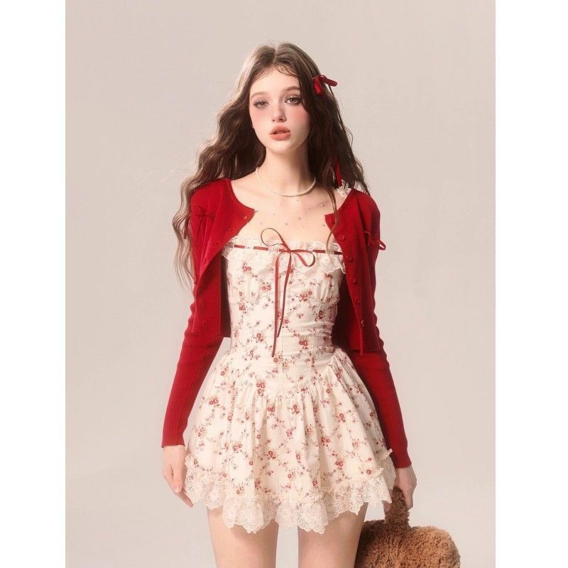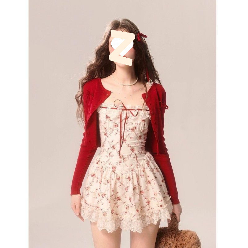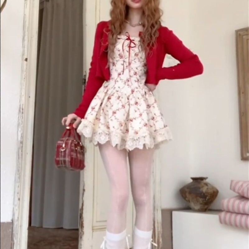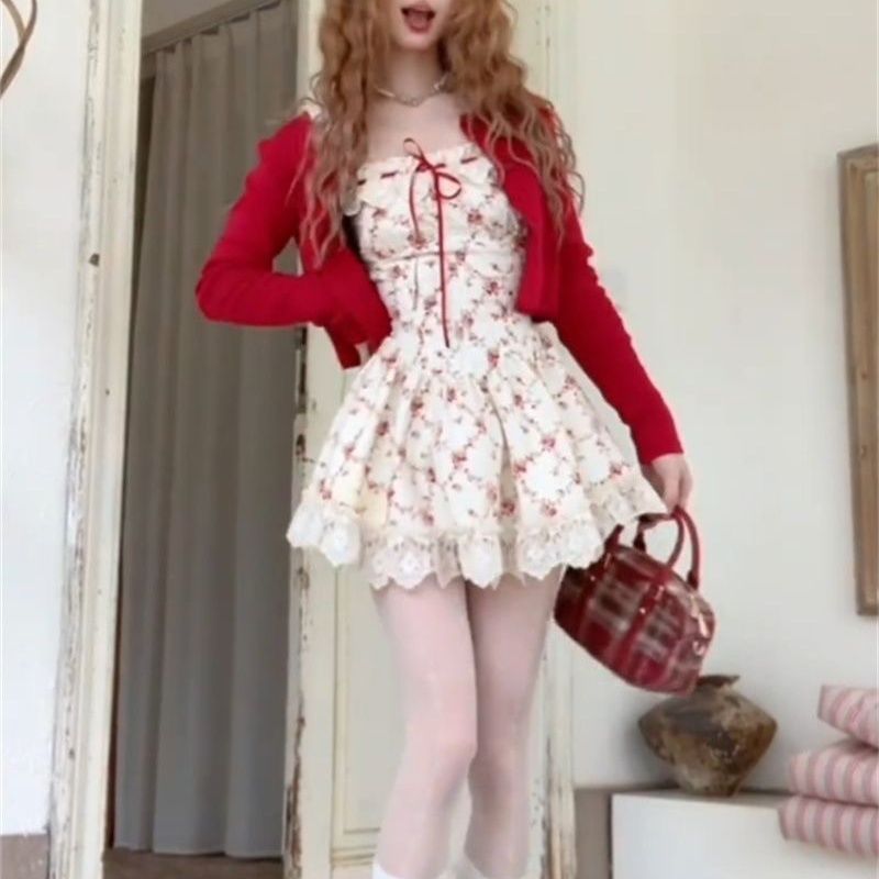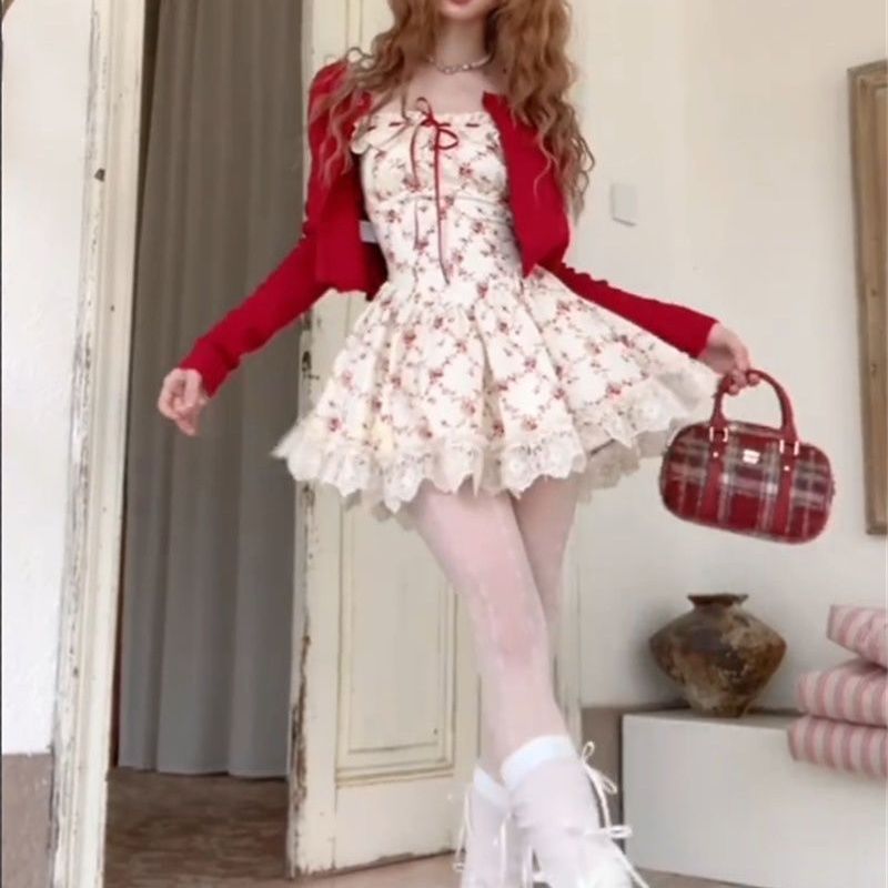 프렌치 일본식 달콤한 여성스러운 레이스 스플리싱 민소매 꽃무늬 드레스 짧은 가디건 서양식 정장 스커트스토어 가기