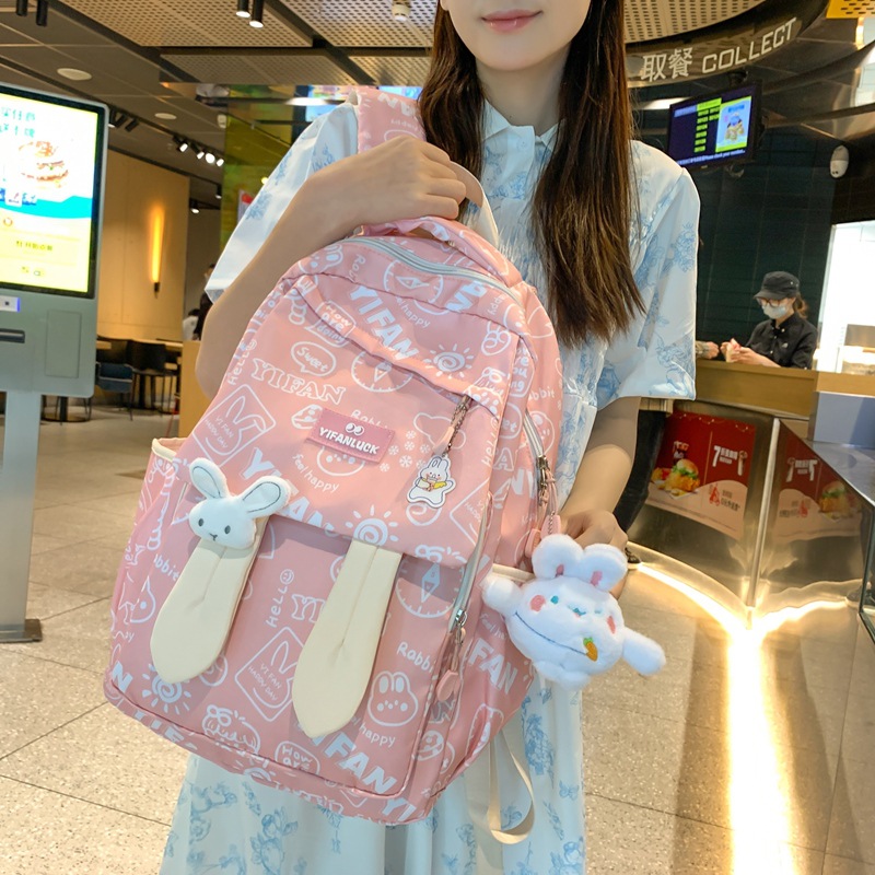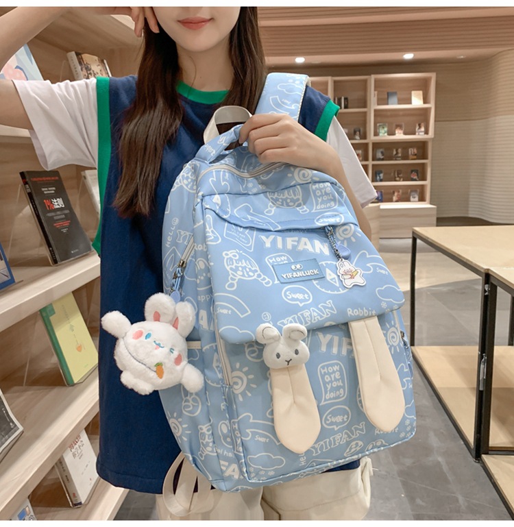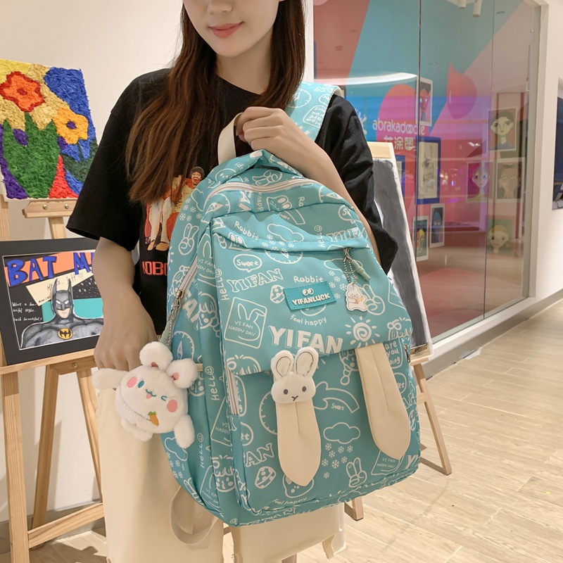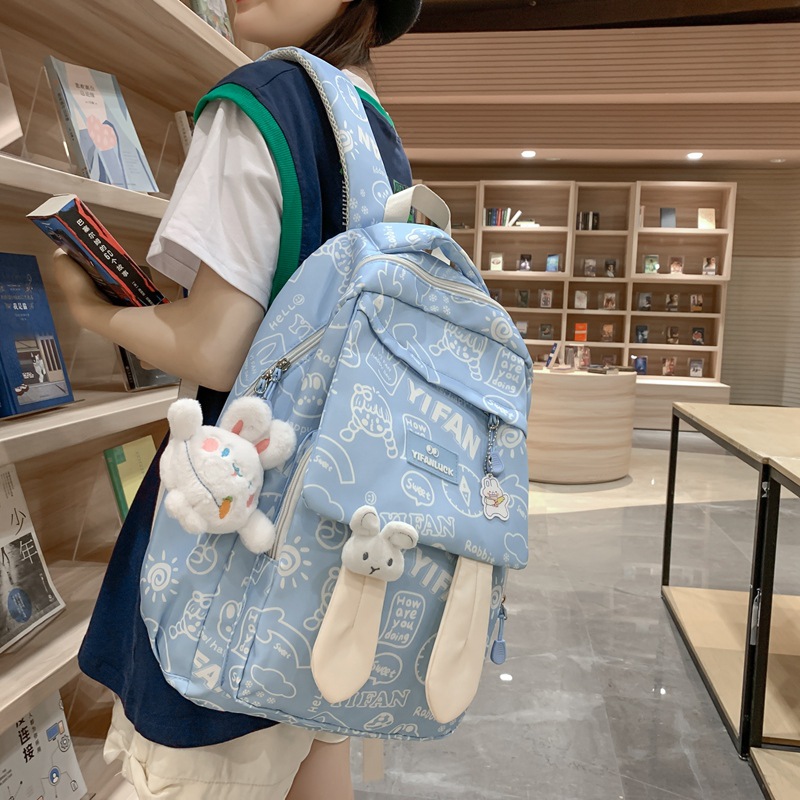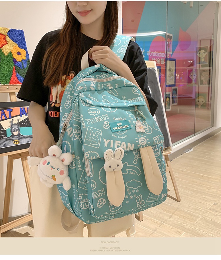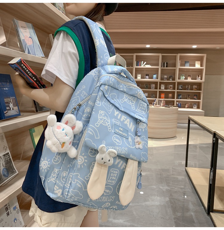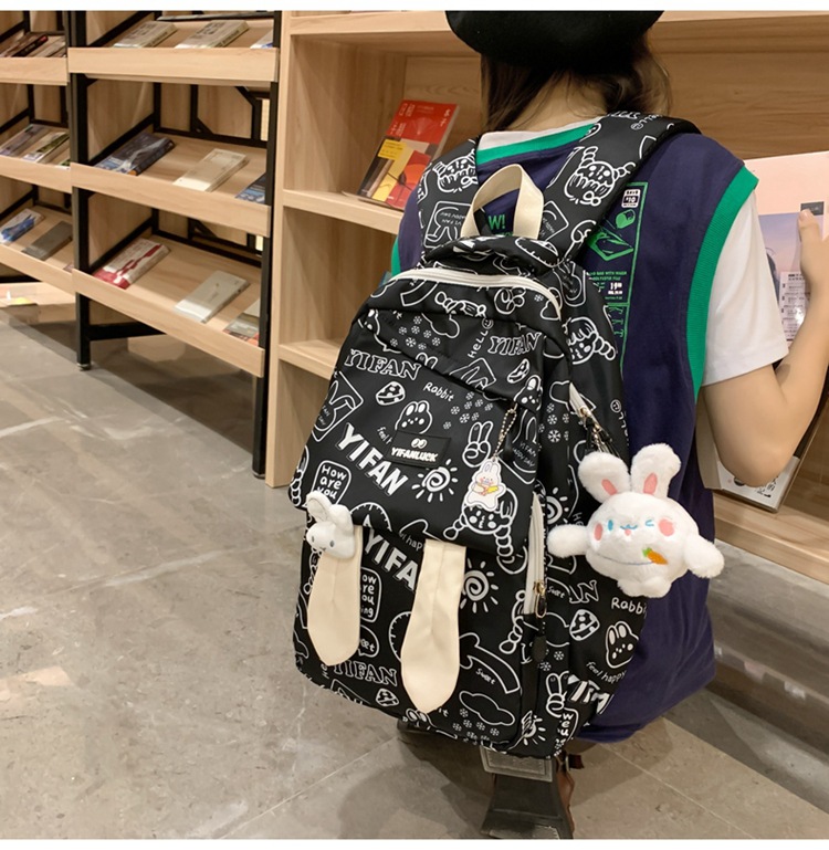 초등학생을위한 국경 간 책가방 여성의 새로운 대용량 낙서 토끼 귀 배낭 빈티지 스타일 귀여운 소녀 배낭