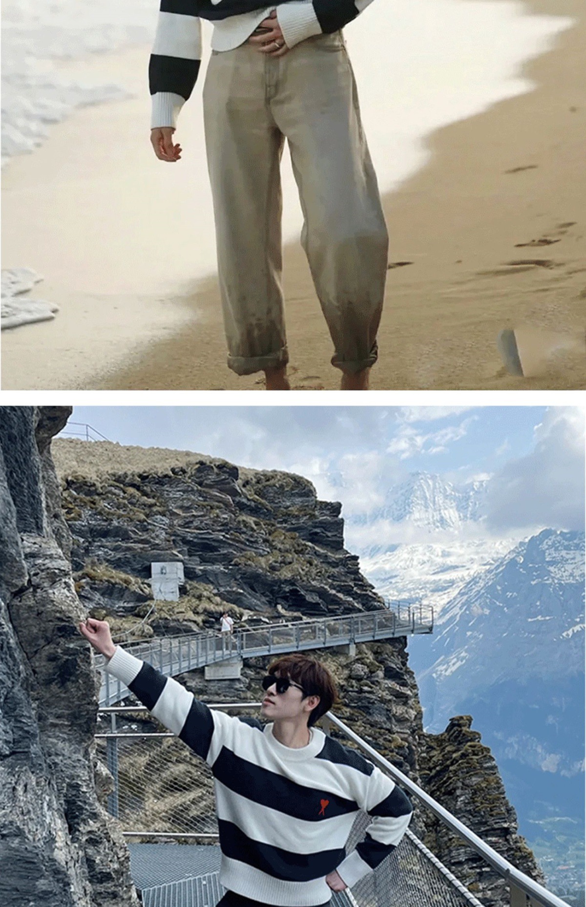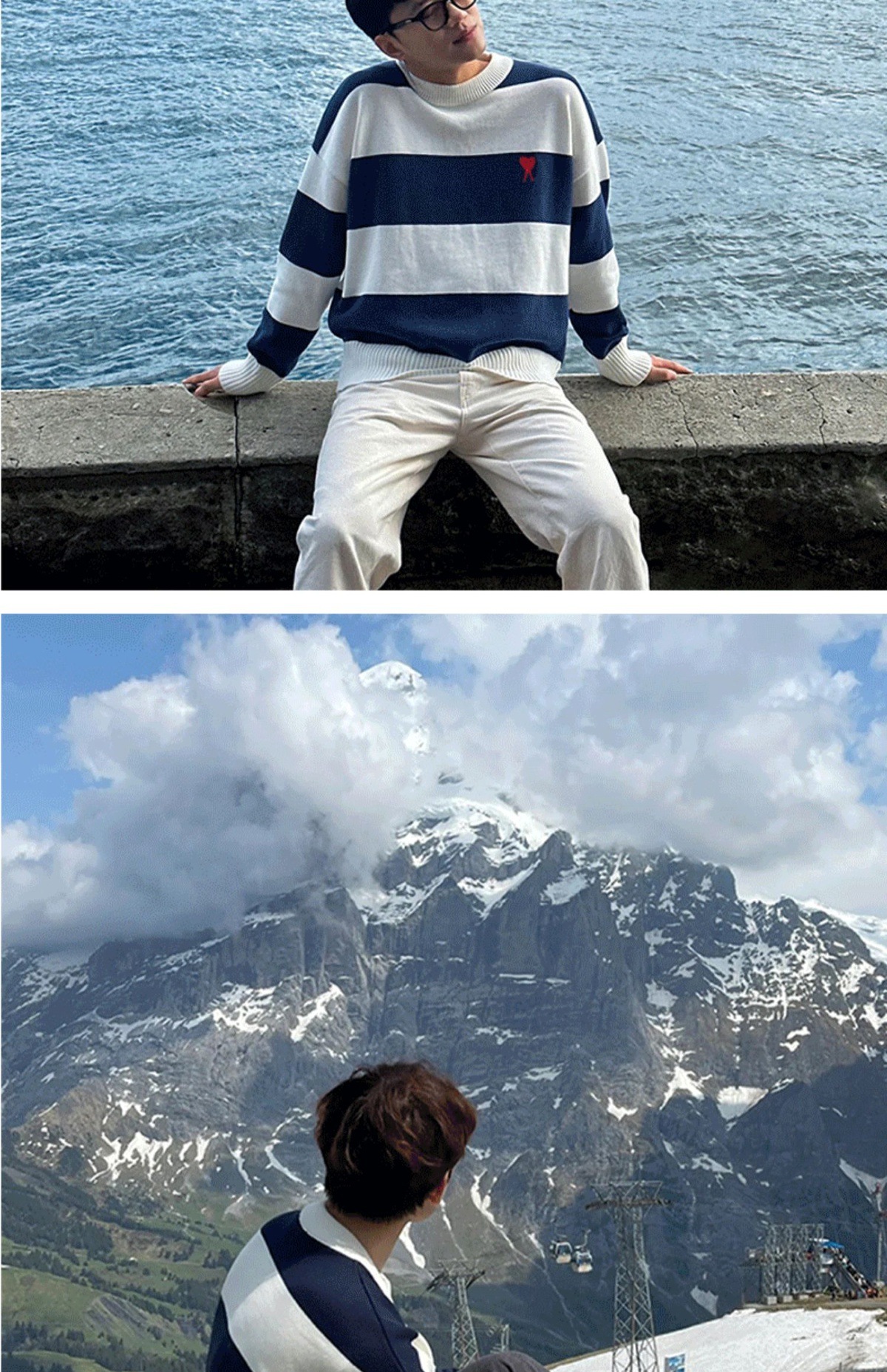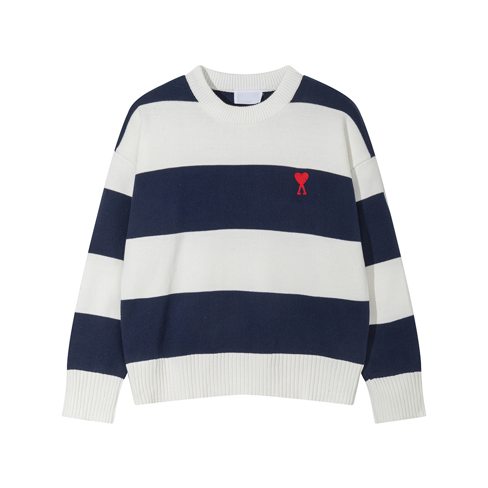 ami 25ss 클래식 작은 사랑 자수 라운드 넥 풀오버 긴팔 스웨터 남성과 여성 스트라이프 스플 라이스 스웨터