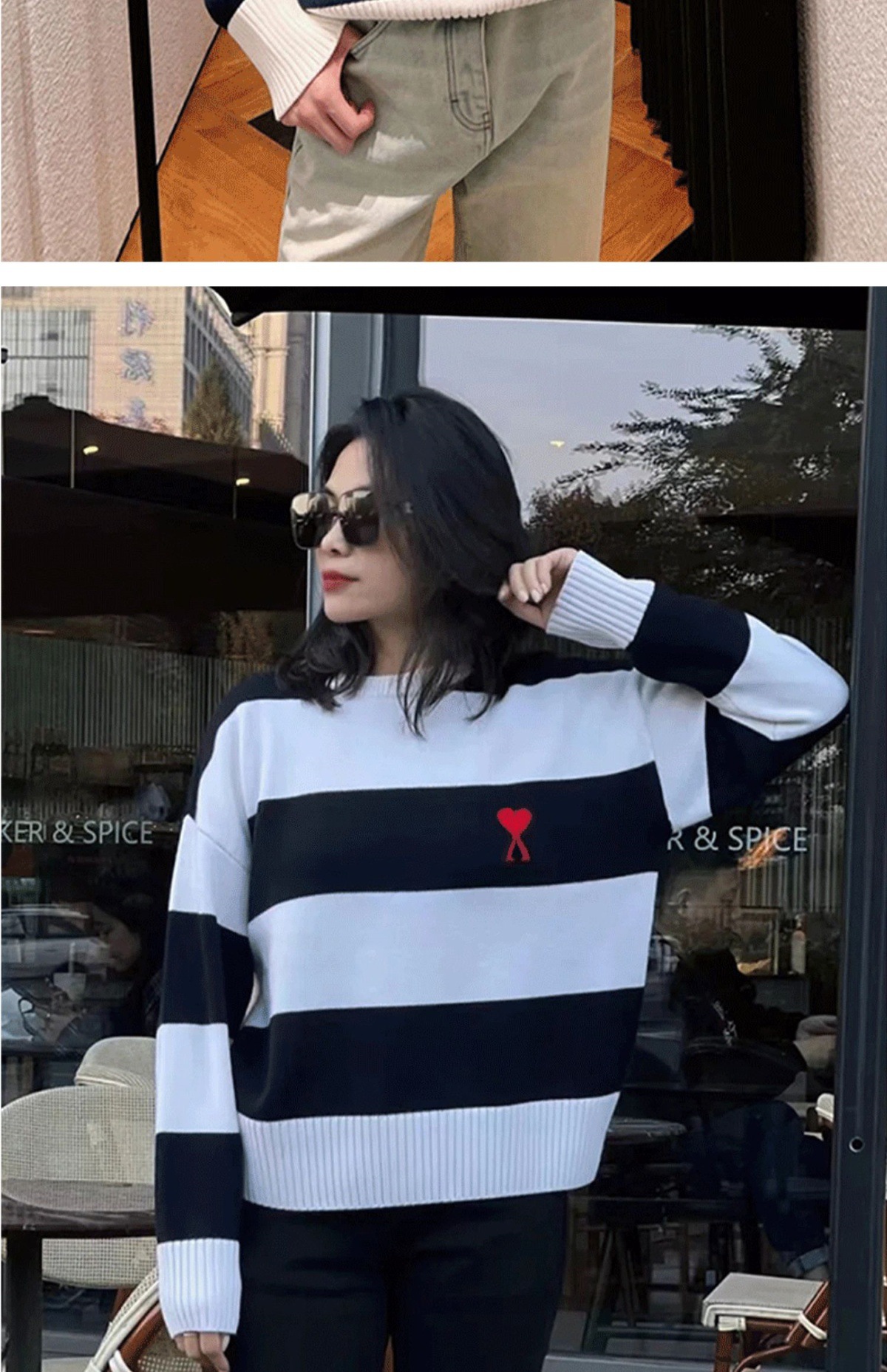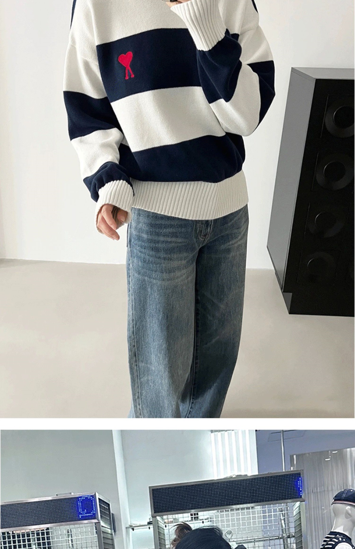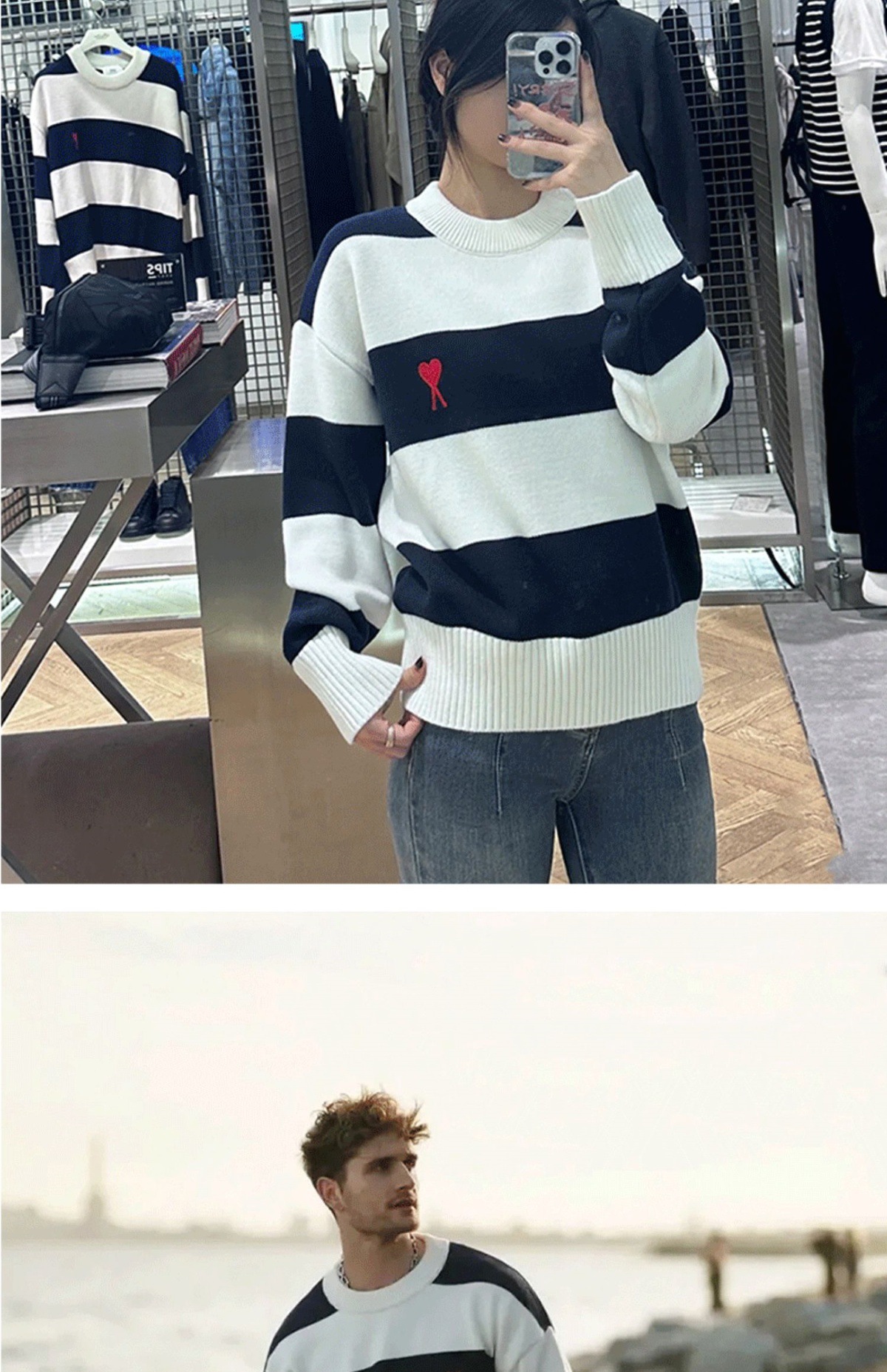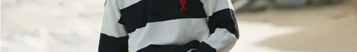 ami 25ss 클래식 작은 사랑 자수 라운드 넥 풀오버 긴팔 스웨터 남성과 여성 스트라이프 스플 라이스 스웨터스토어 가기