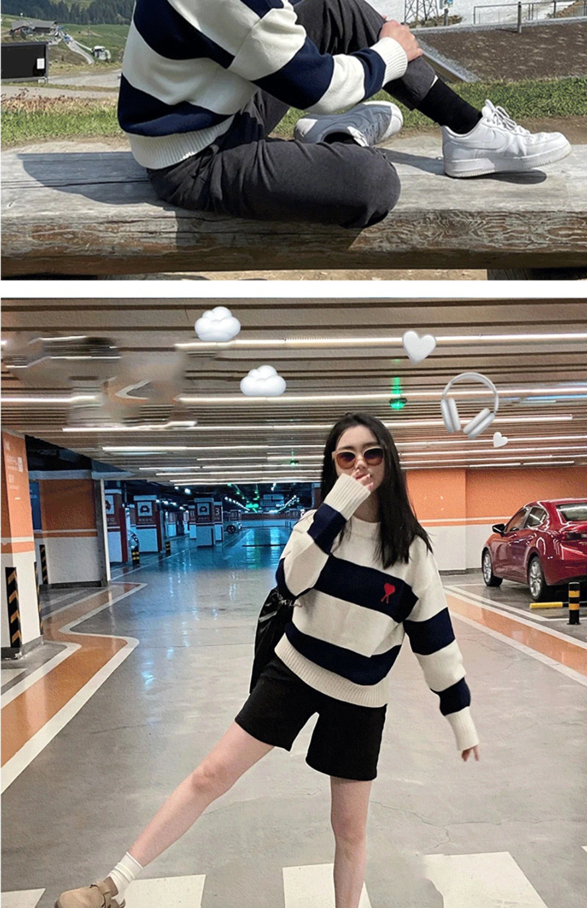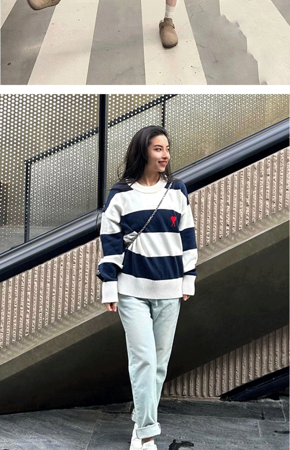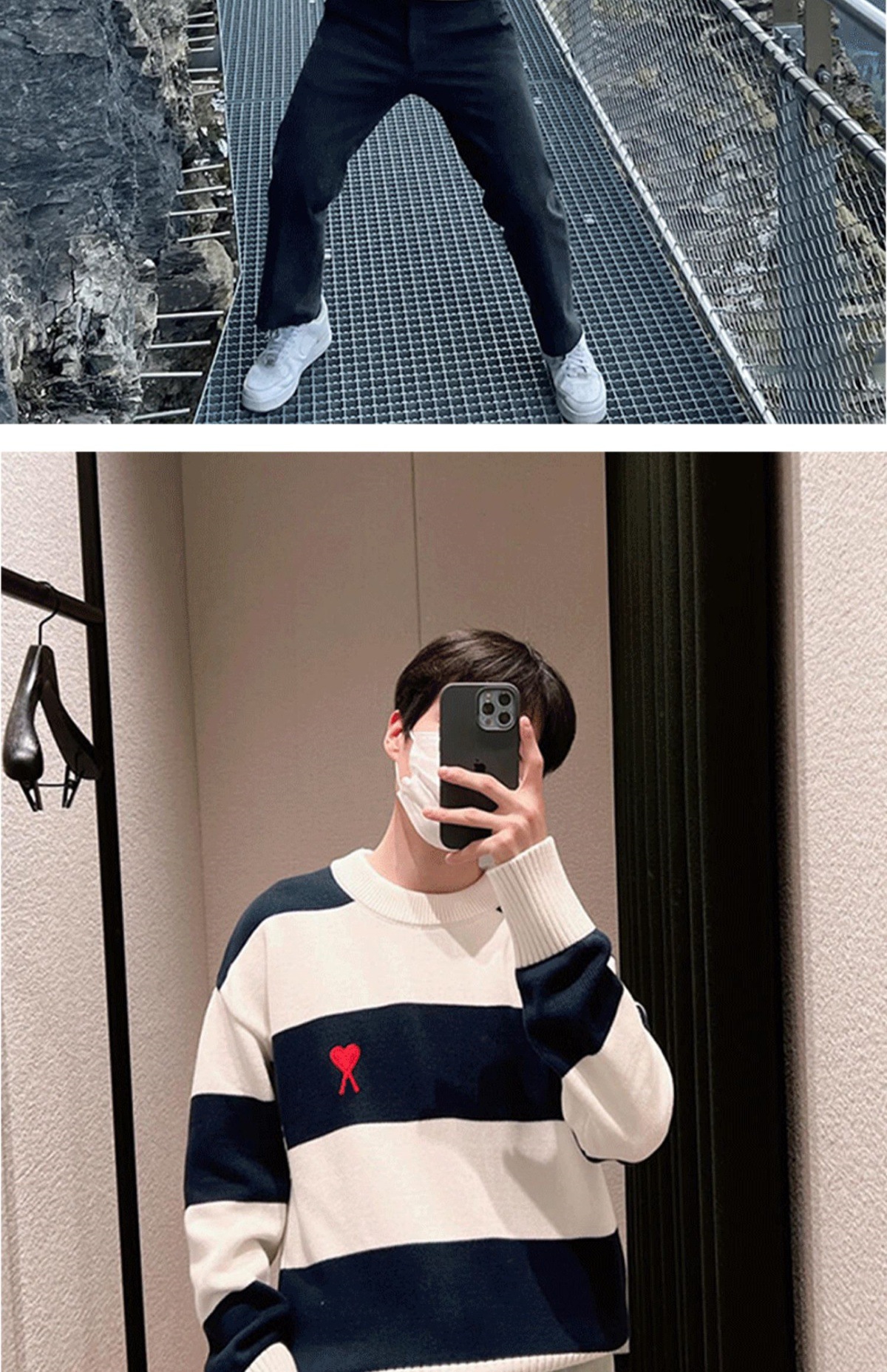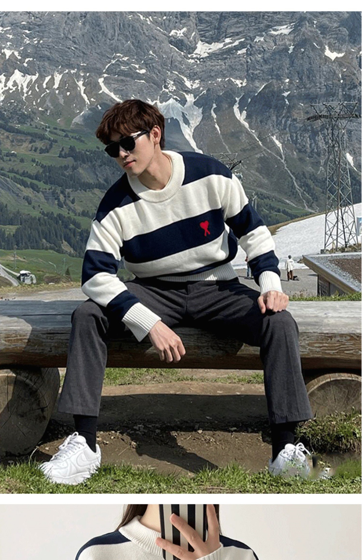 ami 25ss 클래식 작은 사랑 자수 라운드 넥 풀오버 긴팔 스웨터 남성과 여성 스트라이프 스플 라이스 스웨터스토어 가기