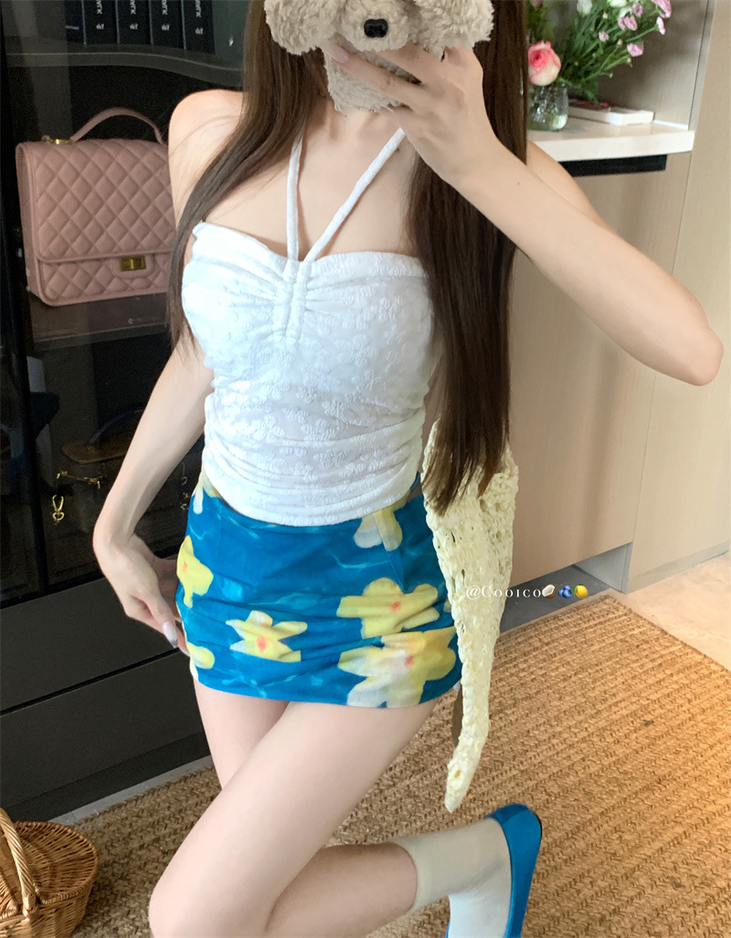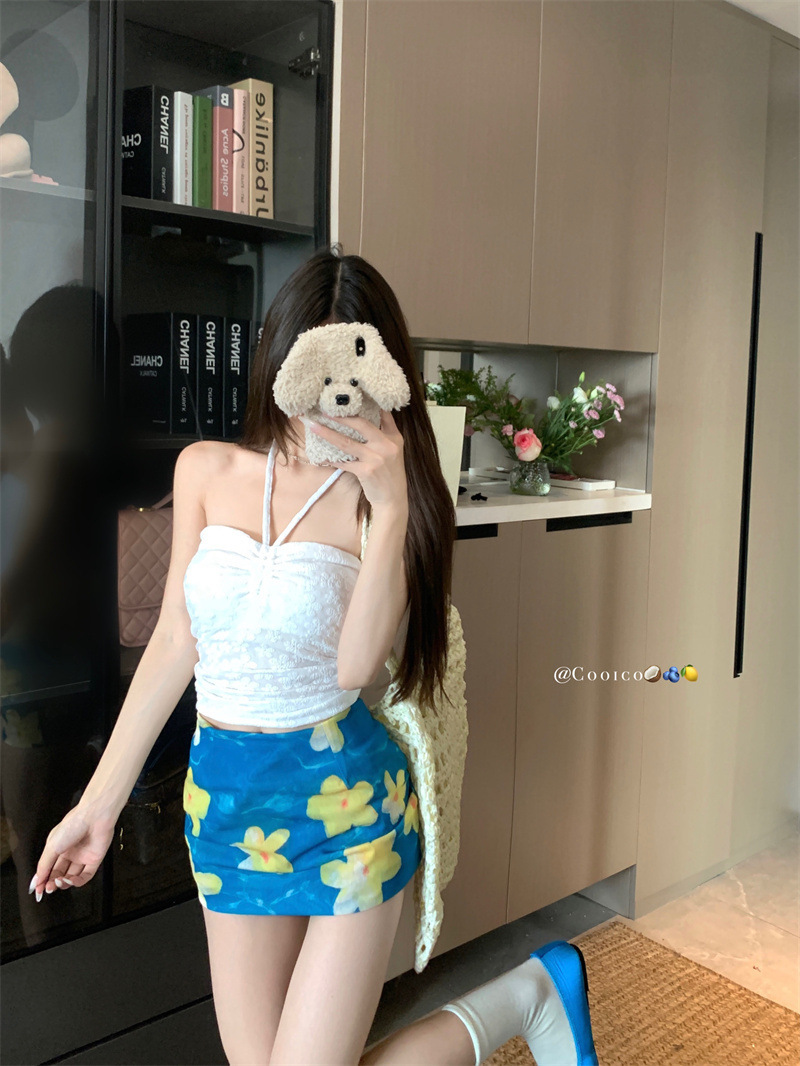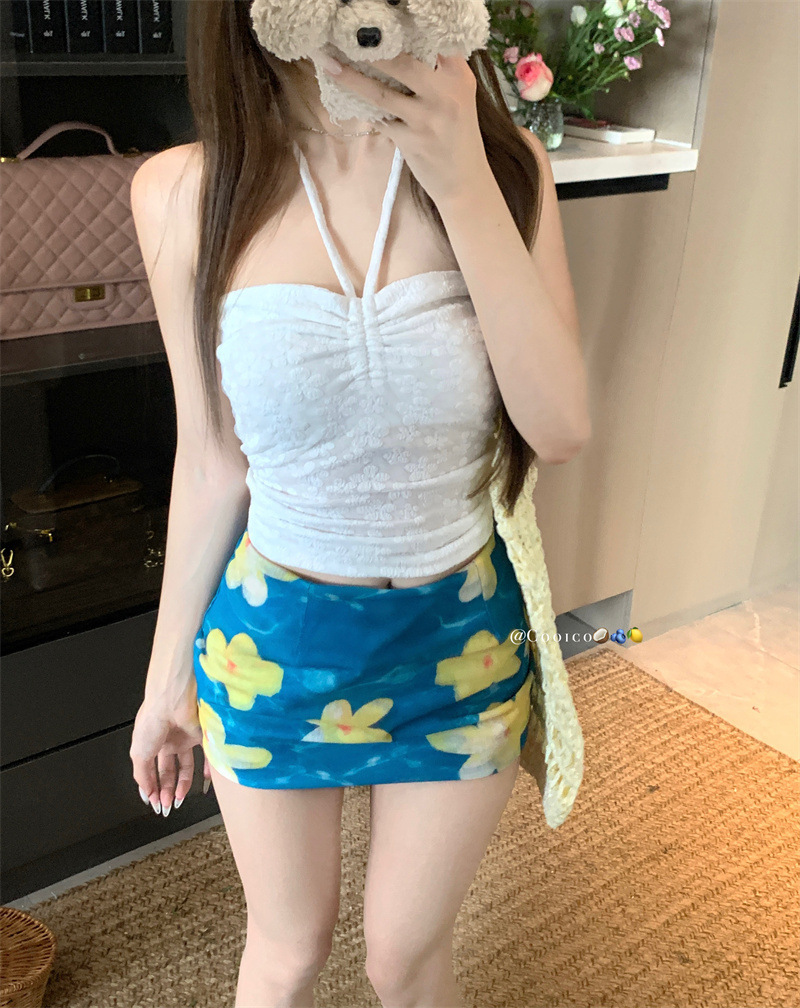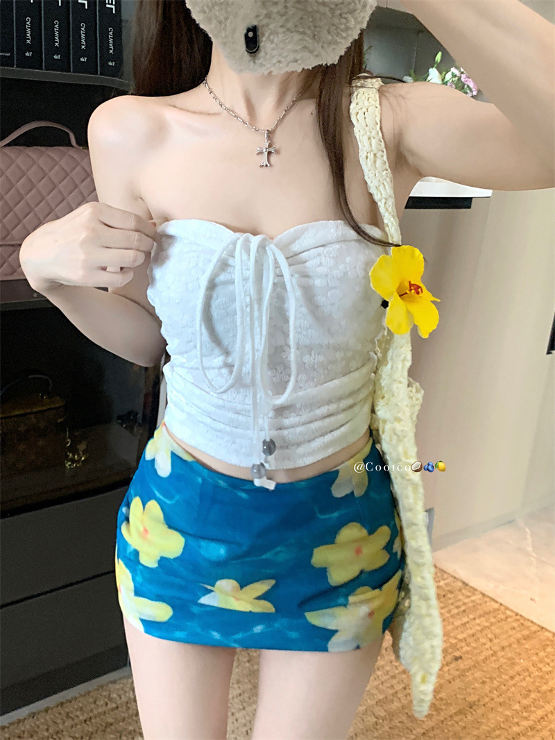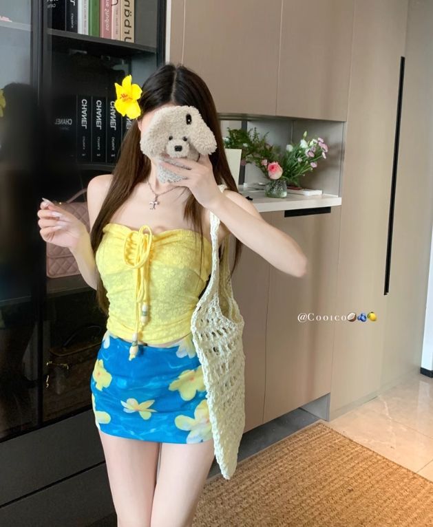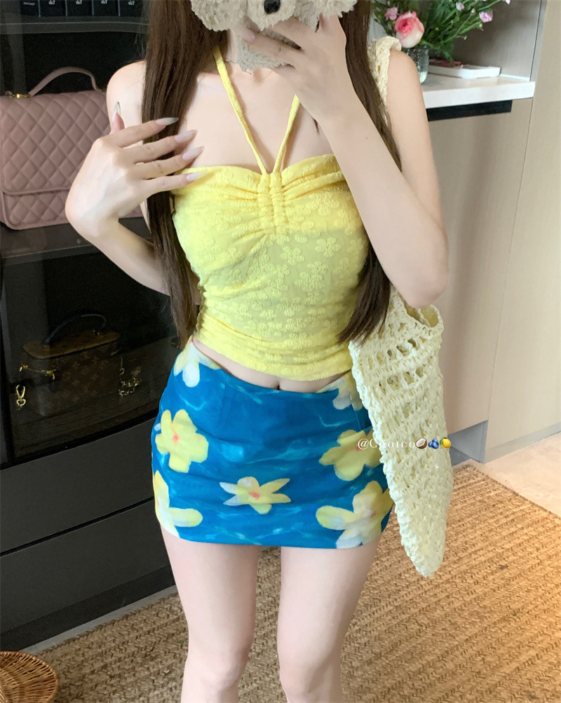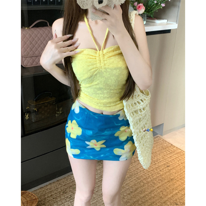 여름 해변 도파민 의상 세트 힙 커버 스커트 투피스 세트 여성용 노란색 스트랩 홀터넥 튜브 탑스토어 가기