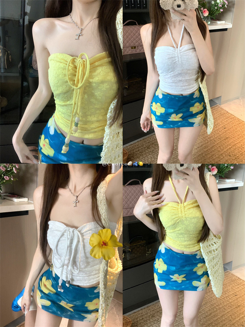 여름 해변 도파민 의상 세트 힙 커버 스커트 투피스 세트 여성용 노란색 스트랩 홀터넥 튜브 탑
