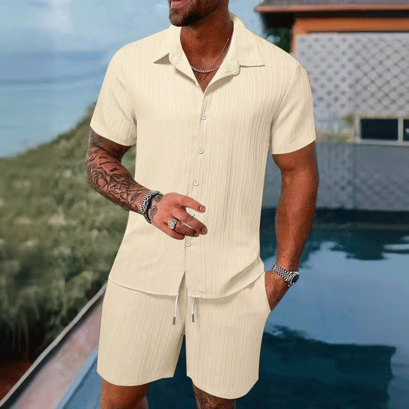 유럽과 미국의 국경 간 여름 Amazon AliExpress 남성 셔츠 캐주얼 루즈 코튼 린넨 반팔 반바지 비치 슈트