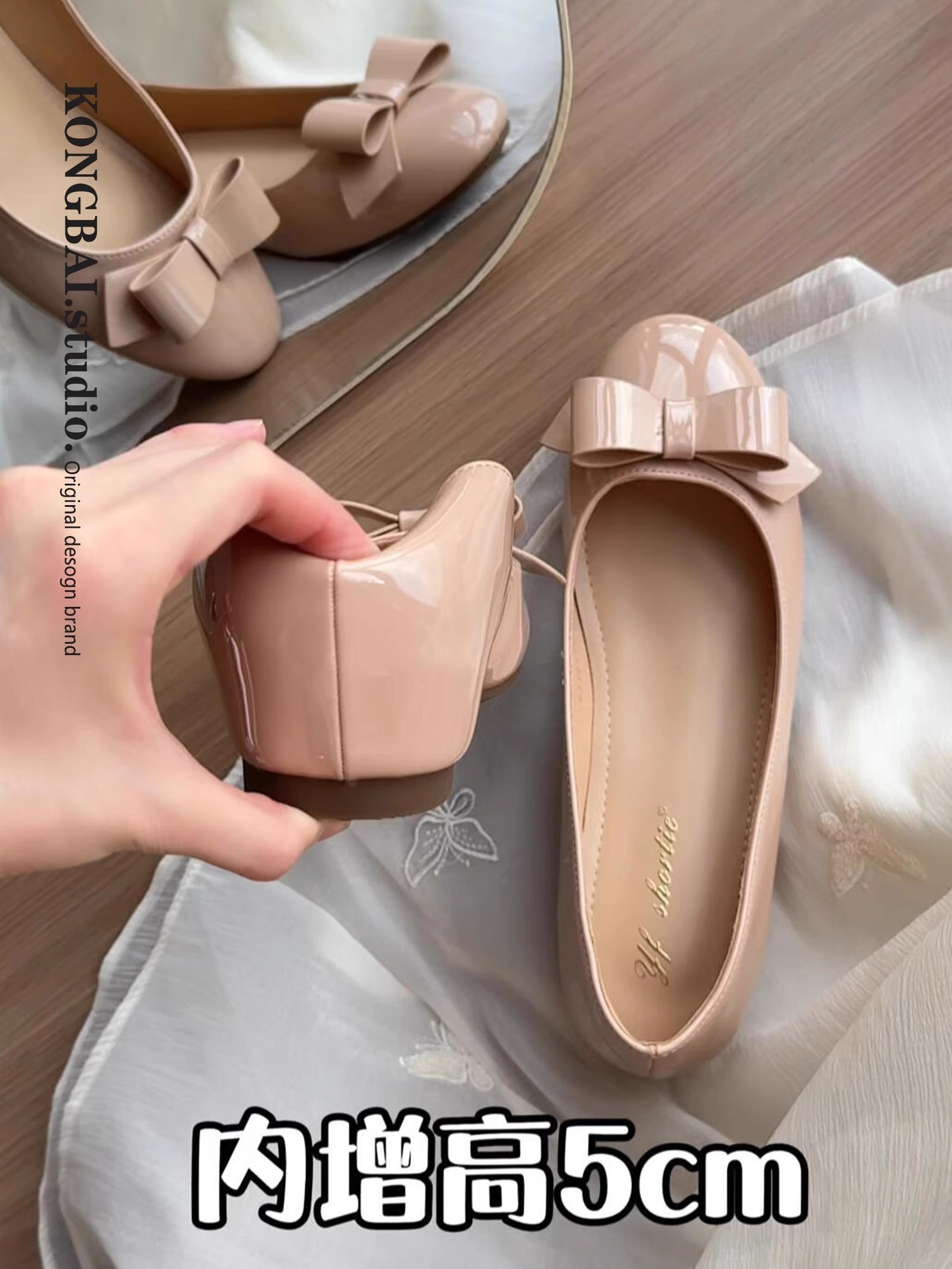 키 작은 여성을 위한 키높이 누드 컬러 싱글 슈즈, 2026년 봄 여름 신상, 리본 장식, 출퇴근용, 다용도 플랫 발레 슈즈