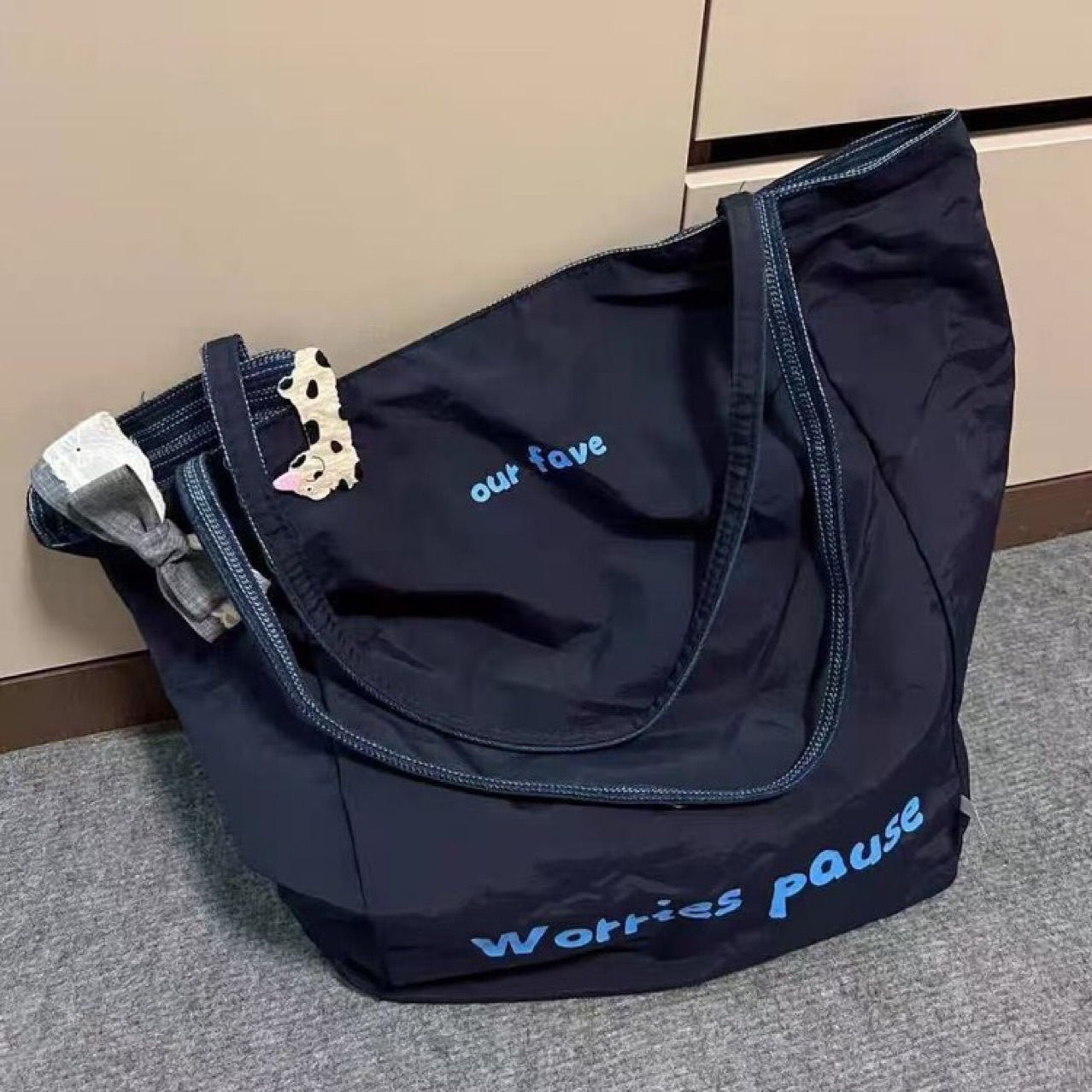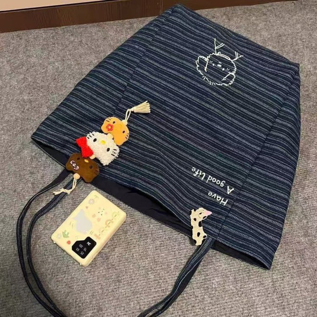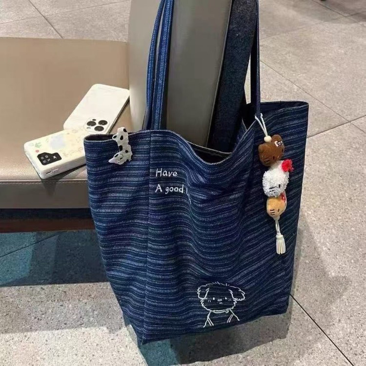 다재다능한 한국 데님 양면 캔버스 가방 2025 새로운 자수 가방 캐주얼 대용량 학생 숄더백