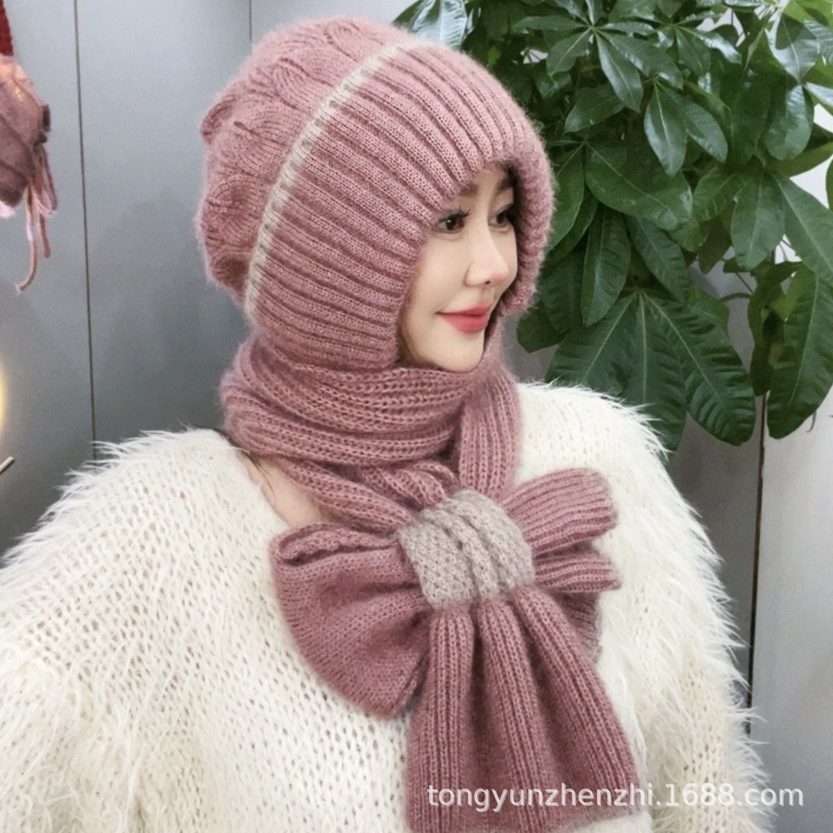 겨울 신상 플러시 니트 모자와 스카프 일체형 따뜻하고 방풍 플러스 벨벳 스카프와 토캡으로 추위와 눈을 막아줍니다.스토어 가기