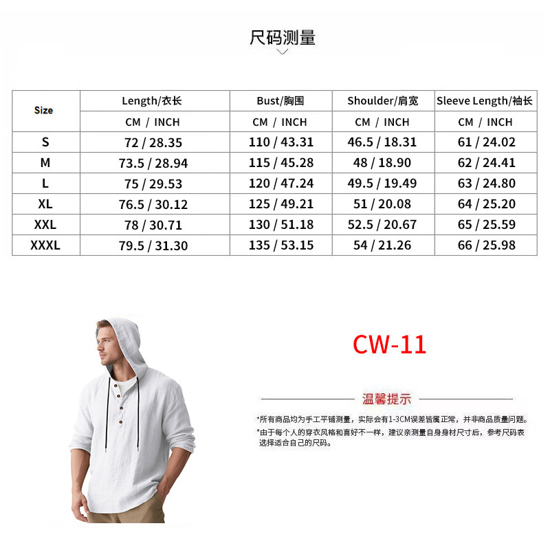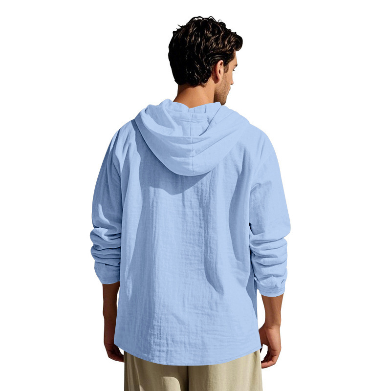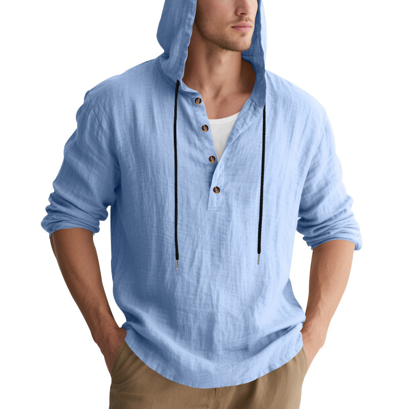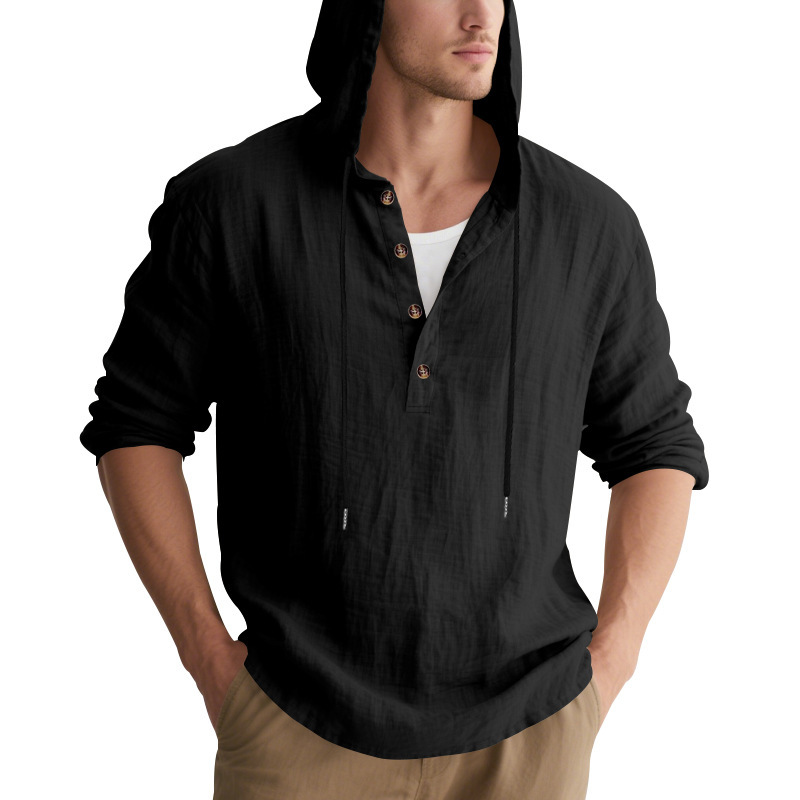 국경 간 Amazon 봄, 가을 미국 루즈한 린넨 남성용 통기성 후드 긴팔 비치 헨리 바닥 셔츠 남성용스토어 가기