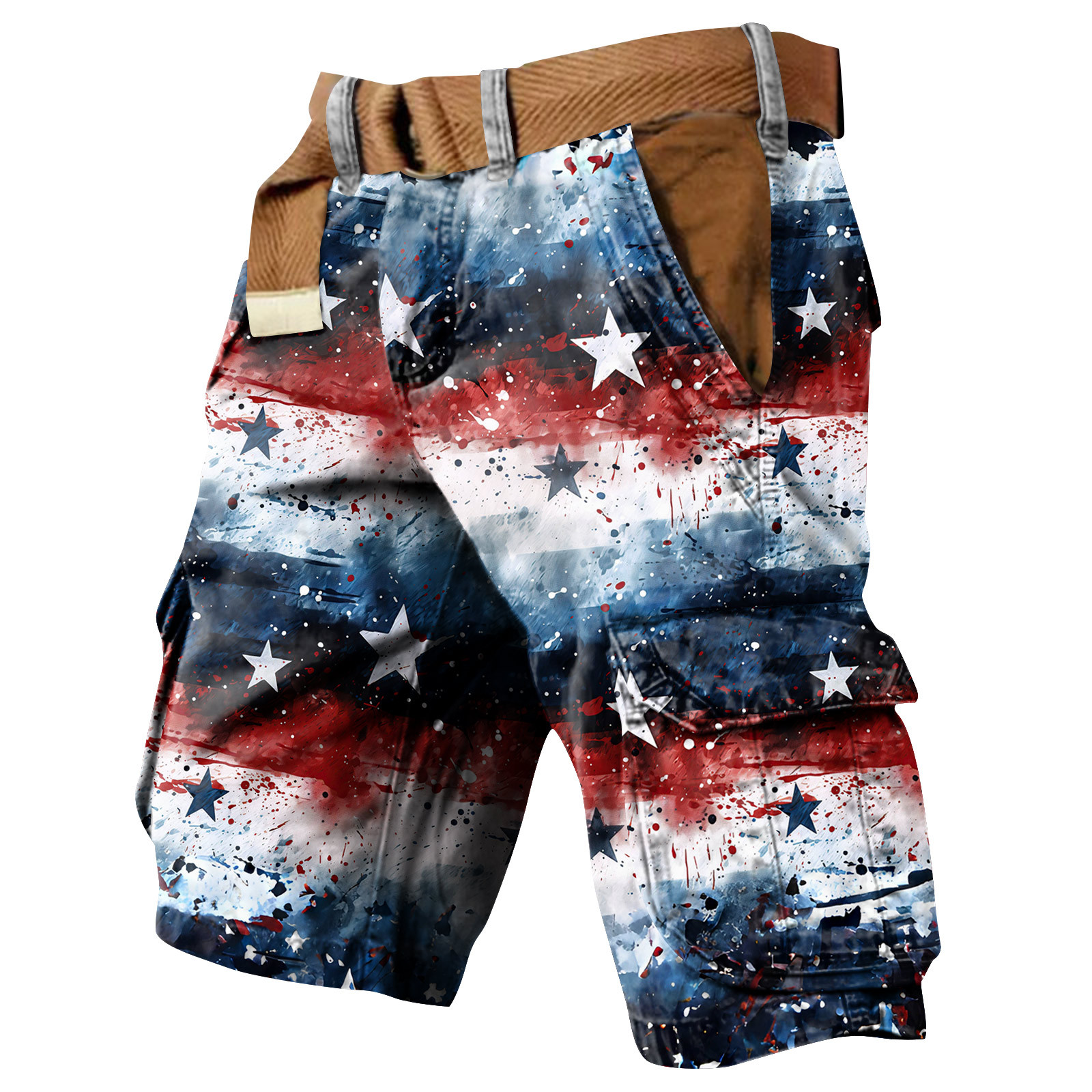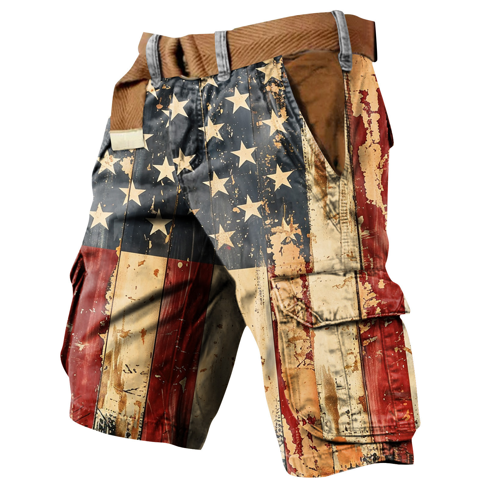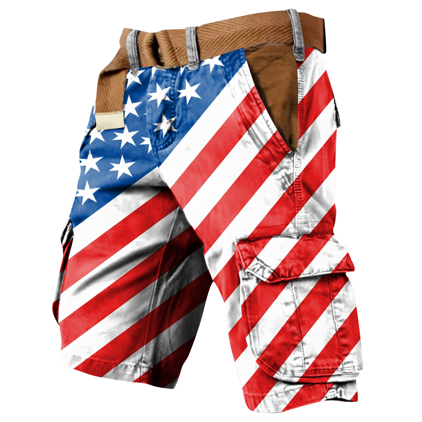 2025 유럽과 미국의 국경 간 남성 복고풍 국기 독립 기념일 멀티 포켓 프린트 벨트리스 카고 반바지 능직