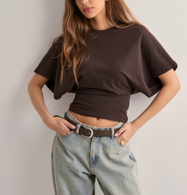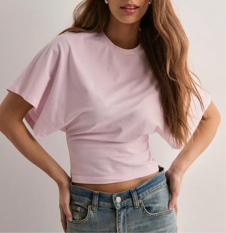 2025 국경 간 유럽과 미국 여름 새로운 한국 스타일 디자인 라운드 넥 풀오버 반팔 티셔츠 세련된 짧은 단색 여성 의류스토어 가기