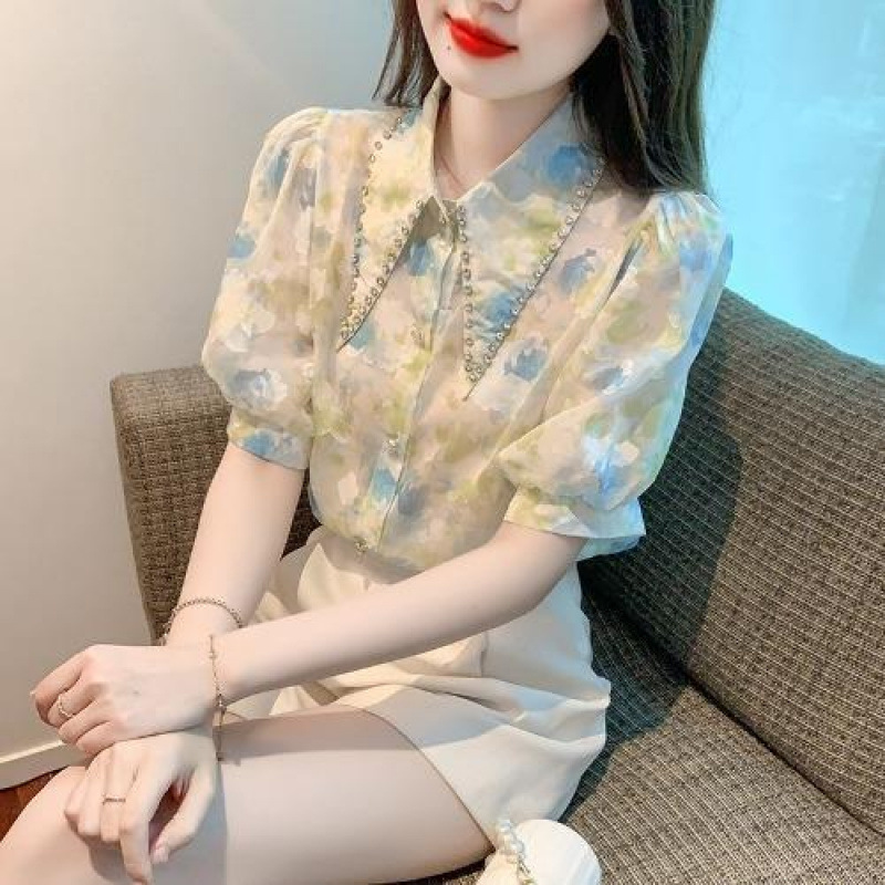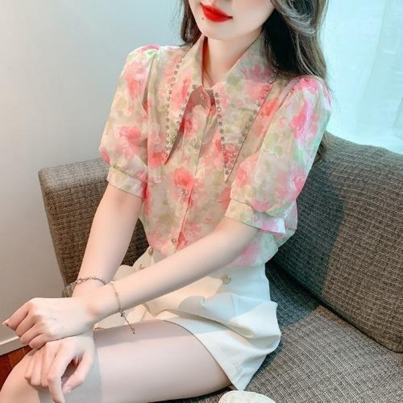 여름 반팔 쉬폰 셔츠 세련된 여성 여름 착용 2025 새로운 프렌치 스위트 플로럴 탑 디자인