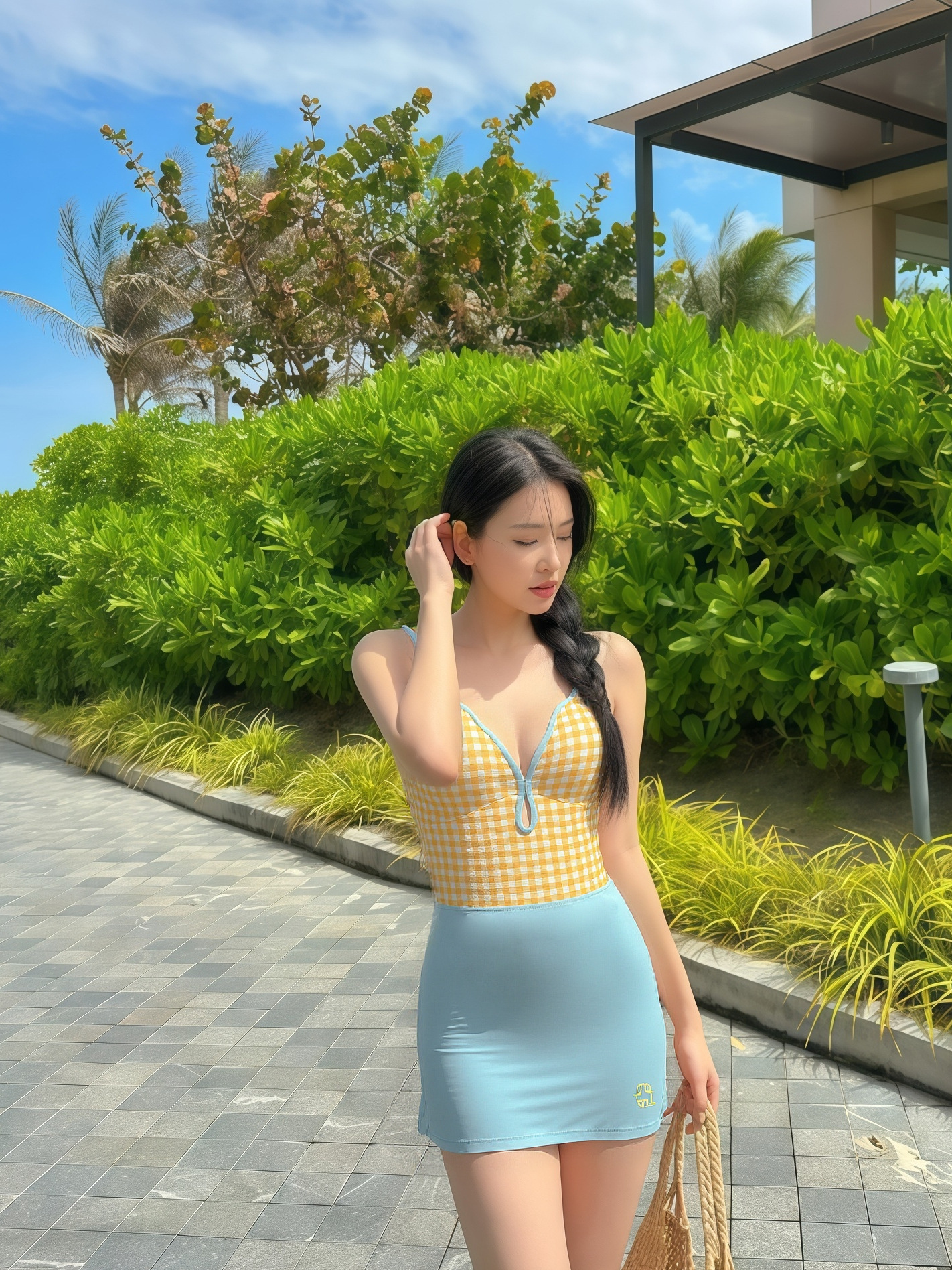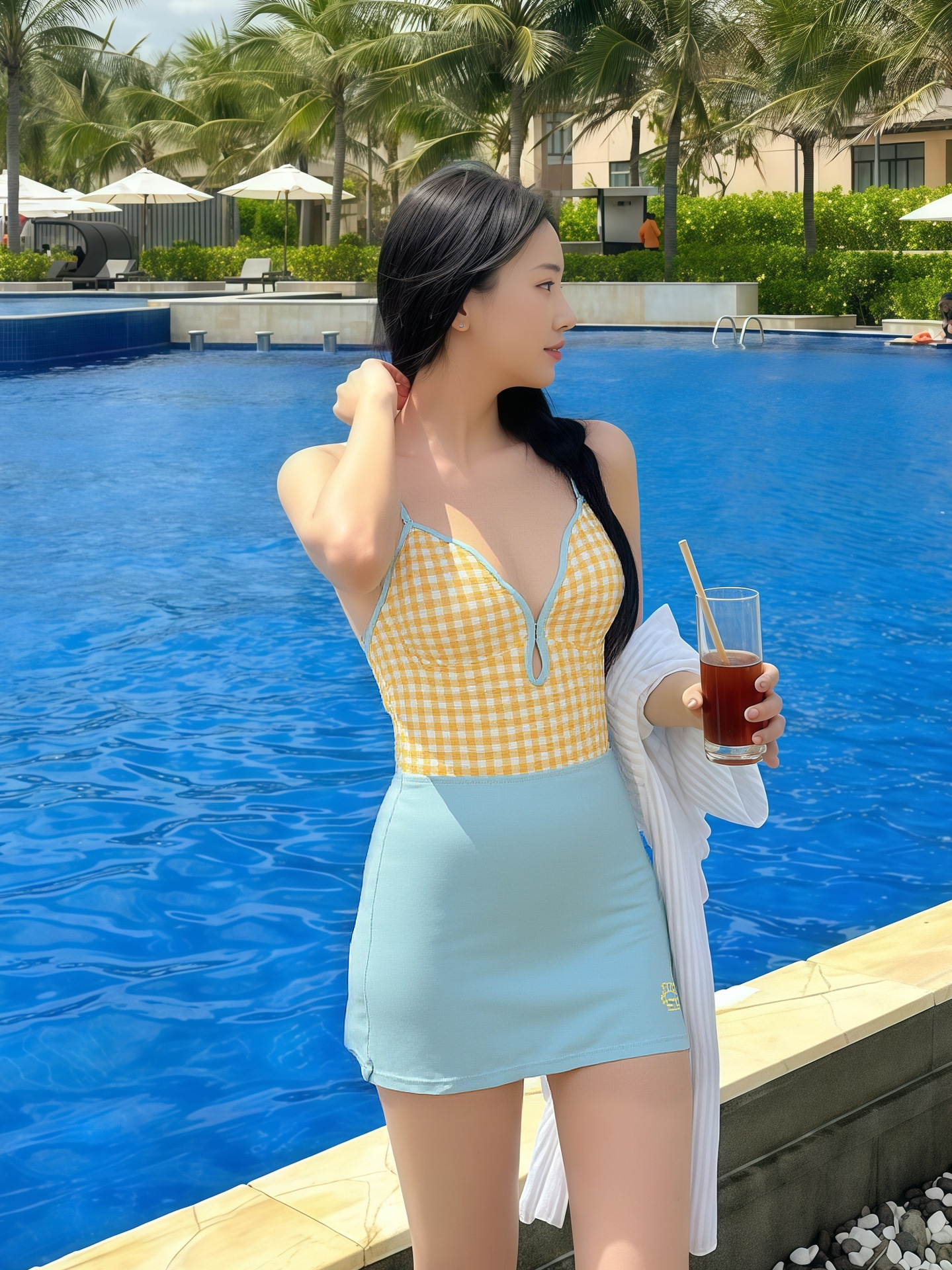 • 노란색 체크무늬 비키니 + 하늘색 스커트