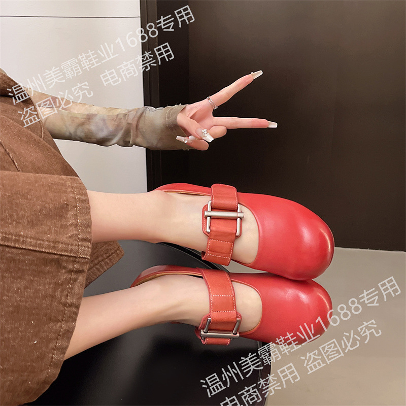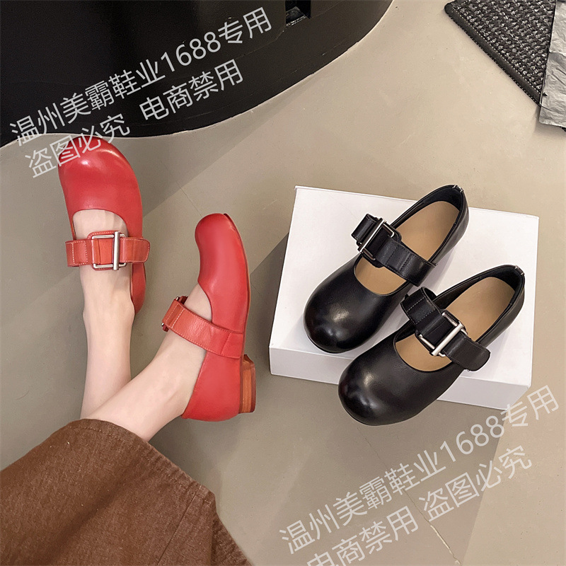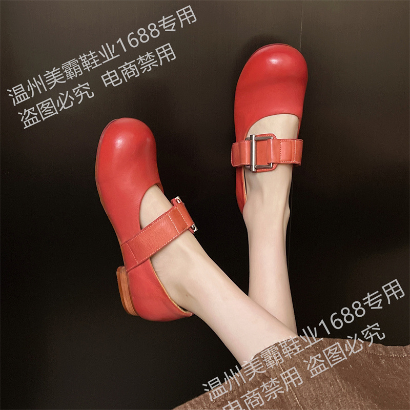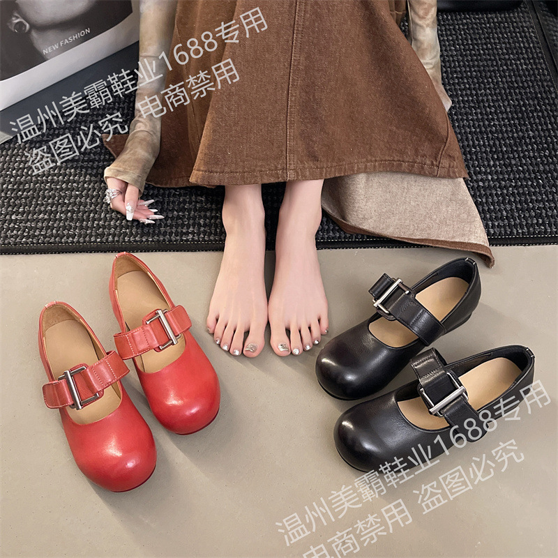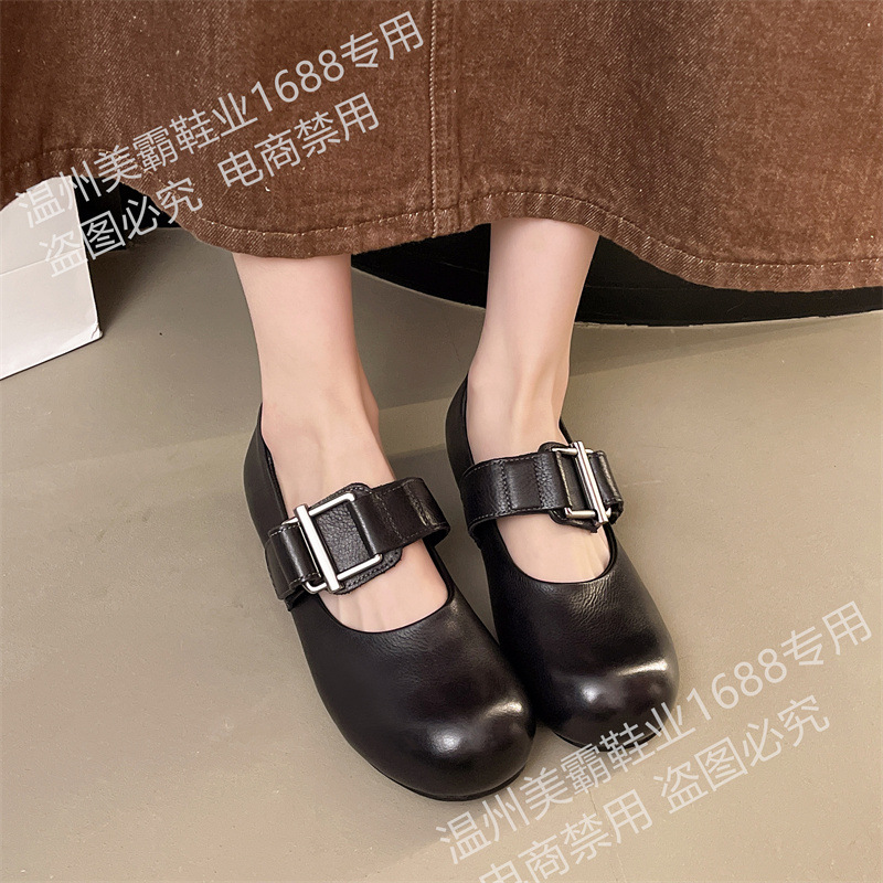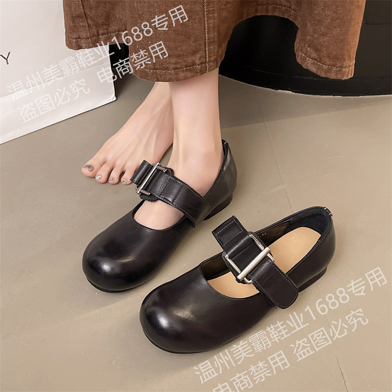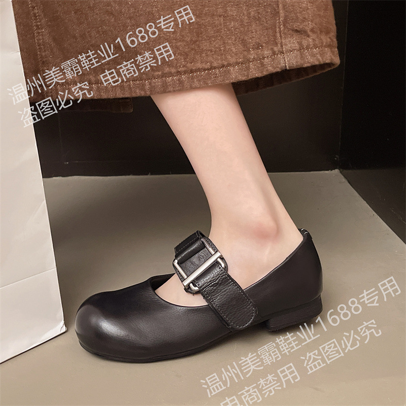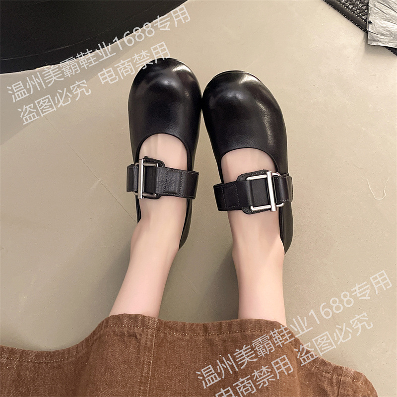 여성을위한 말 가죽 금속 버클 로퍼 2025 여름 새로운 라운드 발가락 대학 스타일 낮은 굽 정품 가죽 작은 신발 다목적스토어 가기