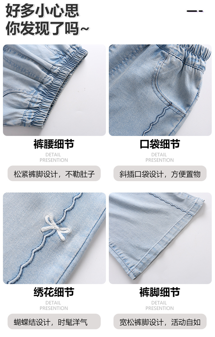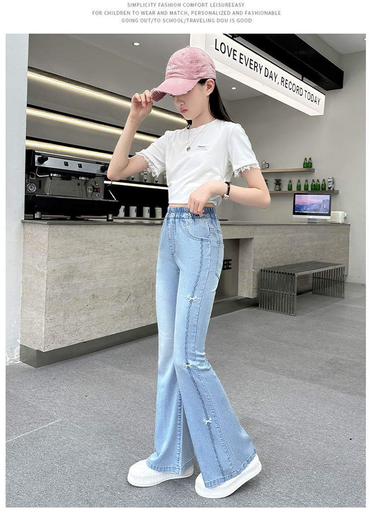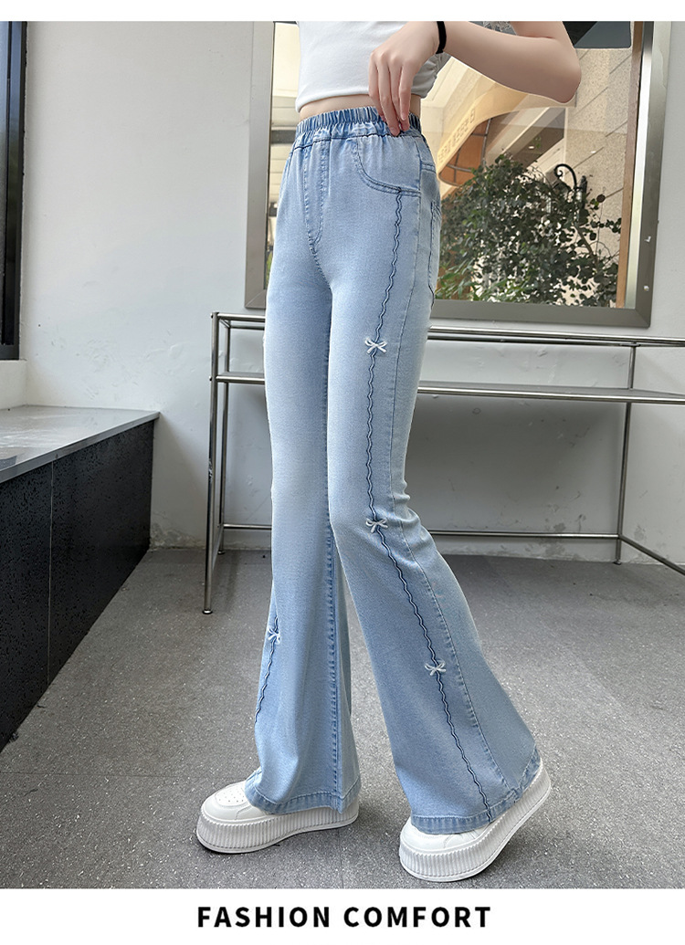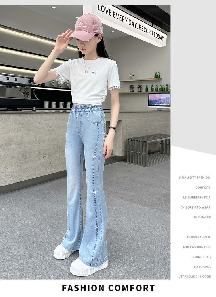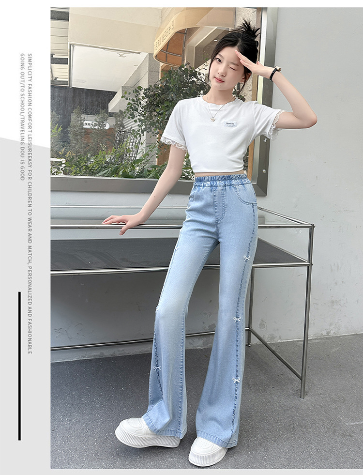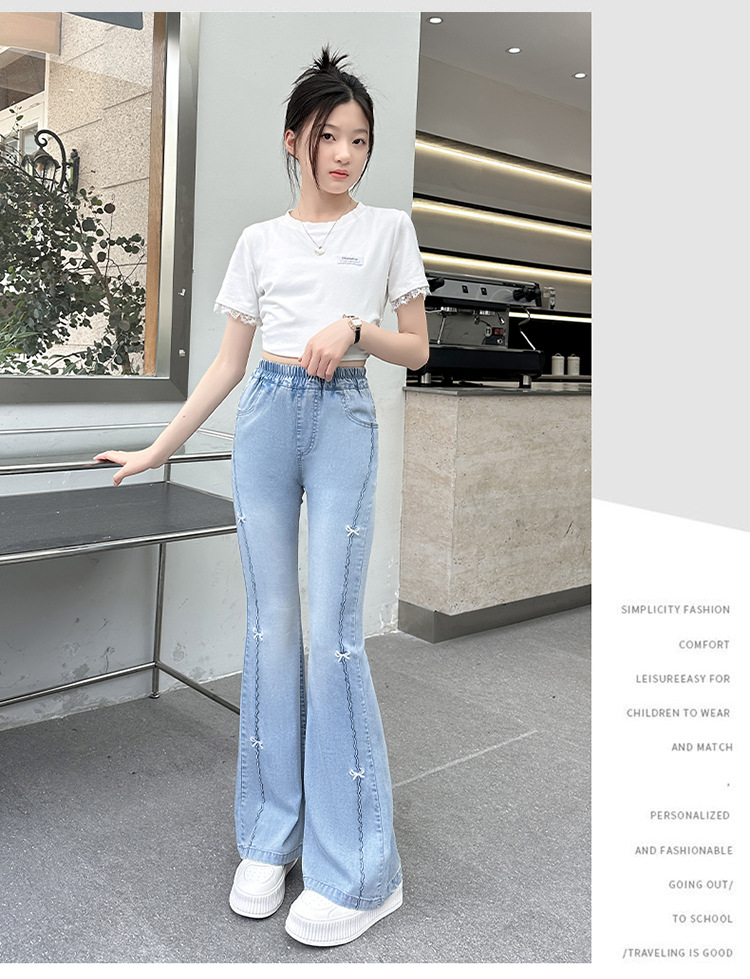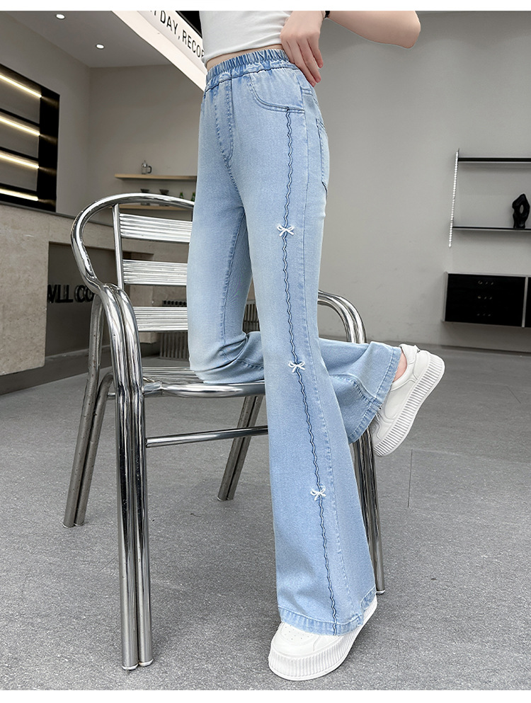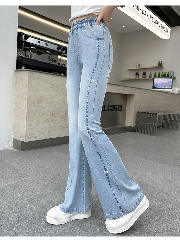 여아 바지 여름 2026 신상 한국 스타일 세련된 얇은 청바지 아동용 중대형 아동용 리본 플레어 팬츠