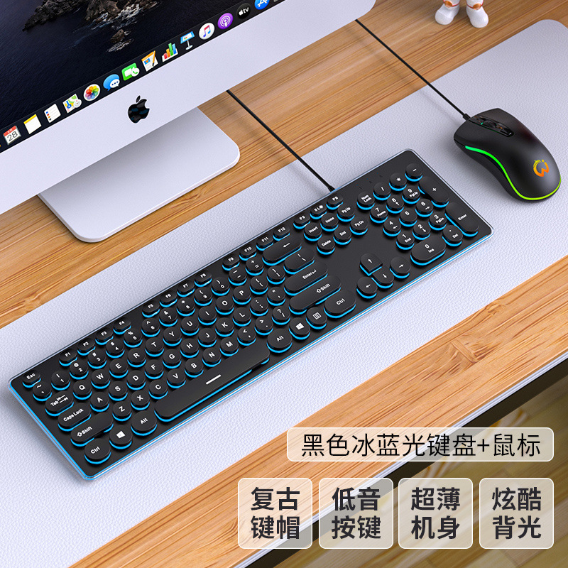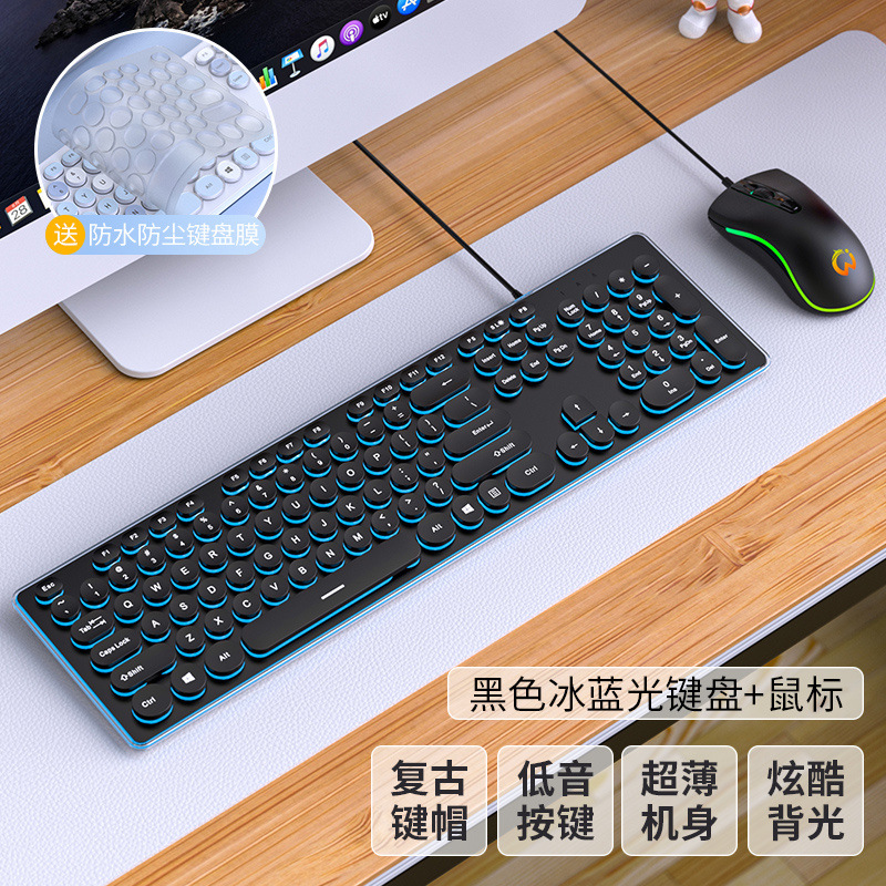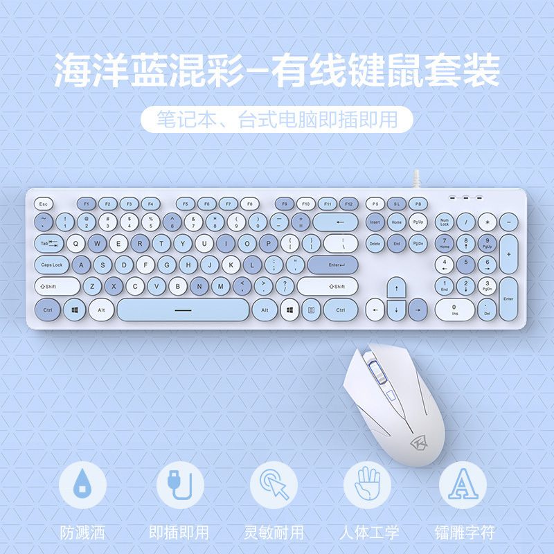 • 가로 파란색과 흰색 무광택 버전 - 원형 키캡 - 패키지 3: 키보드 + 마우스 + 키보드 필름