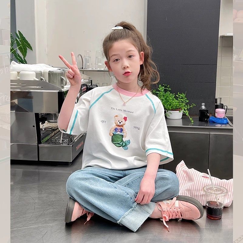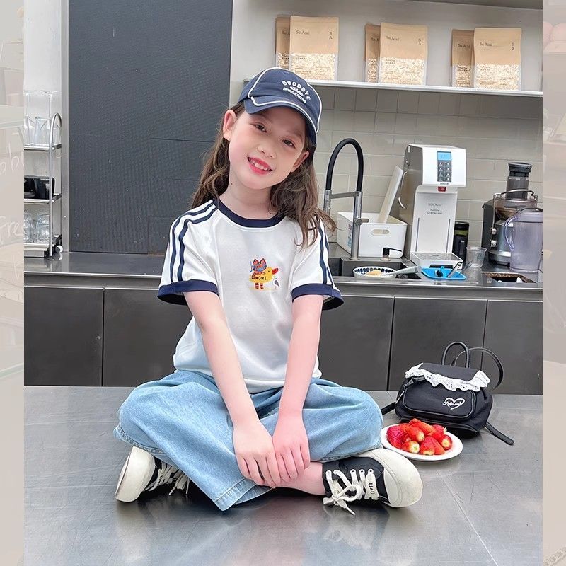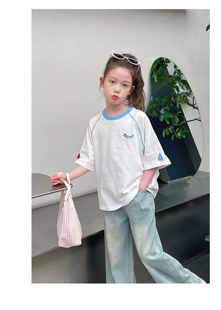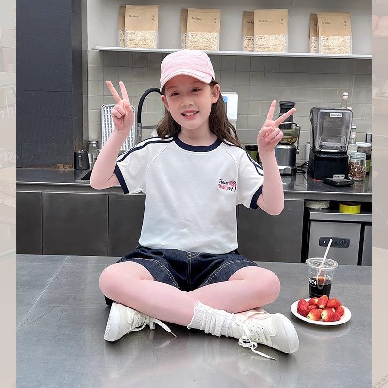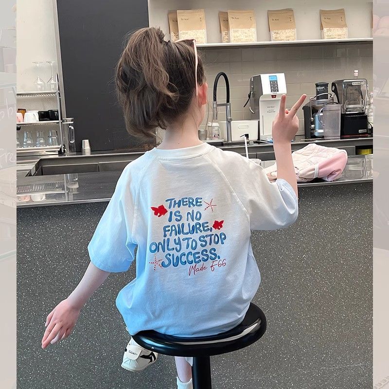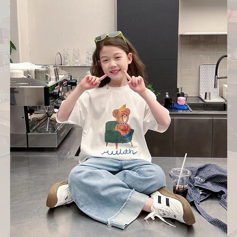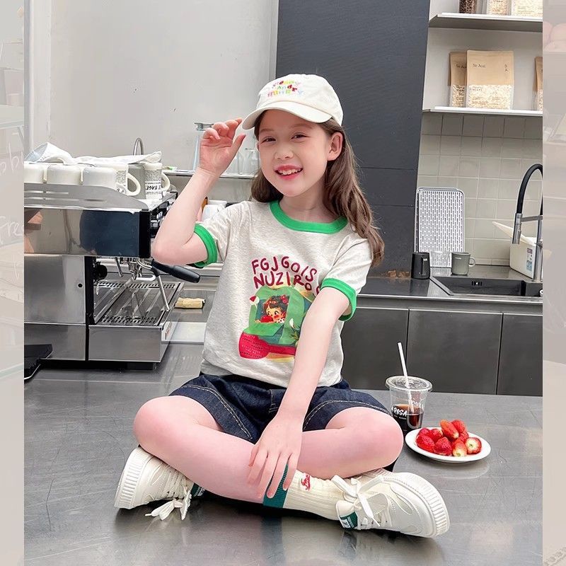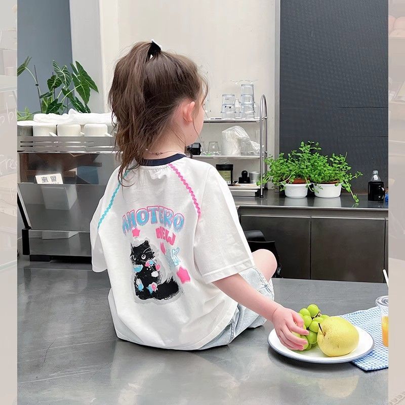 아동 패션 인터넷 연예인 반팔 흰색 티셔츠 소녀 유행 느슨한 한국 스타일 탑 큰 아동복 2025 여름 새 스타일스토어 가기