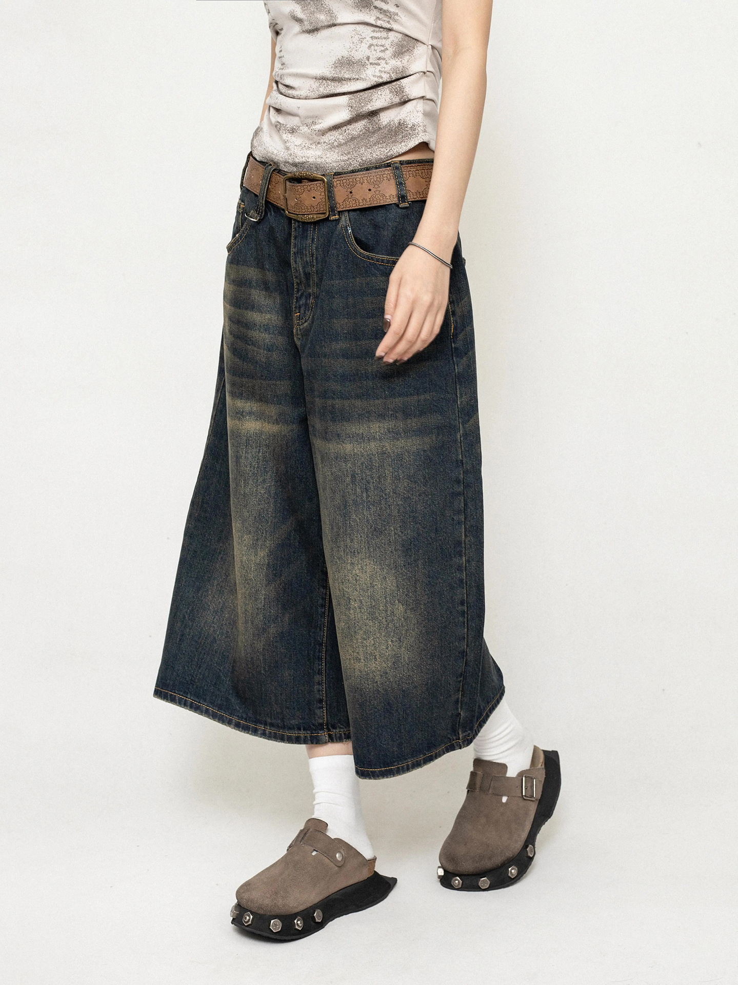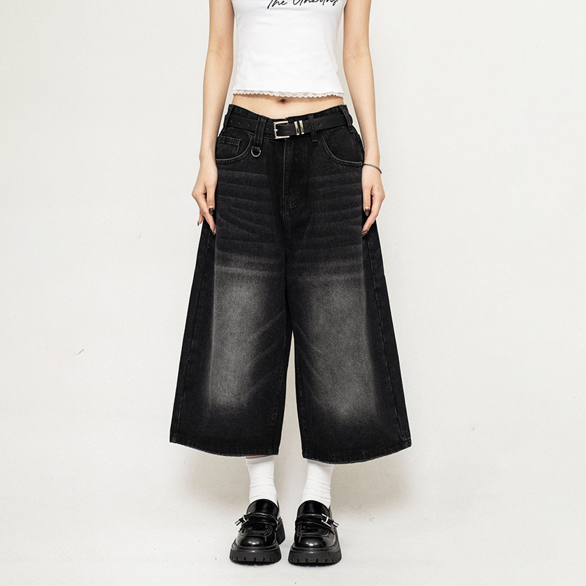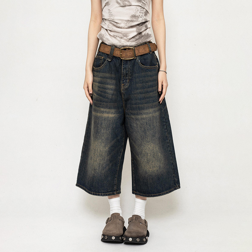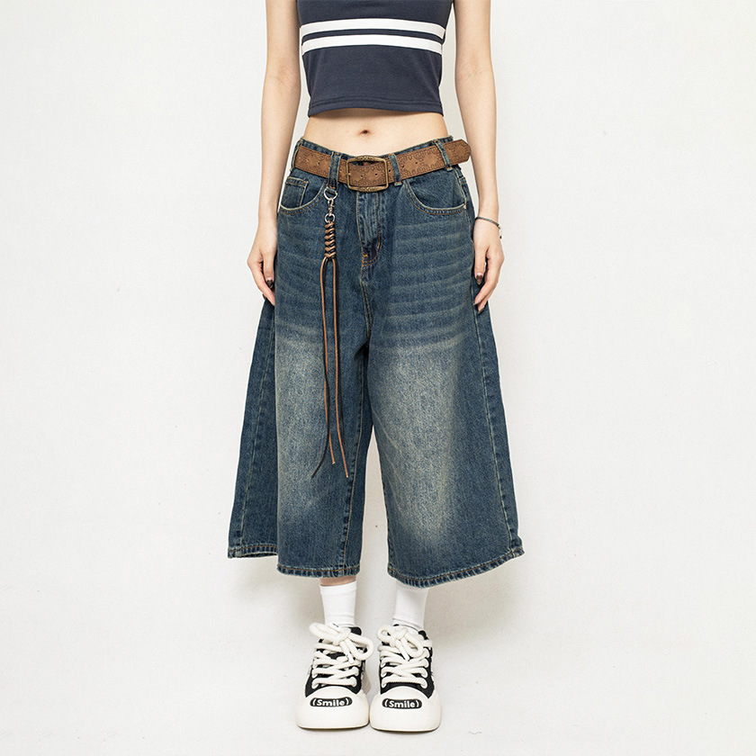 여름 아메리칸 레트로 루즈핏 여성용 디스트레스드 7부 데님 하이 스트리트 디자인 와이드 레그 7부 팬츠 여름 크로스스토어 가기