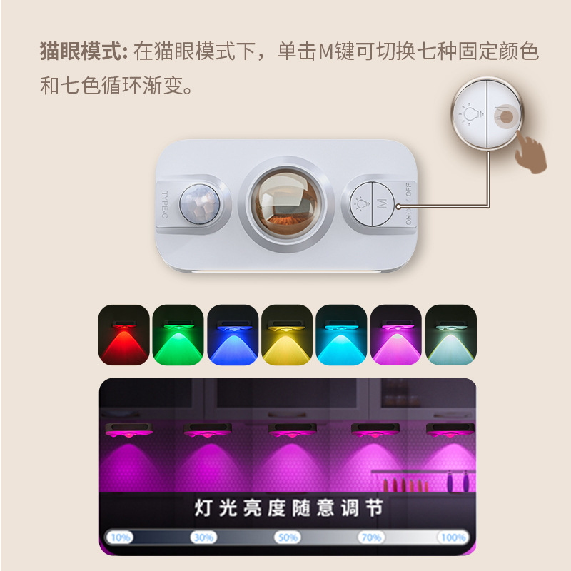 RGB 컬러 분위기 야간 조명 새로운 국경 간 지능형 인체 유도 램프 측면 발광 고양이 눈 효과 충전식 램프