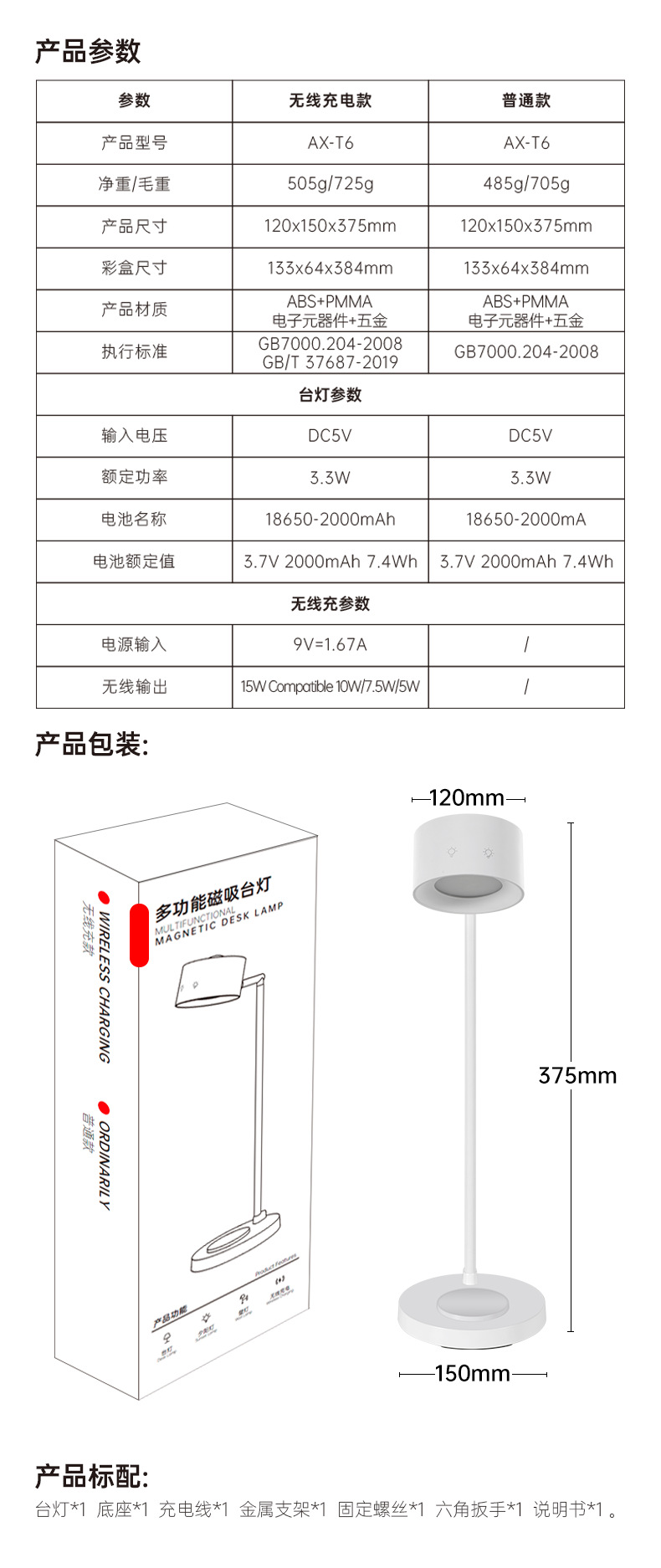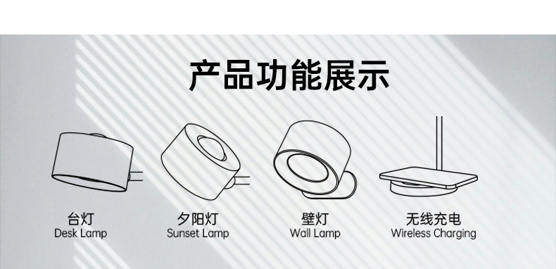 产品内配:灯头*1, 底座*1, 壁灯灯座 *1,充电线*1,金属支架*1,固定螺丝*1,六角扳手*1, 说明书*1
