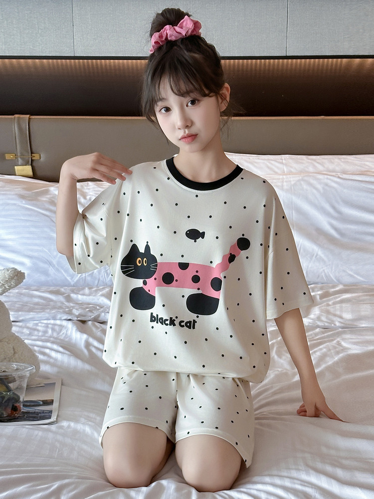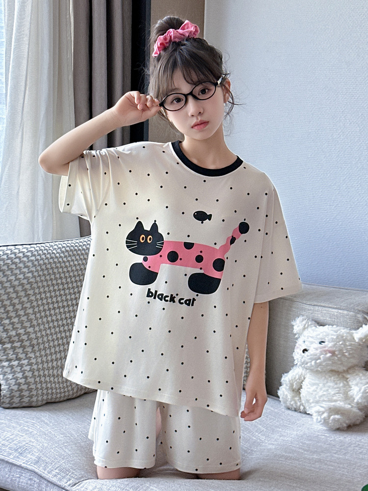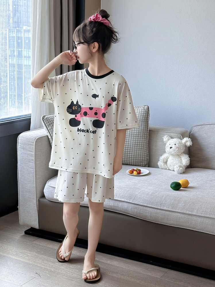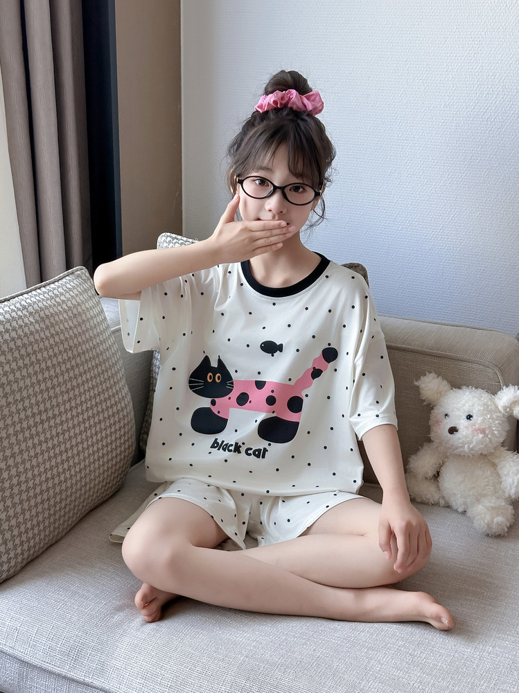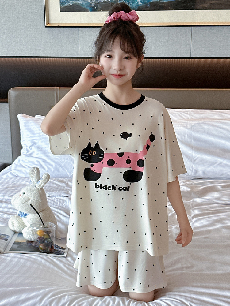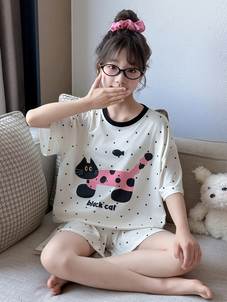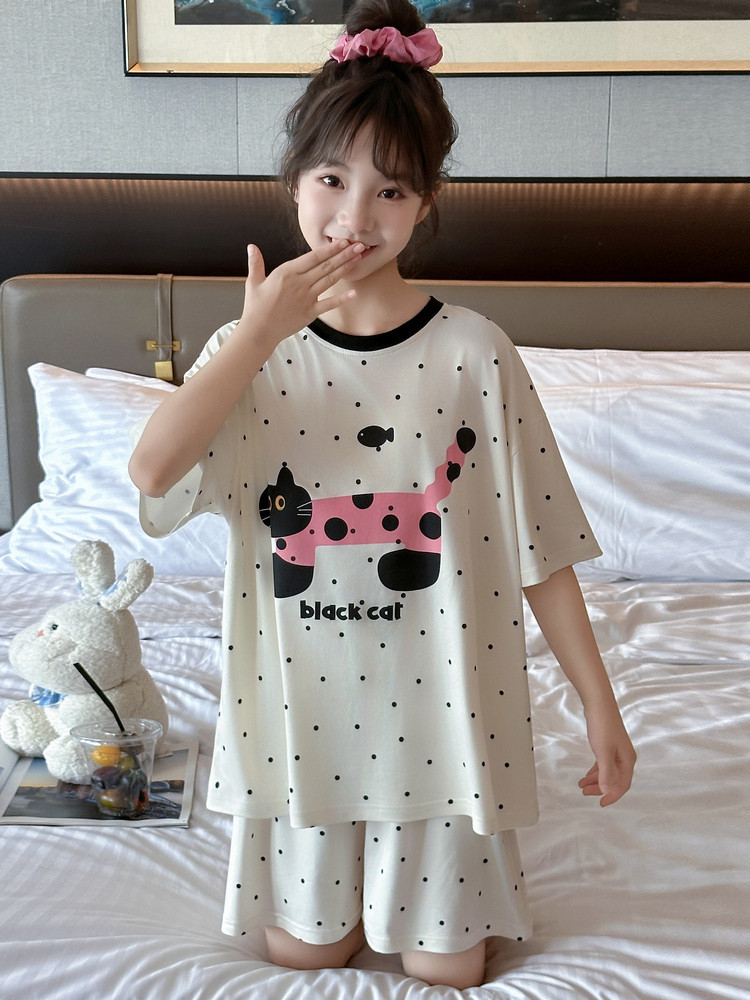 여자 잠옷 여름 2025 새로운 스타일 중학생 여자 반팔 반바지 정장 여자 어린이 서양식 가정복 얇은