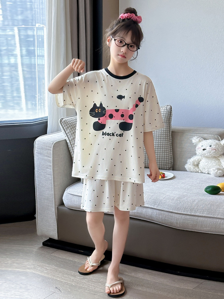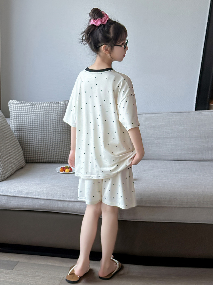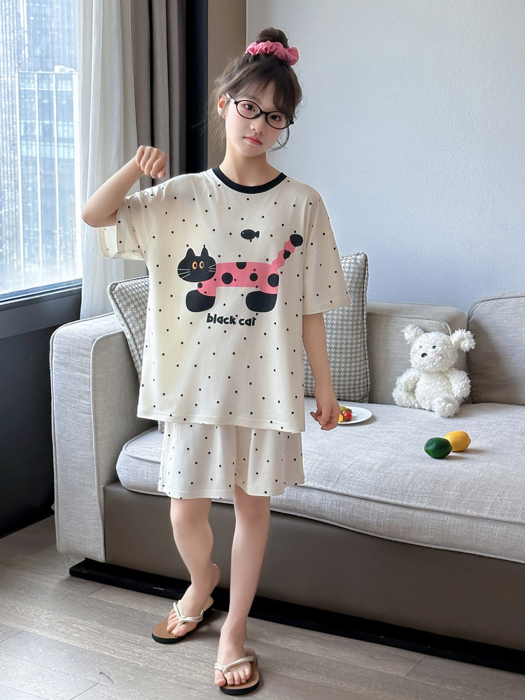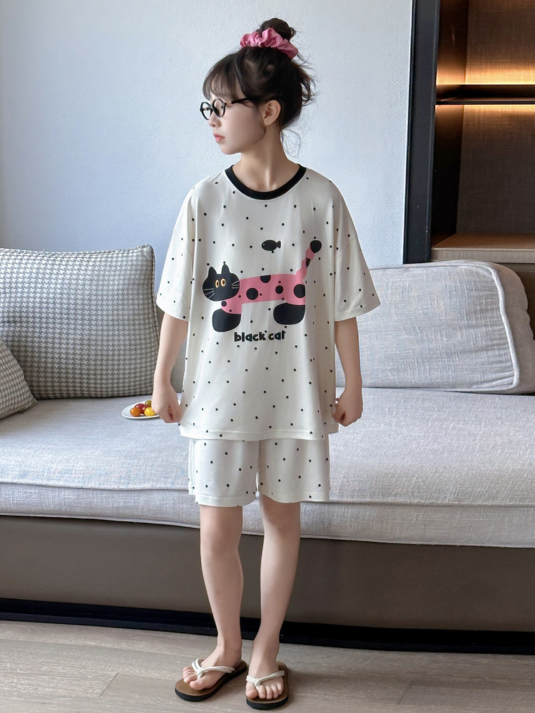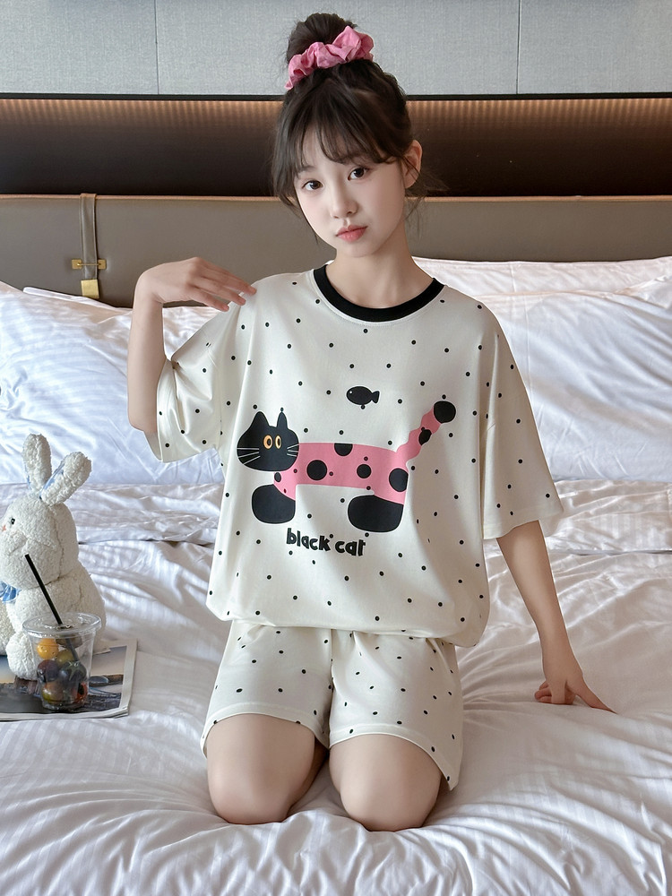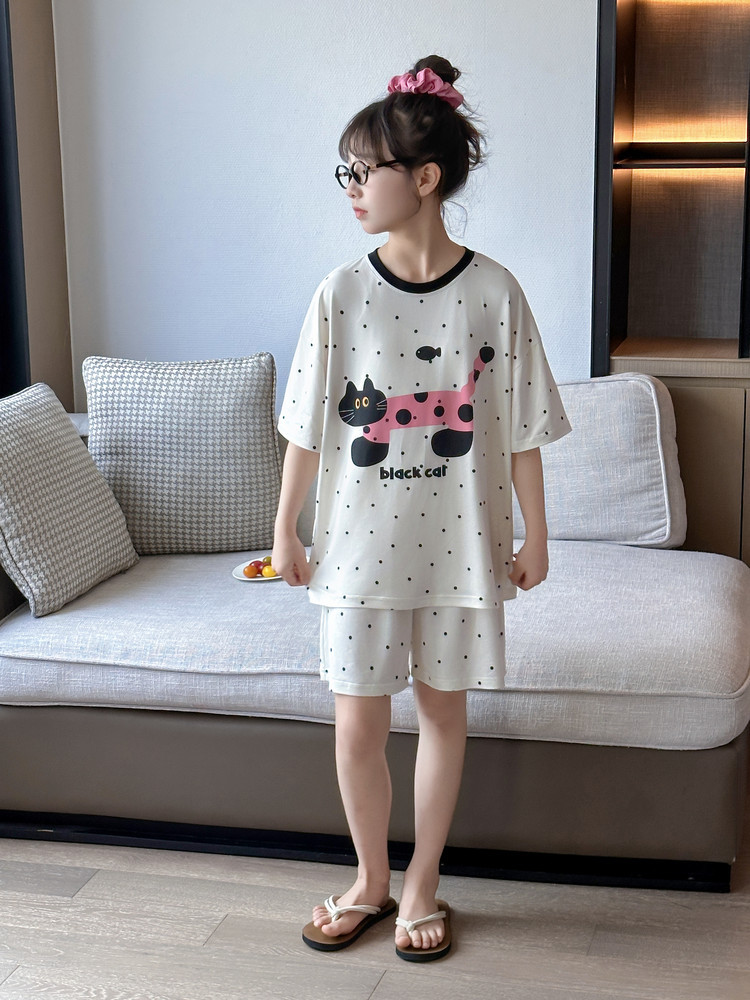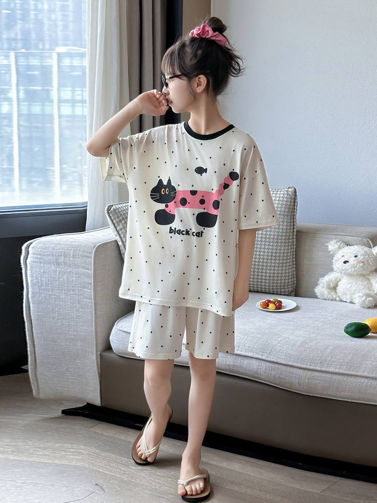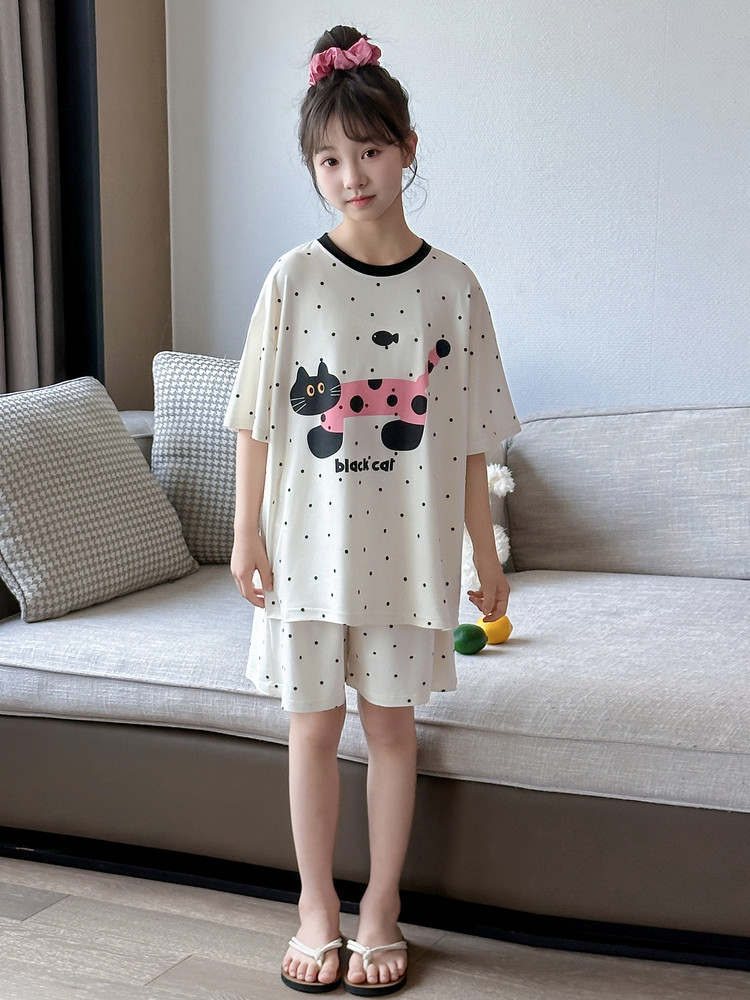 여자 잠옷 여름 2025 새로운 스타일 중학생 여자 반팔 반바지 정장 여자 어린이 서양식 가정복 얇은