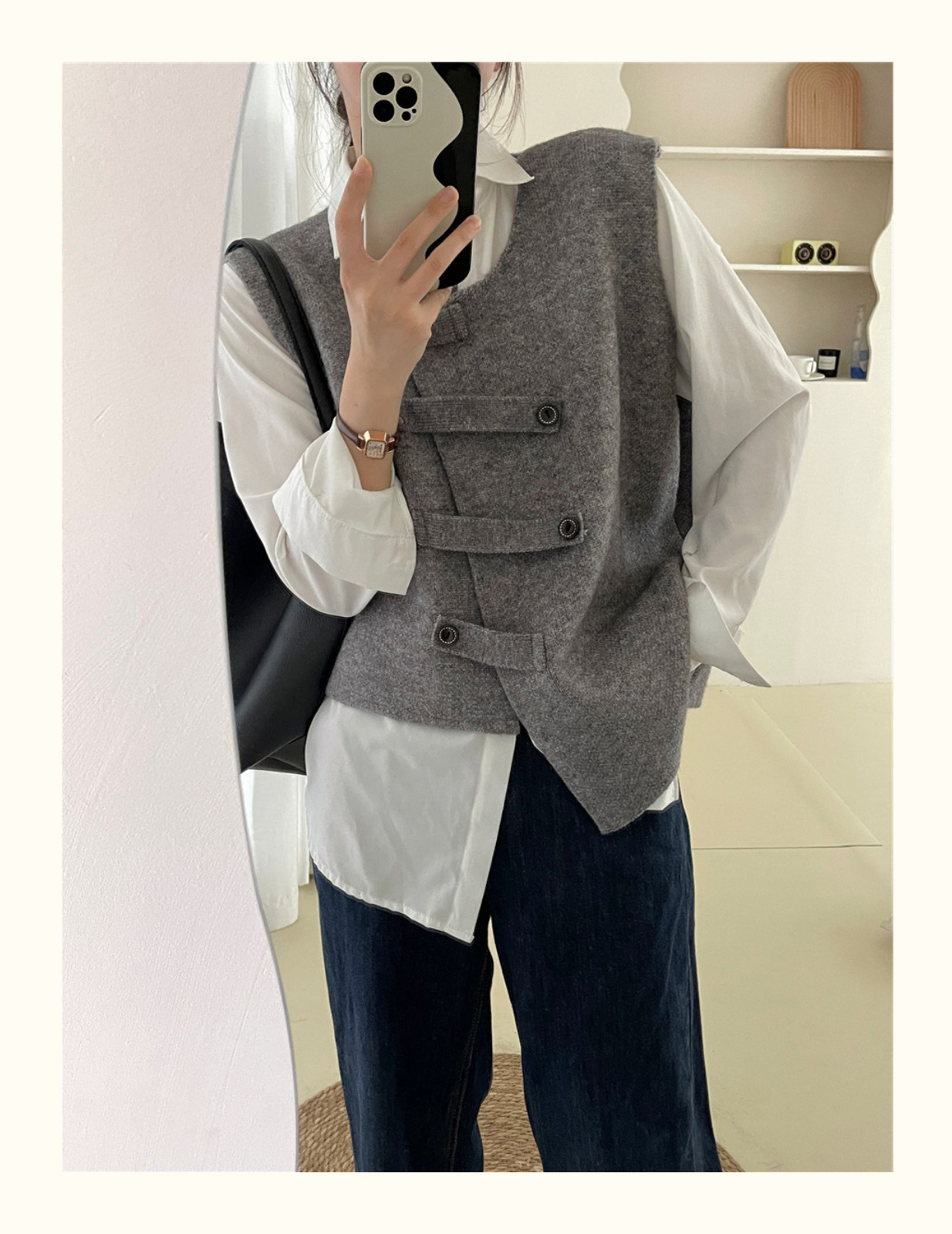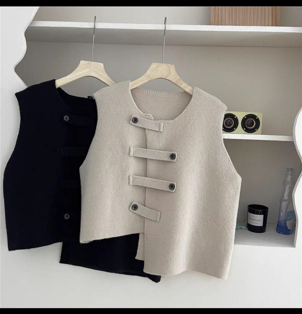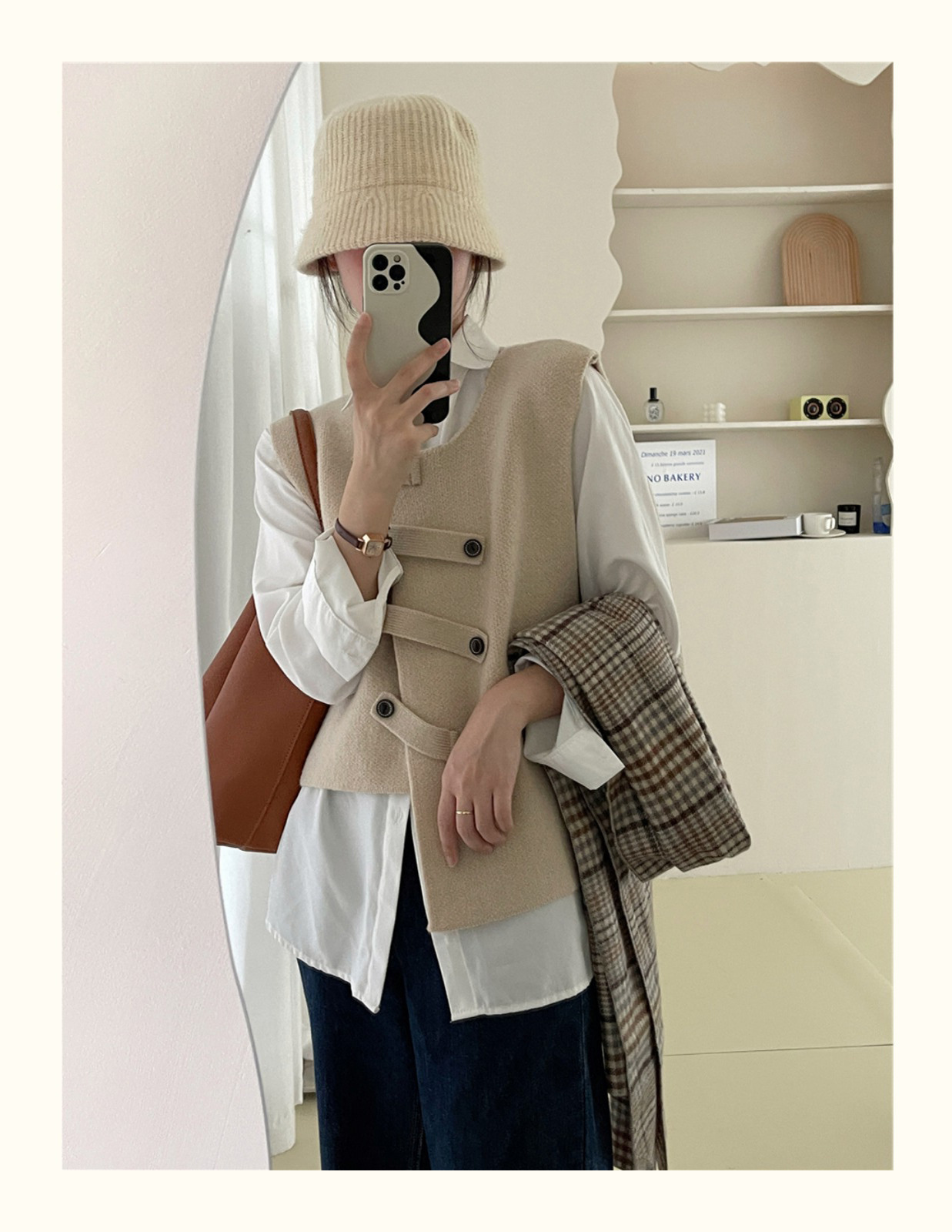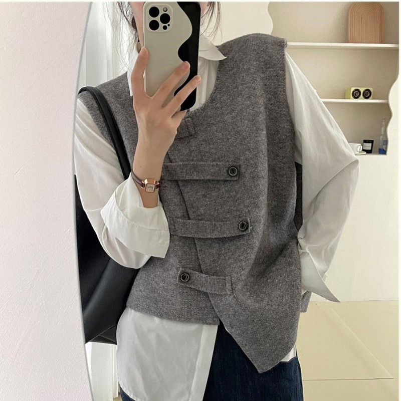 여성을위한 국경 간 니트 조끼 봄, 가을 새로운 스타일 예술적 스타일 겉옷 불규칙한 양복 조끼 더블 브레스트 조끼 카디건