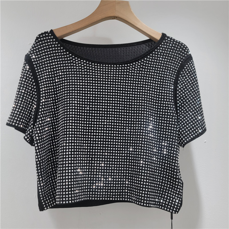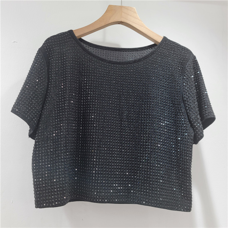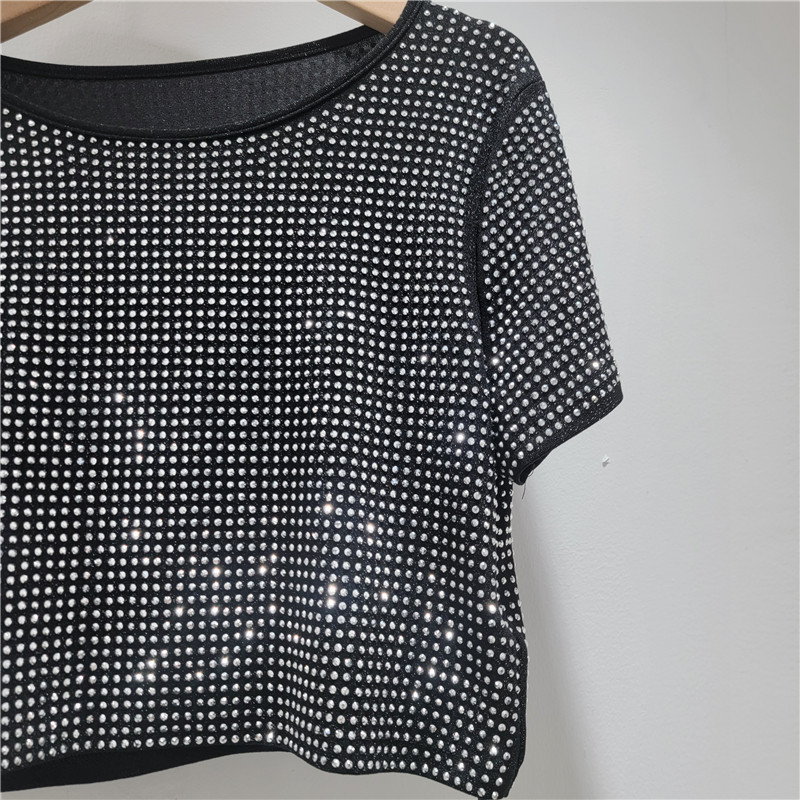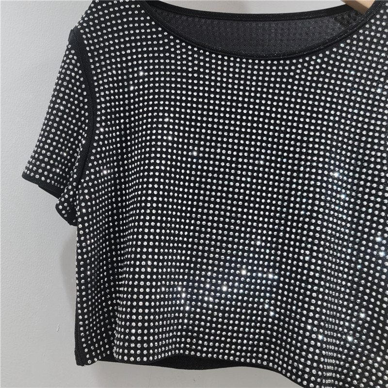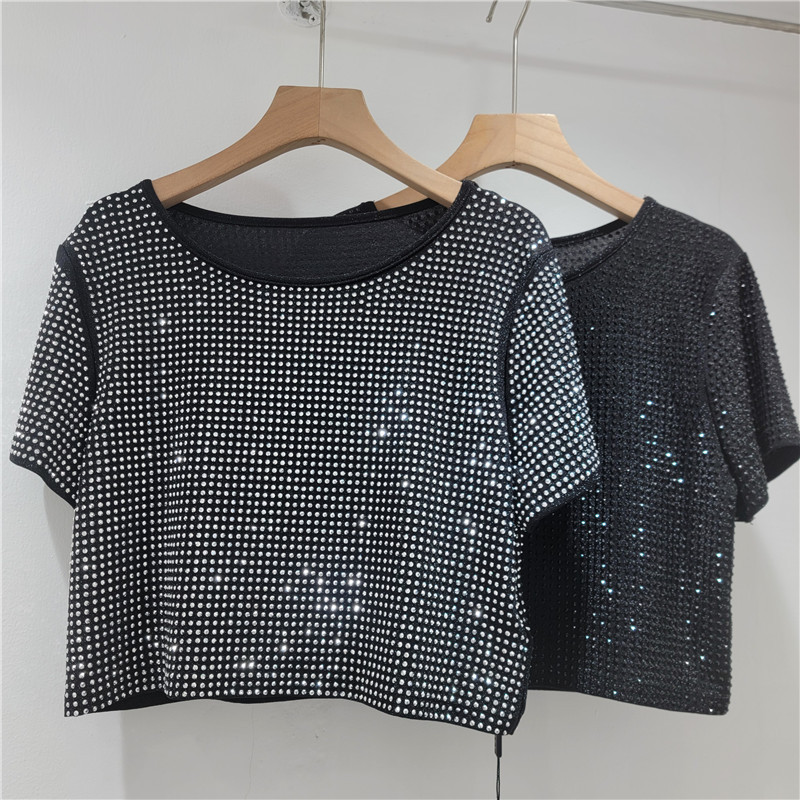 헤비듀티 핫 다이아몬드 디자인 라운드 넥 풀오버 짧은 하이 엔드 티셔츠 여성 여름 새로운 루즈하고 다재다능한 탑 트렌디