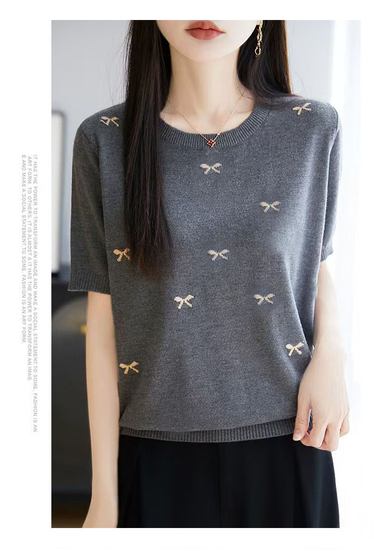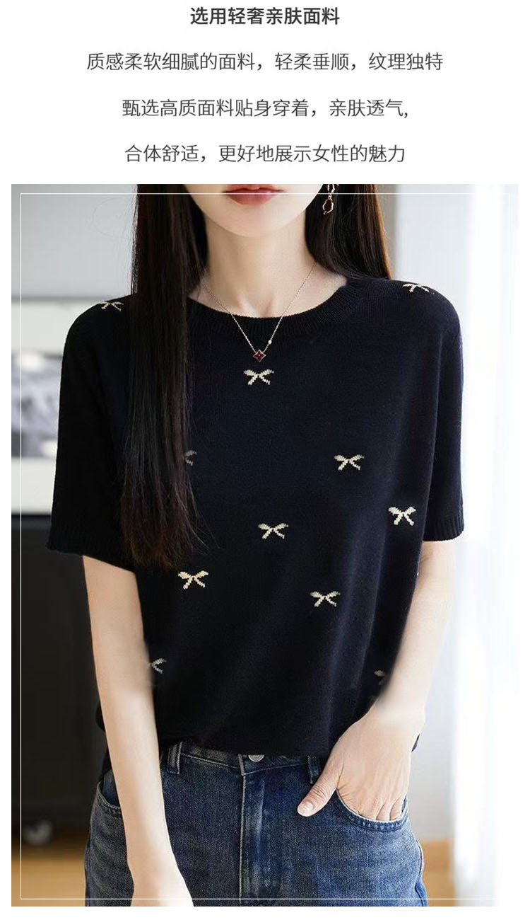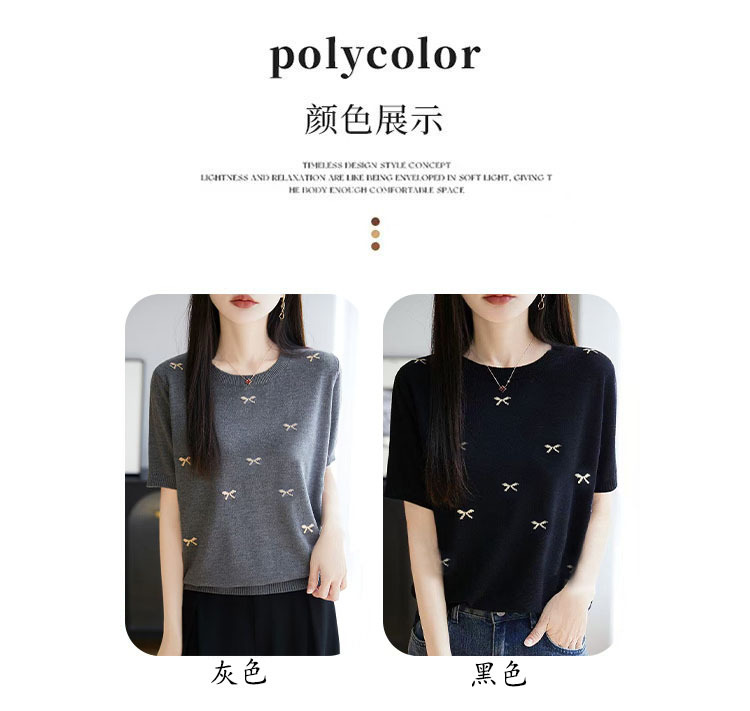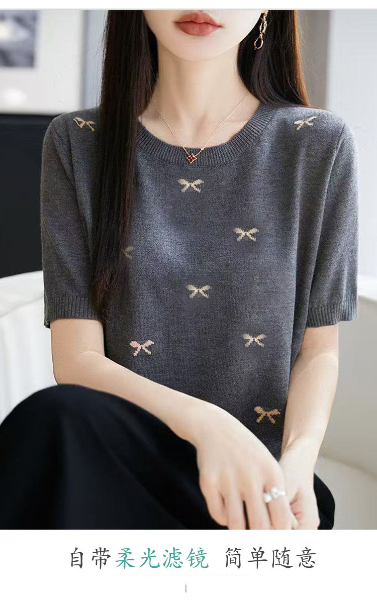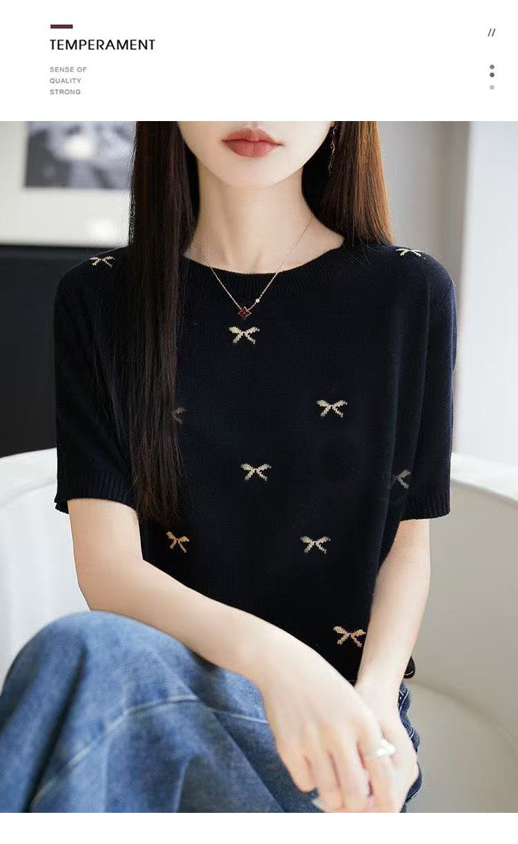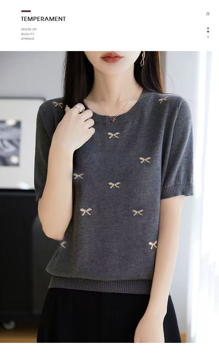 여성을 위한 새로운 라운드 넥 아이스 실크 반팔 티셔츠, 패셔너블하고 루즈하며 슬림한 여름 얇고 고급 니트 반팔 탑 트렌디스토어 가기