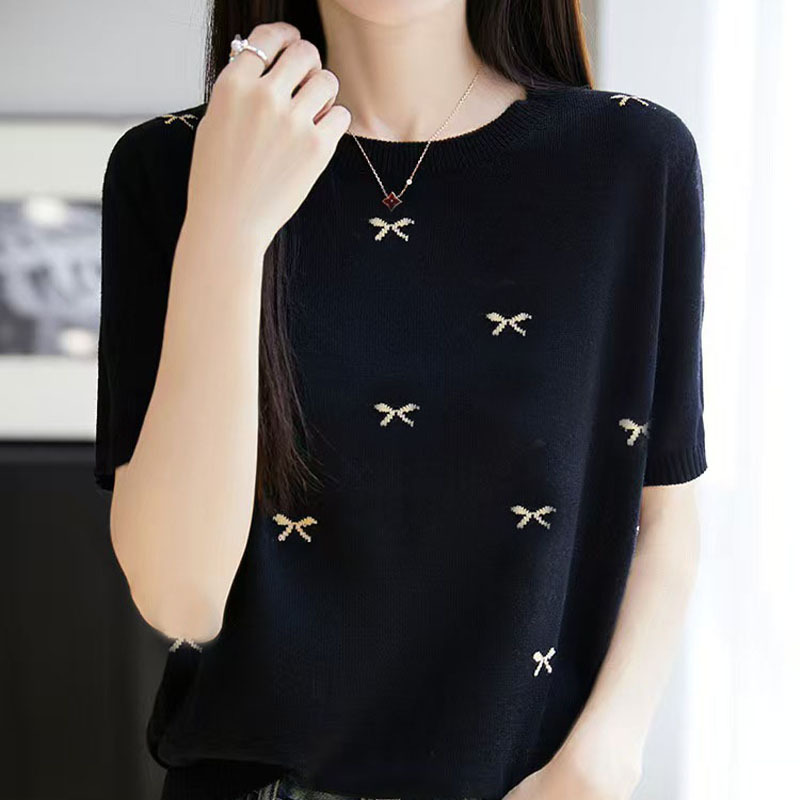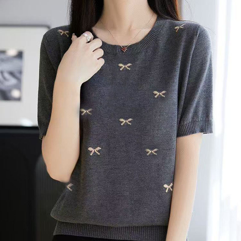 여성을 위한 새로운 라운드 넥 아이스 실크 반팔 티셔츠, 패셔너블하고 루즈하며 슬림한 여름 얇고 고급 니트 반팔 탑 트렌디