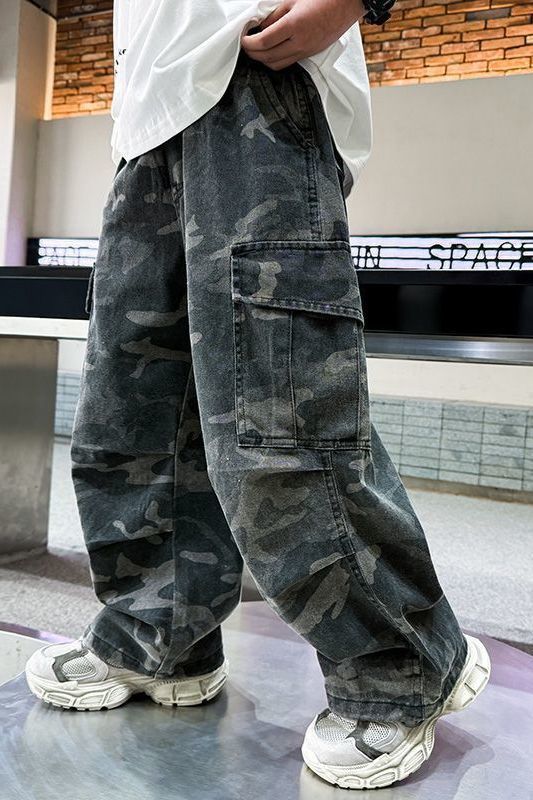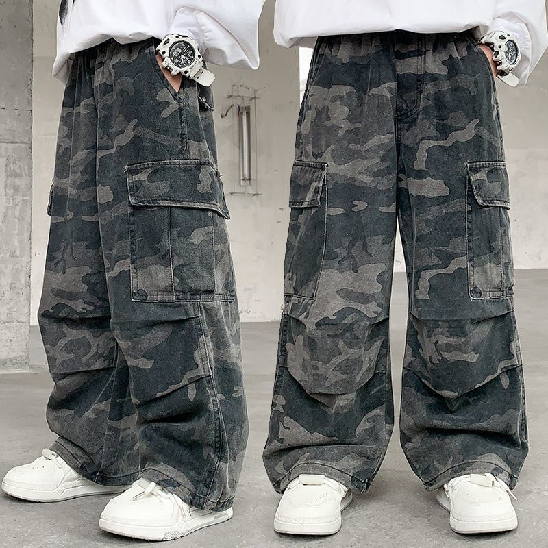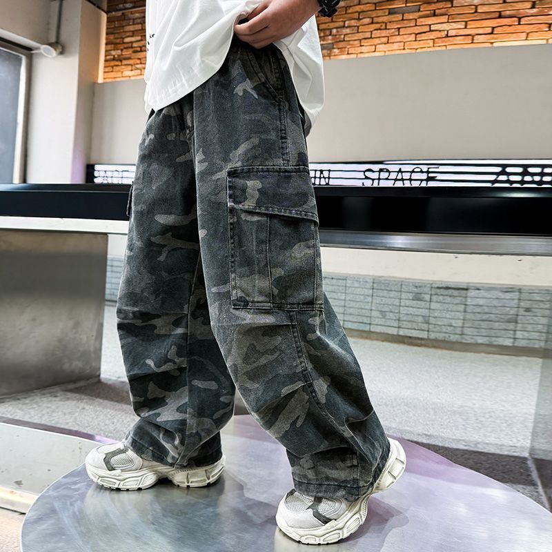 Tongsha 아동복 봄, 가을 소년 작업복 소년 세련되고 잘 생긴 와이드 팬츠 중대형 아동 캐주얼 위장 바지 유행