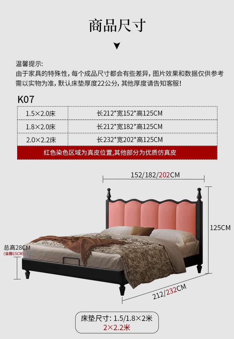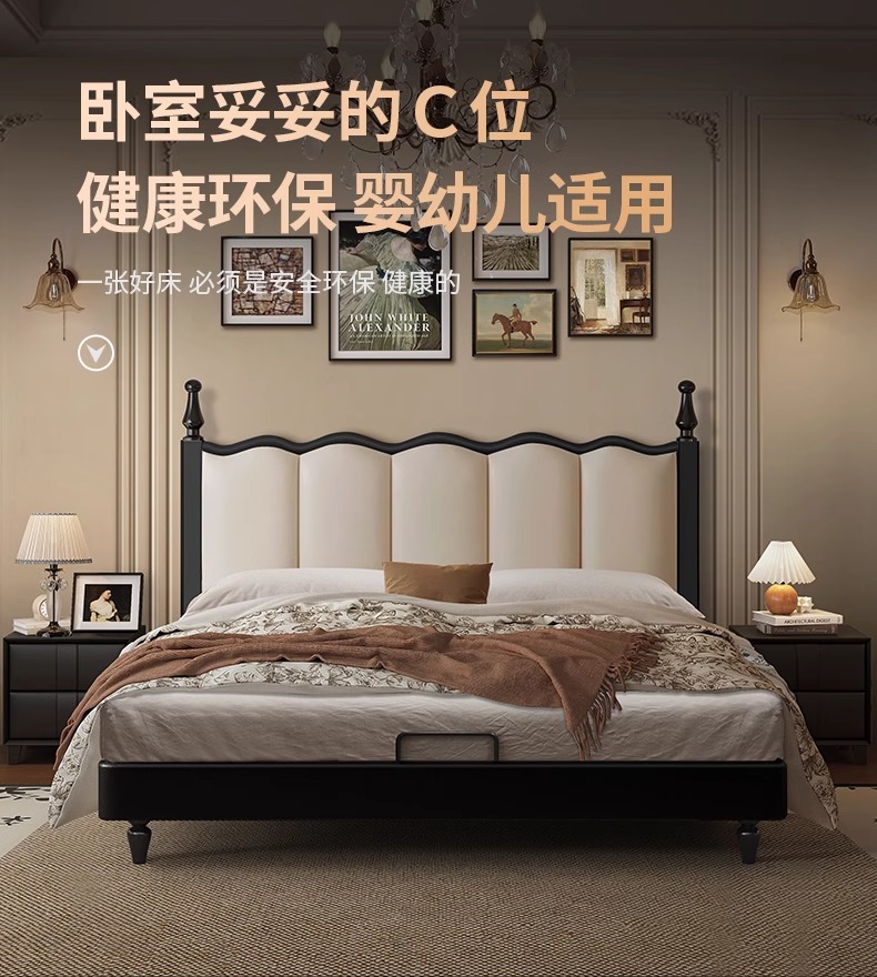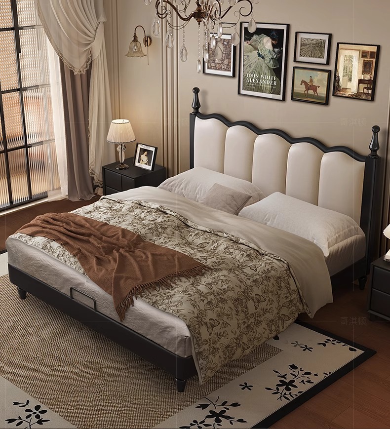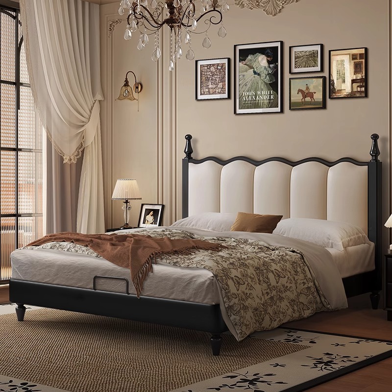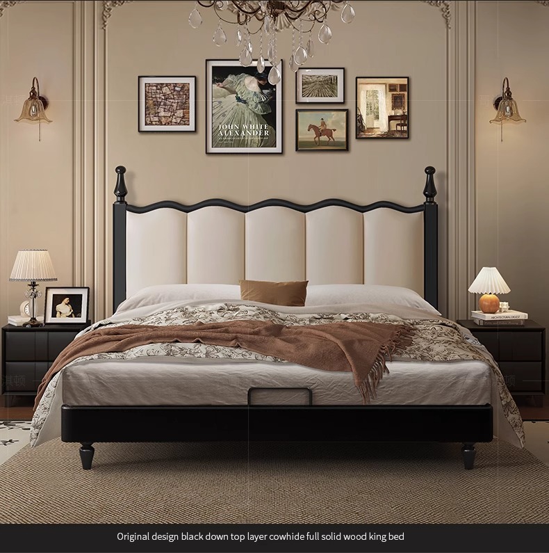 프렌치 레트로 원목 가죽 침대, 아메리칸 라이트 럭셔리 마스터 침실 대형 침대, 고급스럽고 분위기 있는 중세 스타일 더블 공주 웨딩 침대